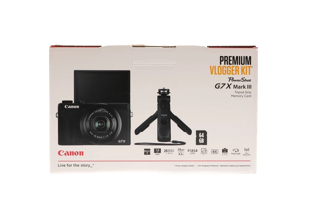 The Canon PowerShot G7 X Mark III Premium Vlogger Kit is built for vloggers, streamers, and content creators who want pocket-sized gear that delivers professional-looking video and photos. With a bright zoom lens, large 1.0-type sensor, 4K recording, and a dedicated tripod grip with wireless remote, this kit gives you a complete, creator-focused setup that is easy to carry, quick to set up, and ready for YouTube, TikTok, Instagram, and live streaming workflows. Key Features: 20.1 MP 1.0-type stacked sensor: Delivers clean, detailed images and video with attractive background blur, even in low light. Bright 24–100mm f/1.8–2.8 zoom lens: Covers vlog-friendly wide angle to flattering portraits with a fast aperture for smooth, shallow depth of field. 4K video and 120 fps Full HD: Records sharp 4K for high-quality content and high frame rate Full HD for smooth slow-motion sequences. Flip-up touchscreen for self-shooting: 180-degree tilting LCD makes it easy to frame selfies, talking-head videos, and overhead shots while monitoring yourself. Built-in 3.5 mm mic input: Lets you connect an external microphone for clearer, more professional audio on your vlogs and live streams. HG-100TBR tripod grip with remote: Provides a stable handheld grip or mini-tripod plus a detachable BR-E1 wireless remote for start/stop and control at a distance. 64 GB SD card included: Offers generous storage so you can record multiple vlogs, B-roll sessions, or a full day of travel without constantly changing cards. Fast DIGIC 8 processor: Enables responsive operation, quick autofocus, and high-speed burst shooting for capturing action and candid moments. Wi-Fi and Bluetooth connectivity: Pairs with your smartphone for easy sharing, remote control, and streamlined posting to social platforms. Live streaming and vertical video support: Designed for modern creators who want to stream directly and produce platform-ready vertical clips. Package Includes: Canon PowerShot G7 X Mark III camera (Black) Canon Tripod Grip HG-100TBR Canon BR-E1 Wireless Remote Control 64 GB SD memory card Battery Pack NB-13L Battery Charger CB-2LHE Wrist Strap WS-DC12 User manual kit Canon G7 X Mark III Premium Vlogger Kit is a compact yet highly capable content creation solution for creators who want to level up image quality, audio, and workflow in a single, ready-to-shoot package.