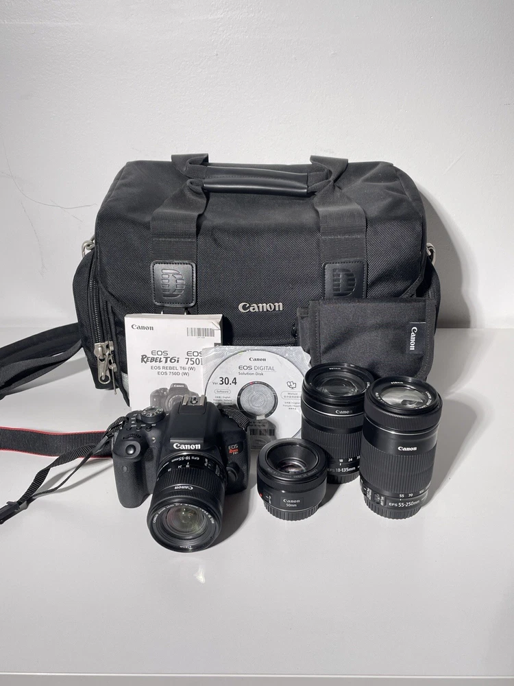 Canon T6i kit with four lenses, sturdy case, charger (not pictured) and instructions booklet. I purchased this new about two years ago and hardly used it (I mostly shoot analog). It has been very well maintained in a smoke free home. This kit would be great for any beginner, hobbiest or professional photographer! The lenses are; EF 50mm 1.8 (AMAZING lens.) EF-S 18-55mm 1:4-5.6 EF-S 18-135mm 1:3.5-5.6 EF-S 55-250 1:4-5.6 I have years of professional experience in camera sales, don’t hesitate to reach out with any questions. Willing to ship, let me know. Happy holidays! (PS - This model is listed on Amazon with only ONE lens for $799)