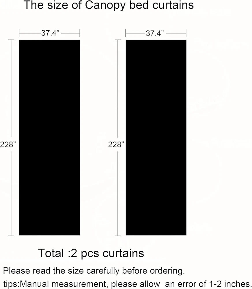 Package list: Sold as 2 Caopies Bed Curtains Panel(Not include bed frame/poles),you need to buy and make it yourself. Size detail:37.4" X 228" each curtain. This pink canopy scarf is suitable for all bed sizes.Pls check you bed or bed frame dimension before you buy.You could use for metal/wood bed frame , house bed,carrige bed.Put in baby nursery room,girls bedroom,boho/princess style room,etc. Polyester material: Elegant princess tones, quality texture, soft hand feeling.A good decoration for any ceremony party,wedding stage ,baby shower,kid‘s room,birthday, photo backdrop,outdoor events, Valentine’s Day, Thanksgiving Day, Christmas, New Year and more. Unique design: Use Simple bed curtain to simplify your home décor and get a sense of layering. You could cover it on your own bed frame, let it sway freely in the air to enhance more glamour and sophistication to your room.Or tie it to the poles to get different look of your bed. Care tips:Machine wash in cold water.Do not bleach.Do not iron.Hang to dry.If damaged,missing parts or other question,pls email us and we will reply you within 24h. Product Description Create a dramatic look with the canopies to the space You could add your own light or other decoration on this bed canopy curtains to enhance beauty in your room. It can hang on 4 post bed frame,canopy poles/rod. Multiple Size for you to choose: 37.4"x197", 37.4"x228", 37.4"x256". DIY the canopy scarf This is 2 sheer canopy panel.You could diy the hang way on your bed or diy for other occasions.You could diy as a birthday party background,wedding or other partys backdrop,window curtains scarf valance,etc.