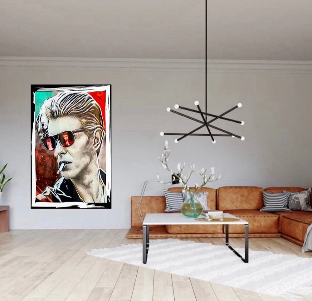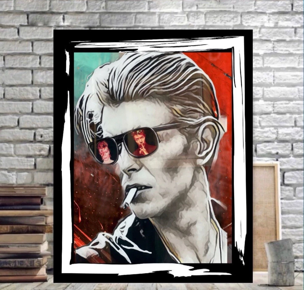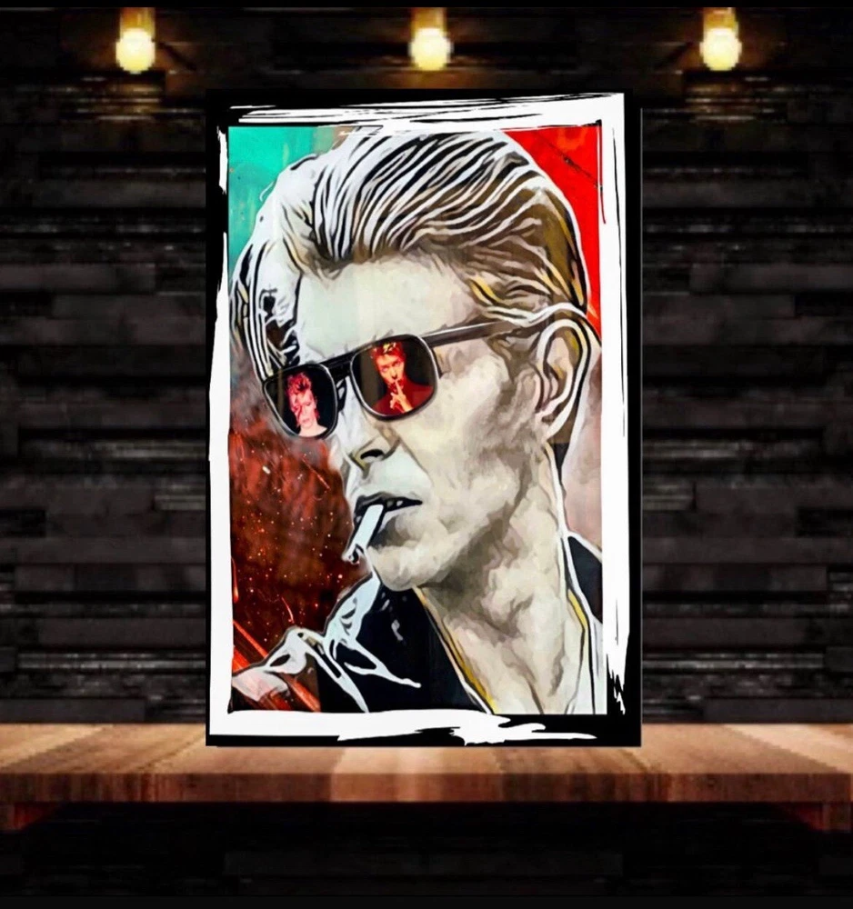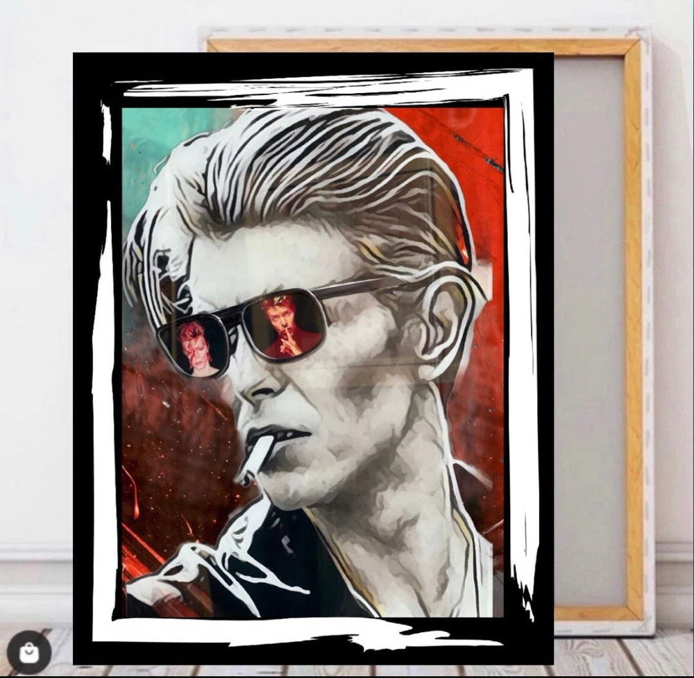 This is a medium-sized framed canvas print featuring a portrait of David Bowie. Produced in 2022 in the United Kingdom, it is a licensed reprint with vivid color options. It can be personalized with a photo provided by the customer. The artwork is wall hanging and comes size 50x80 cm and framing . Ideal for fans of David Bowie looking for unique and personalized wall art.