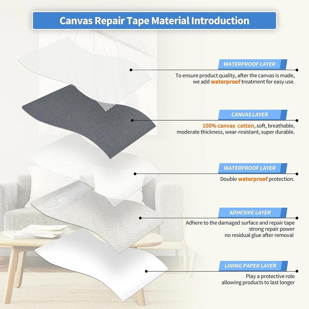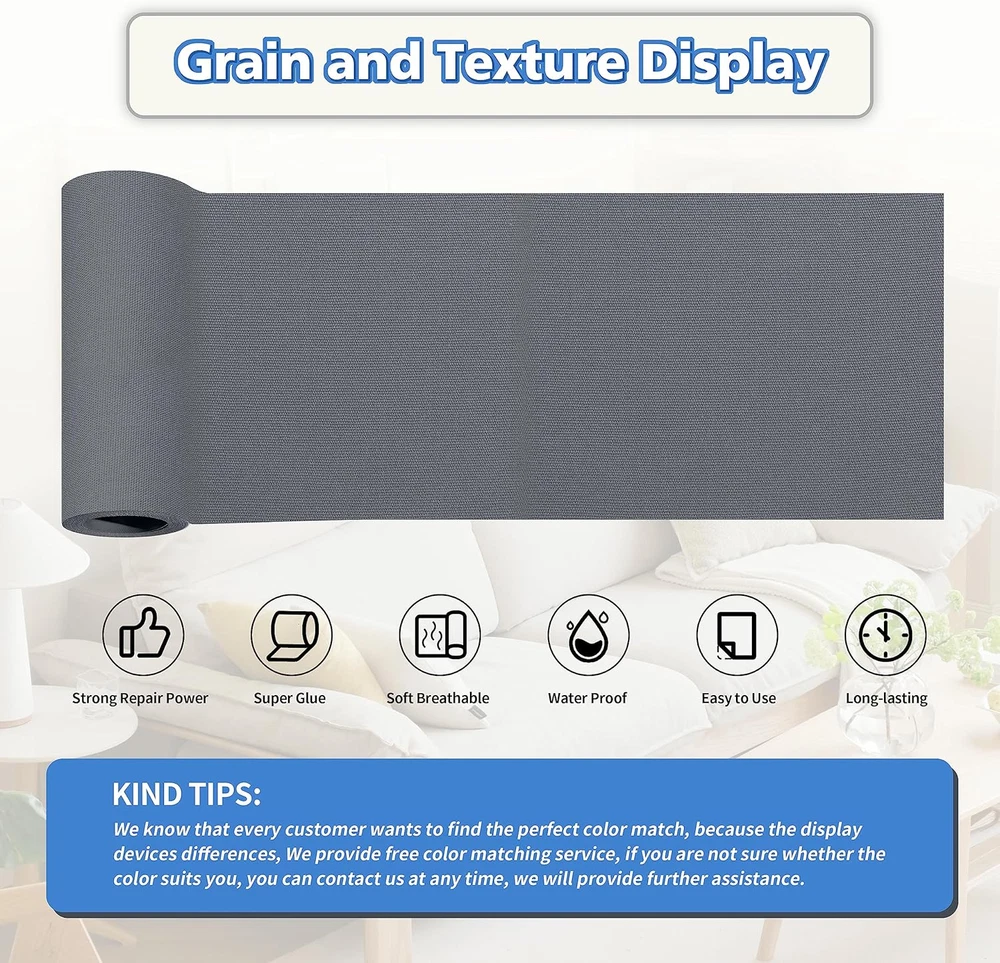 Store New Arrivals Add to Favorite View Feedback Contact Canvas Repair Tape,Outdoor Gear Patch, 4×63 Inches,Waterproof,Self-Adhesive for Repairing Boat Covers,Sun Shades,Sofas,Tents,Lounge Chairs,Awnings (Charcoal Grey) Description Item model number -11112 Unit Count 1.0 Count Compatible Material Fabric Color Charcoal Grey Material Canvas Item Weight 3.87 ounces Batteries required No Recommended Uses For Product Outdoor Size Canvas-"4x63 " Special Feature Waterproof Package Dimensions 4.33 x 2.09 x 2.05 inches Waterproof Cotton Canvas: The self-adhesive canvas outdoor repair tape is made of high-density canvas material that is wear-resistant and scratch-resistant. The fabric surface is coated with a waterproof layer, providing excellent resistance to water penetration, making it suitable for outdoor use. The patch has a thickness of 1.2mm, which is moderate and flexible, allowing it to blend well with outdoor equipment such as umbrellas and tents, and can last for an long period. Professional Repair Adhesive: The backing adhesive is made of fabric-specific adhesive, which is 20% more adhesive than other transparent repair tapes, ensuring stronger adhesion and reducing the chances of detachment. The smooth repair process and longer lifespan of the canvas patch allow for easy repair of damaged outdoor gear by simply peeling and sticking, providing a fast and efficient solution. Wide Applications: The canvas repair patch is suitable for repairing various outdoor gear, such as tents, sunshades, awnings, sails, sofas, and more. It can easily refurbish and repair scratches, holes, cracks, and other damages, eliminating the need to purchase new furniture or outdoor gear. The lightweight packaging allows for easy carrying and storage. Instructions for Use: Ensure cleanliness and dryness of the damaged area, then cut the patch to the appropriate size. Peel off the backing paper and apply the patch to the area that needs repair, completing the process. This quick and convenient method saves a significant amount of repair time and helps you solve your problems effortlessly. Better Customer Service: For every set of canvas repair kits sold, we offer full exchange or if you are unsatisfied with our products for any reason. Due to slight color variations caused by different screens and photo shooting, you may choose the wrong color. We display our full range of color options on the detailed information page to assist you in making a better choice. If you're still unsure, please don't hesitate to for assistance. Product Description KING MOUNTAIN CANVAS REPAIR PATCH Best Solution for Canvas Repair KING MOUNTAIN Canvas Repair Patch Product Introduction Canvas Repair Patch, specially made for canvas material items damage, tear, holes, burns, fading, peeling, pet scratches and other damage repair, easy to operate, so that your canvas items look new, can be used on sofas, recliners, outdoor supplies, tents, sunshade and other canvas products, no additional use of glue, simple operation, easy to use, rapid repair, is the best choice for your canvas repair needs. Product Features Pure Cotton Canvas The canvas is made of pure cotton, wear-resisting, soft, breathable, no peculiar smell, the surface of the canvas is coated with a water proof layer, which can achieve waterproof result. Strong Glue The glue is the most important part, So we choose good self-adhesive, 20 percent more than the conventional product glue content.And which has stronger repair power. Rich Colors In order to meet more color needs, we provide a variety of color options. Designed to Repair Textile Fabrics Canvas Repair Patch can be a good repair for such as cotton, linen, flannel and other material, adhesive stability,suitable for uneven or curved surface,long-term use, do not fall off, no warped edge. Simple and Fast Repairing Power Customer Genuine Feedback Wide Applications What to do when I can't decide on the best color for me? We offer a free color matching service. Just take a picture of the sofa you need to repair and send it to us. We will pick and recommend the best color for you. Is this flexible enough to stick over curved surface? Yes. It will work well on uneven surface as well, like the top of our chair is curved and it works fine, and it also covers the arm of the chair with no problems at all. Please enjoy. Thanks again. Does the glue fall off easily? Our glue is a special glue for Canvas repair, it is very strong after application, please feel free to enjoy it. Is the Canvas surface waterproof, sweat resistant, breathable,easy to clean? It is wear-resistant, waterproof, breathable,you only need to wipe the surface gently with a wet cloth. It is very easy to clean, and there will be no color loss or fading. What is thickness of the sheet? This product is ultra-thin, with thickness of 0.6 mm only. ABOUT US We offer the best prices around on high quality products. Our E-store includes media such as books, movies, music and games while offering electronics, toys, sporting apparel, clothing, tools, general home, garden items and more. SHIPPING We are always working hard to ensure your package arrives as soon as possible. Please understand that some factors like weather, high postal traffic, and the performance of shipping companies are outside of our control. We offer free shipping to the lower 48 states and ship within 2 business days of payment, usually sooner. We do not accept P.O. Boxes. Please provide a physical address. For shipping outside of the continental USA, we only use eBay's Global Shipping Program.The item is shipped to KY and then sent to the rest of the world. International customers are responsible for all duties and taxes. Continue to check out in order to calculate costs for shipping the item to your country. Messages regarding eBay's Global Shipping Program MUST be directed at eBay EXCLUSIVELY. RETURNS We offer a 30-Day Return Policy on items which you are not completely satisfied with. You have the optio