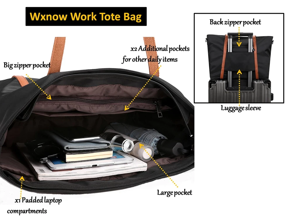 Multi-function Tote Bag-This work tote bag Is crafted from lightweight & water resistant Nylon, with a wide shoulder strap you can wear without creating discomfort on your shoulder. You can use it as handbags, teacher bag, school bag, leisure bag, travel bag, fitness bag and so on.It can every item is very orderly and convenient to access,just need a bag to hold your daily necessities,electronics,cosmetics,office supplies,and ease your hands.Fashion and Casual design:This tote is a perfect gift for full-time moms, teacher, nurse, college students. Excellent for shopping,traveling,working, cafes, school. Also great as a diaper bag. Easy Clean Waterproof 1680D Oxford Nylon: Strength but Lighter weight, top zipper closure,wear-resistant and anti-wrinkle. Multiple Pockets Easy Organization: Separate storage space can hold your things orderly. 1 padded compartment fits up to 15.6 inches(included 13/14 inch) laptop; 1 large main compartment for A4 magazines, iPad, books, umbrella, lunch box and more. 1 zippered pocket for wallet, business cards, or some other valuable items. 2 open pockets for cell phone, glasses, and mouse. Size: Laptop Tote Bag is 15.35 inch L x 7.08 inch W x 12.20 inch H. Spacious Fashion Laptop Bag designed specifically for women, can accommodate 15.6 inch laptops, including all sizes of tablet,soft and thick protective compartment Prevents accidental damage to the laptop. Versatile Purse: One bag to free your hands to hold your laptop other essentials. 3 ways to use - tote bag, handbag and crossbody bag, on the shoulder with the comfortable fully detachable wide cross-body strap which remains chic through any occasion. Stylish Tote Handbag: Handle drop is 11.4 inch , help you for a comfier carry. Lightweight and pliable. You can take it anywhere, which is more suitable for work,,cafes,shopping, party,travel and other occasions. Great Gift for a Teacher, Nurse, College.