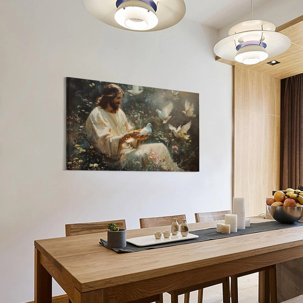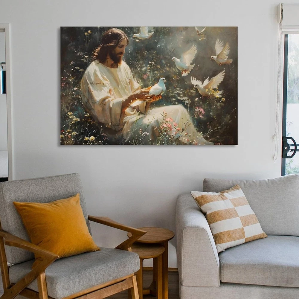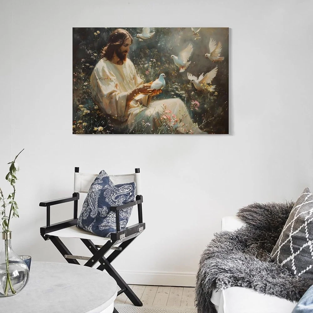 Canvas Wall Art Jesus Among Flowers Saving White Dove Religious Painting Christ