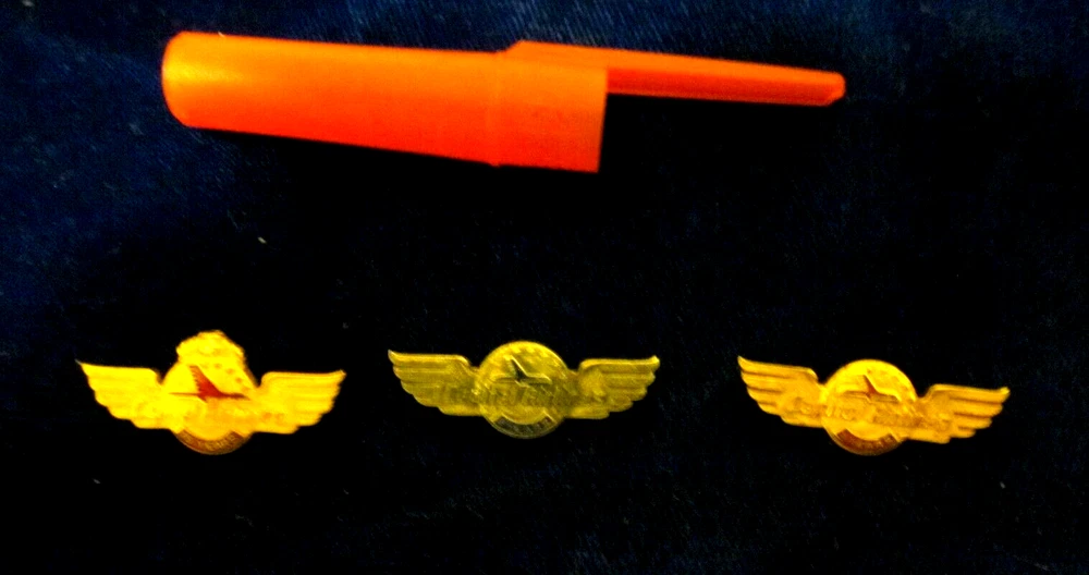 3 vintage pins for 1 price. scarce vintage employee service award pins. especially tough is the 15 yr pin. small wing (5 years w red enamel, approx 2.19 grams marked 10k on back, cto o c tanner mfr, Hinged swing pin with whale tail clasp) small wing (15 years years w clear stone and red enamel, approx 2.78 grams marked 10k on back, lgb balfour mfr, Hinged swing pin with whale tail clasp) that is almost 5 grams of 10k gold for the above 2 pins, then add in the sterling for the below pin,. 3 pins for one price. small wing (2 years w blue enamel, approx 2.14 grams marked sterling on back, lgb balfour mfr, Hinged swing pin with whale tail clasp) Capital Airlines was originally known as Pennsylvania Airlines in 1931 and was run by Clifford Ball. Pennsylvania Airlines merged with Central Airlines on November 1, 1936, to become Pennsylvania Central Airlines . On April 21, 1948, Pennsylvania Central Airlines changed its name to Capital Airlines. Capital merged with United Airlines in 1961. Condition as shown in the photos. sorry i am not great at photography, best i could do. this is a vintage item for collectors. I only ship to address provided by ebay, sorry no exceptions. United States sales and shipment only, I appreciate your understanding. in the 197 0's inflation soared and stock and bond prices collapsed. however during that same decade quality collectibles soared in value. are we about to see a repeat of that decade? Here is your chance to diversify into something tangible. regardless what happens in the financial markets at least with items like in this auction you have something fun to own that also has historical significance. i am loading over the next 10 or so days, some rare aircraft, air line, airline and airlines pins, wings, badges, pilot hats, caps, etc. about 50 or so items in diff auctions. keep watching my other auctions for early pan am, Paa, grace / panagra, mohawk, western air lines, delta, chicago and southern, delta c & s, boeing, pennsylvania central airline, pca, northeast airlines, twa, united, southern airlines, american airlines, eastern airlines, southwest airways!!! mega tough item, and many more.