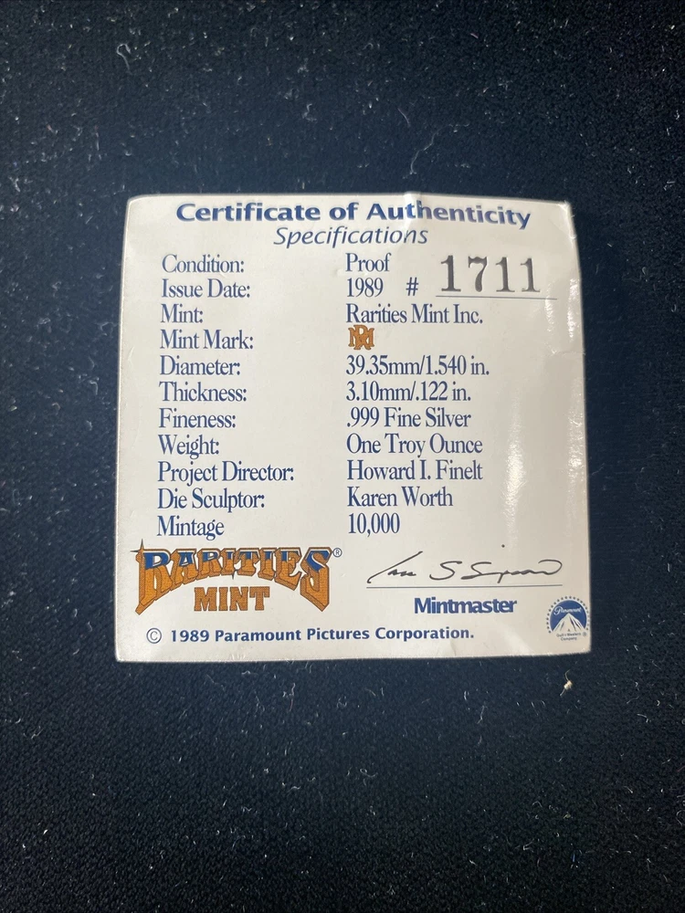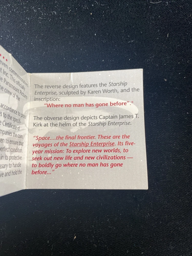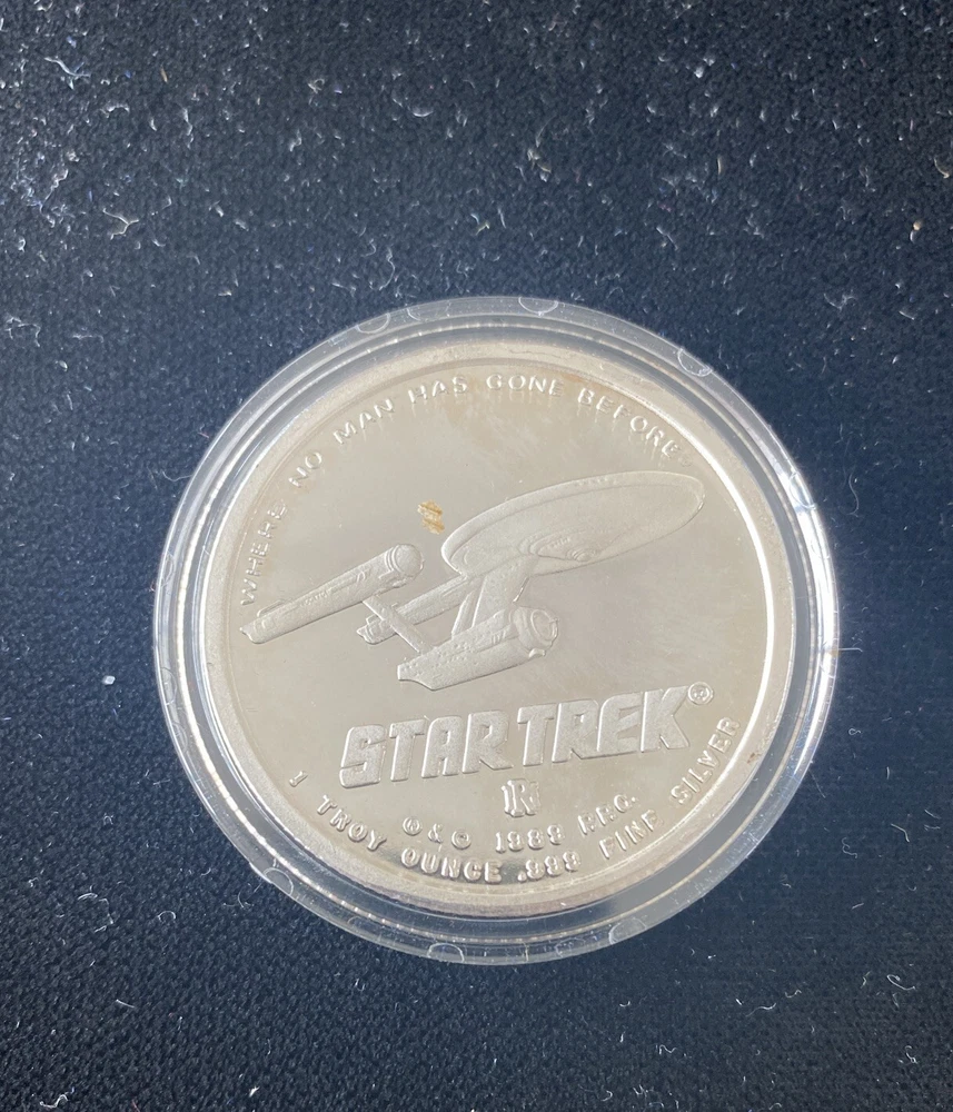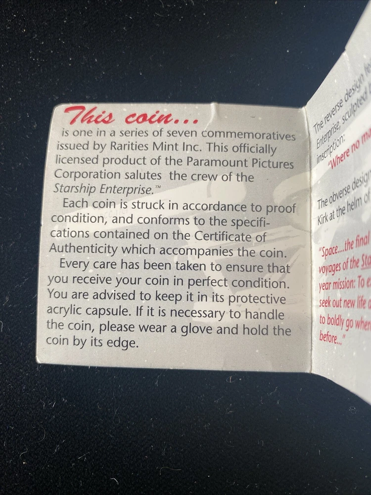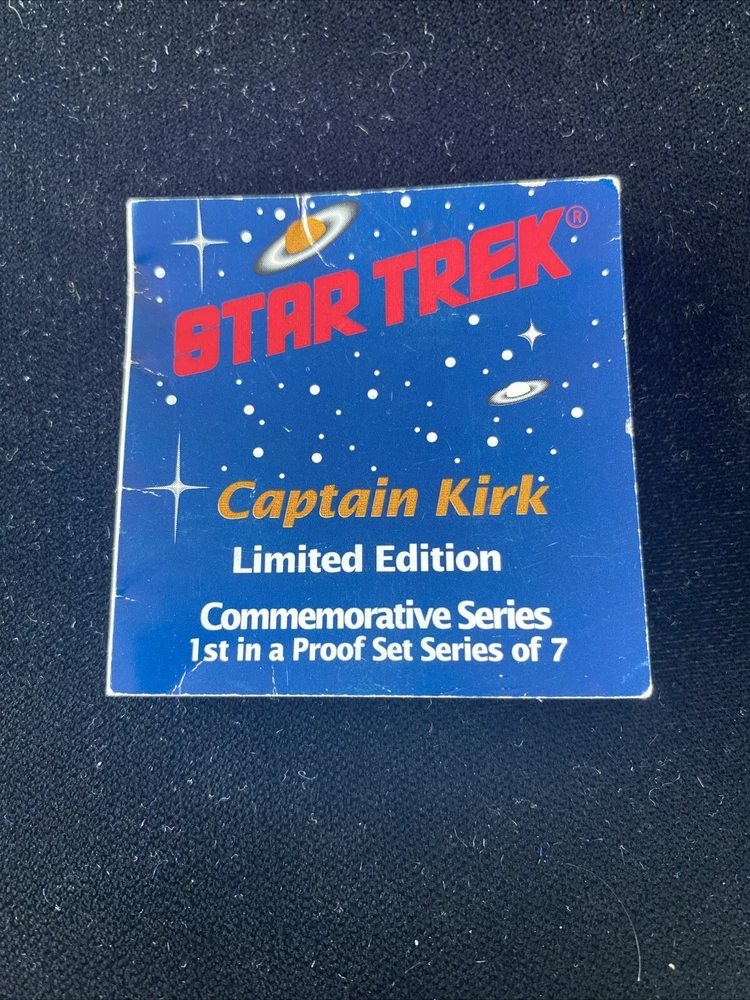 This commemorative proof coin featuring Captain Kirk from the 1989 Star Trek franchise is a must-have for any science fiction and horror collector. Made from .999 fine silver, this coin is a rare find with a COA included. The coin's intricate design and high-quality materials make it a valuable addition to any collection. The coin is produced by Rarities Mint Inc. and features the iconic character Captain Kirk. It is a perfect gift for any Star Trek fan or collector. Add this unique piece to your collection today and show off your love for science fiction and horror.
