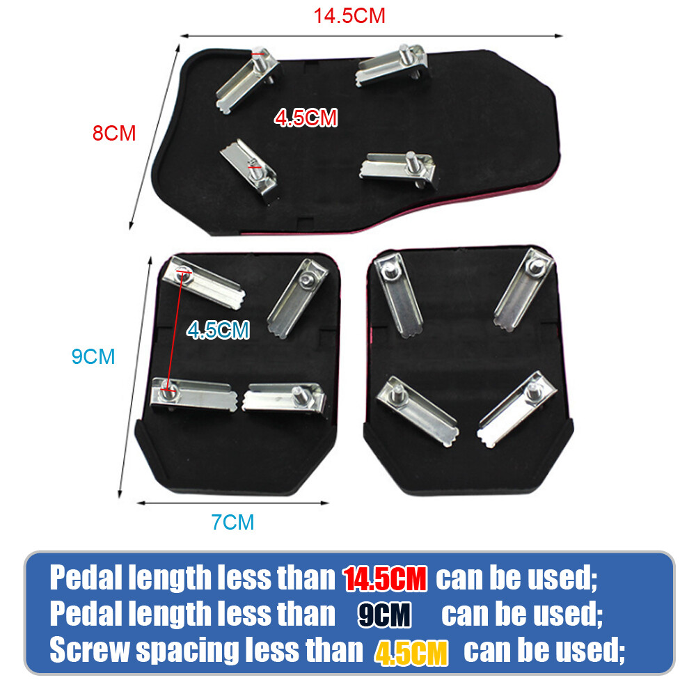 Car Accessories Non-slip Foot Pedal Manual Brake Pedal Pad Cover Kit Universal Features: This is a set of 3 non-slip pedal car Brake Pads. Very nice, high quality aluminium sport pedal 100% brand new Brake Tools For manual pedal cars Special non-slip designed surface. Safe for driving and reduce foot fatigue. Best Brake Pads decoration for your car! Color:Red Size: Accelerator Pedal: 80mm*151mm*50mm Brake and Clutch Pedal:66mm*87mm*48mm Fitment: Fit for most of the car brands and models. Packing Included: 1 x Brake Pedal 1 x Accelerator Pedal 1 x Clutch Pedal 1 x Set of Screws Accessories Note: 1.We provide clear pictures, measurements where possible. Please check as much as possible to make sure the item is the one that you need. 2. Please allow 0.5-1 inch difference due to manual measurement.(1inch=2.54cm) 3.There Are No Instructions Included In This Kit.Professional Installation Is Highly Recommended! 4.The color of the actual items may slightly different from the listing images due to different computer screen, thanks for your understanding. Payment Delivery details Terms of sales About us Contact us Payment - We accept the payment through Paypal only. - Payment must be fulfilled within 7 days after the end of auction. - Please make sure your paypal and ebay address is correct. Or not, please correct it before payment. - Echecks through PayPal need about 5-7 business days to get cleared. We will ship after notification from PayPal on echeck clearance. - If you are a big customer, Please contact with us about the item's PRICE and SHIPPING. - Your feedback & suggestion is deeply appreciated, thanks. Delivery details 1. Please make sure your address in ebay is correct. 2. We will only follow your address listed in the ebay orders for the shipment. 3. Import duties, taxes and charges are not included in the item price or shipping charges. These charges are the buyer's responsibility. Terms of sales 1.You have 7 days to contact us and 30 days to return it from the date it was received. If this item is in your possession more than 7 days,it is considered used and WE WILL NOT ISSUE YOU A REFUND OR REPLACEMENT. There are NO EXCEPTIONS! 2. All returned items MUST BE in the original packaging and you MUST PROVIDE us with the shipping tracking number, specific reason for the return, and your eBay ID. 3. We will refund YOUR FULL WINNING BID AMOUNT, upon receipt of the item in its original condition and packaging with all components and accessories included,AFTER BOTH Buyer and Seller cancel the transaction from eBay. OR, you may choose to have a replacement. 4. Return shipping is to be paid by the Buyer. About us High quality product quality is our aim. Satisfying you is our happiest job. Therefore, we will try our best to provide you with the best products and services according to your requirements and deliver them on time. If we do not make enough improvements or need improvement, please send us an email suggestion. If you like our products and services, please provide us with positive feedback in advance so that we have more confidence and more opportunities to serve more client. Contact us 1. We greatly appreciate your POSITIVE feedback. 2. Negative or Neutral feedback does not resolve any underlying issues that you may be experiencing as a buyer. 3. Any question or unsatisfaction please contact us with ebay message, we will sincerely solve for you. Our Working Time is (GMT+8): 8:00AM -- 5:00PM (Monday to Friday)