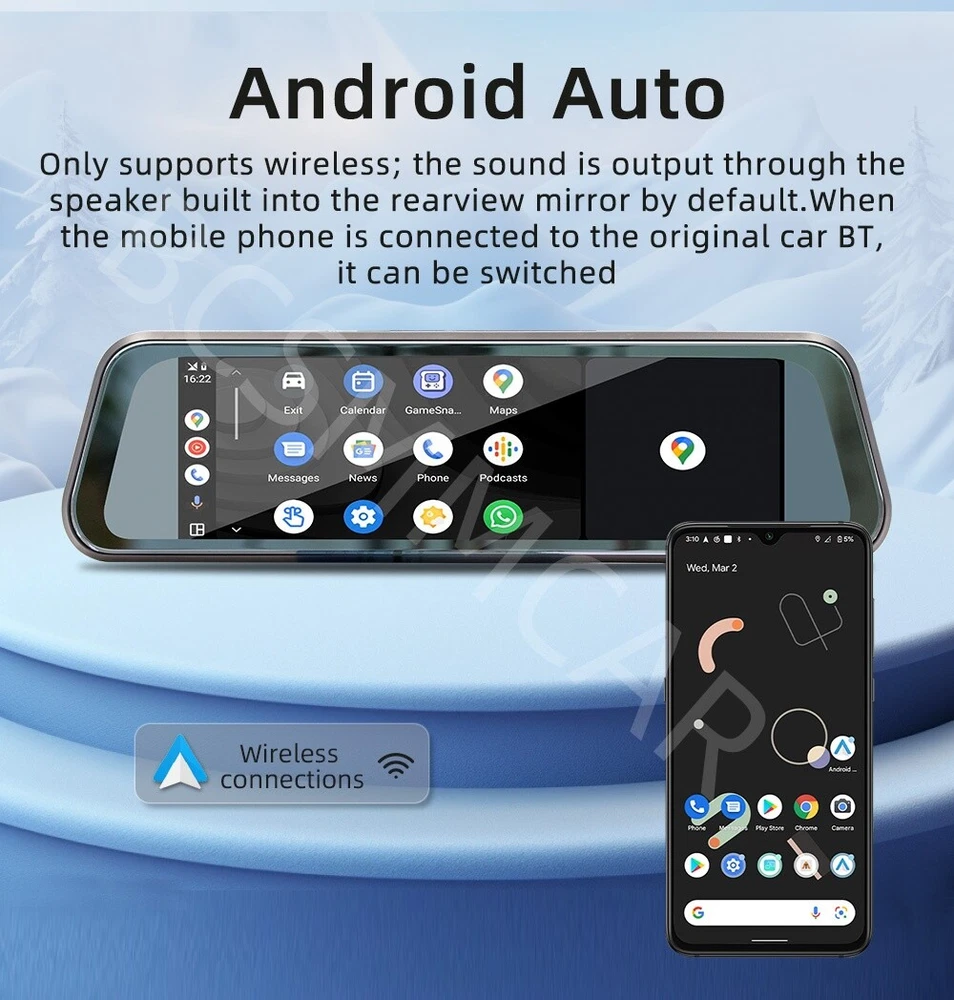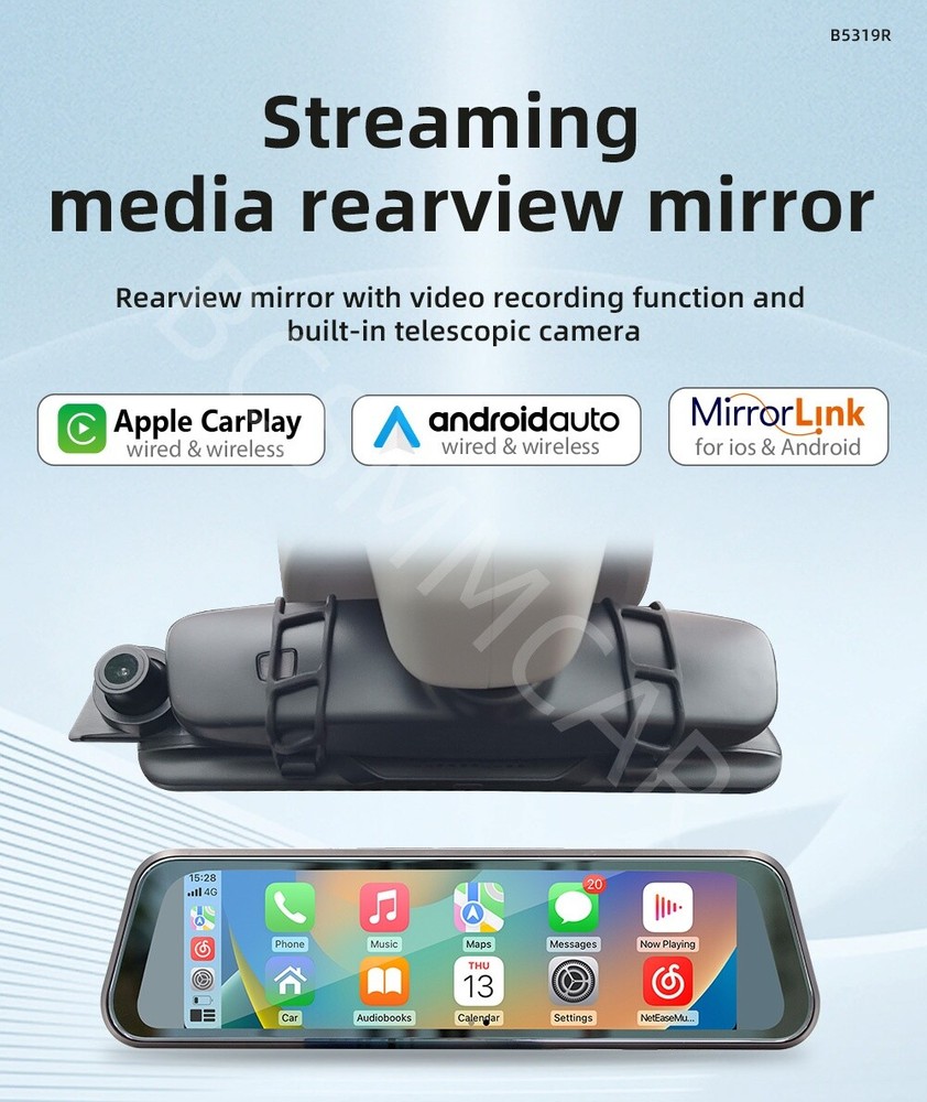 Country/Region of Manufacture: China Brand: BCSMMCAR gtin13: 945121312963 Type: Rearview mirror recorder (streaming media) Built-in speaker: Support Universal Fitment: No Performance Part: Yes Reversing image: Support( Not included Rear camera ) Mobile phone interconnection: Wireless Android AUTO; Wireless Apple CarPlay Audio output: Support OE/OEM Part Number: Universal Manufacturer Part Number: LMTKL-19R Recorder resolution: 720P Manufacturer Warranty: 1 Year Driving recorder: Support (built-in) Bluetooth version: 5.0 version Screen size: 9.36 inches 2.5D rearview mirror touch screen UPC: 945121312963