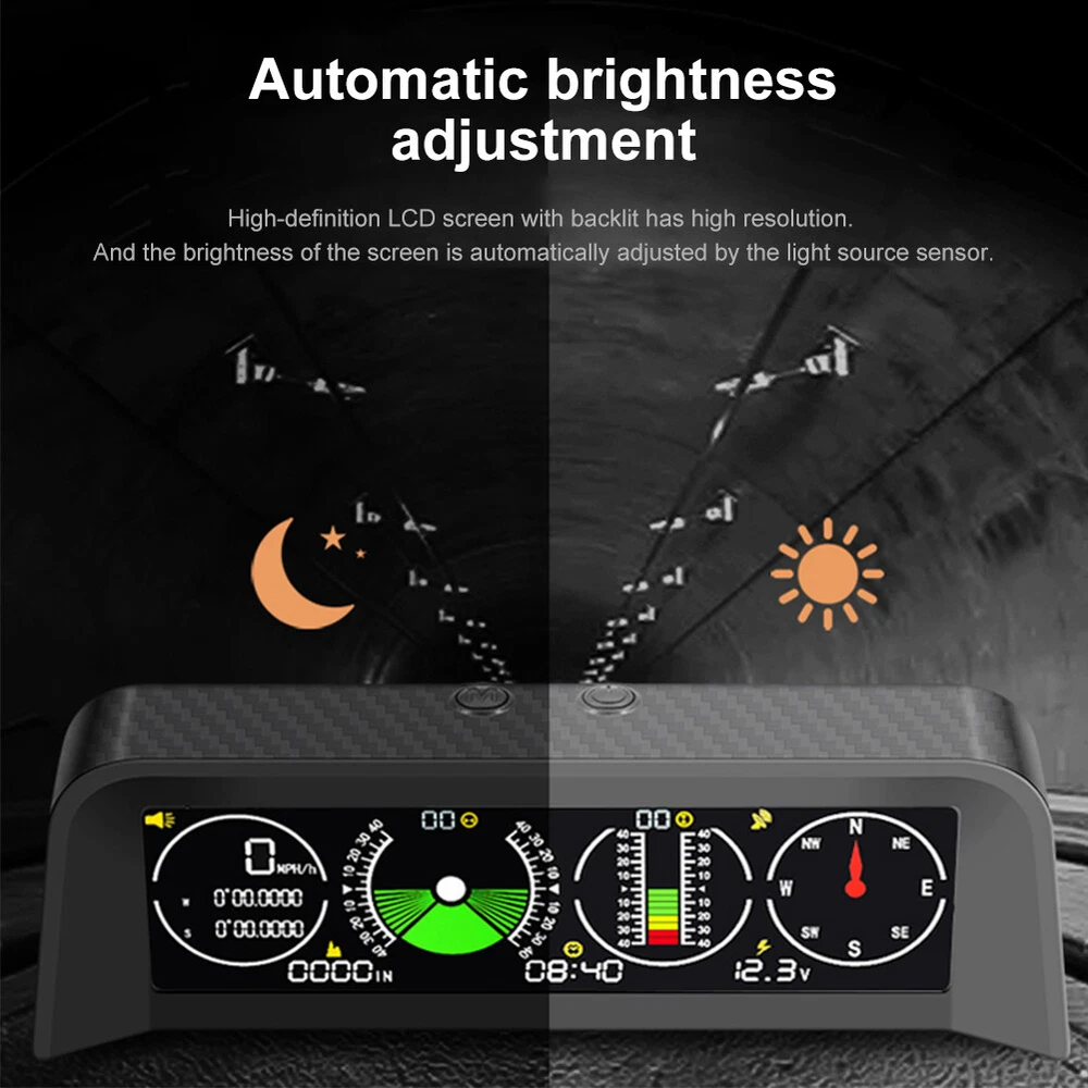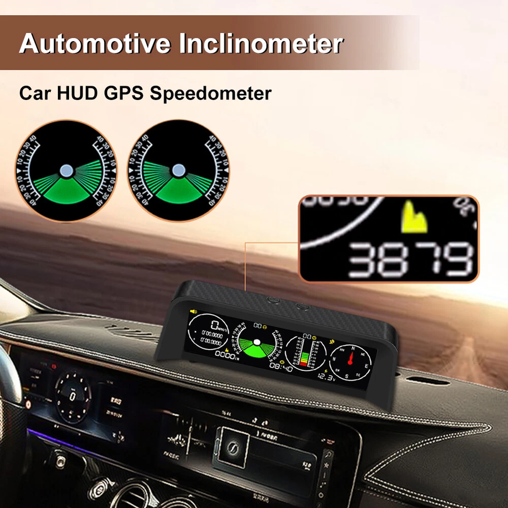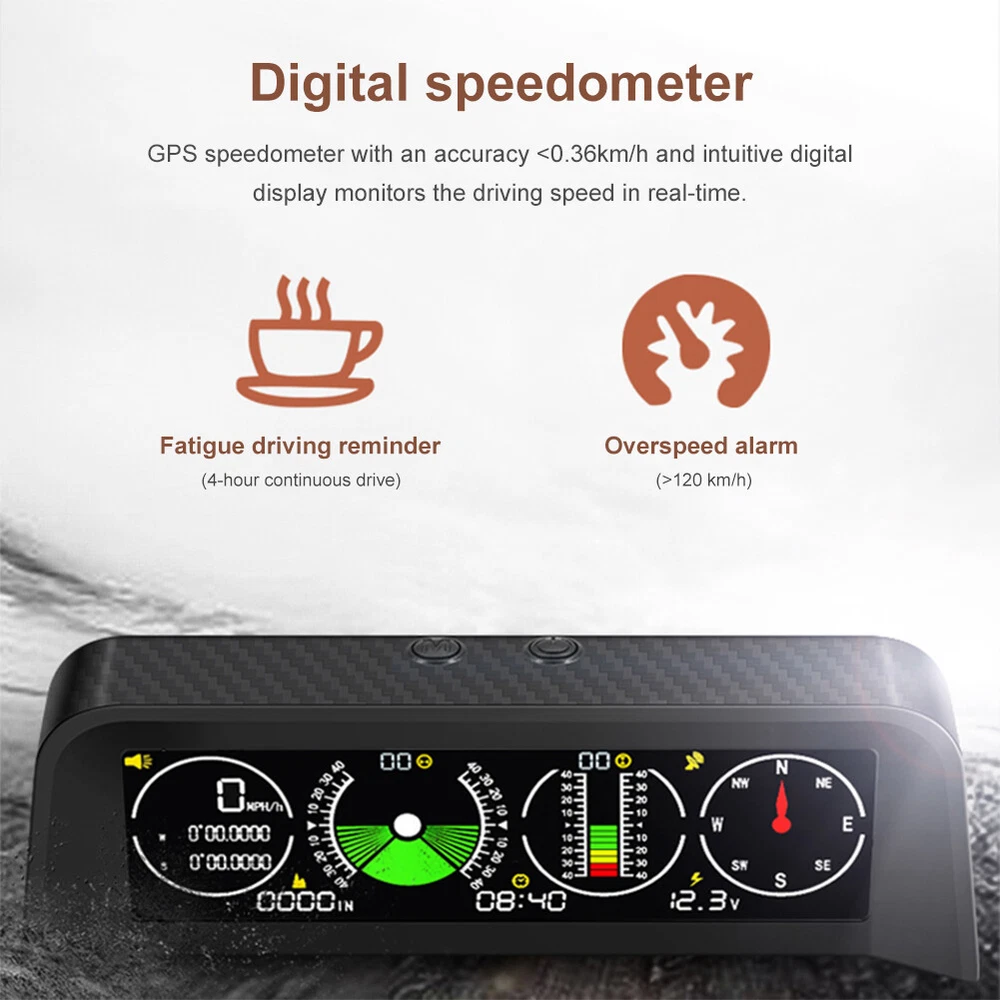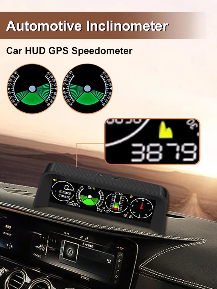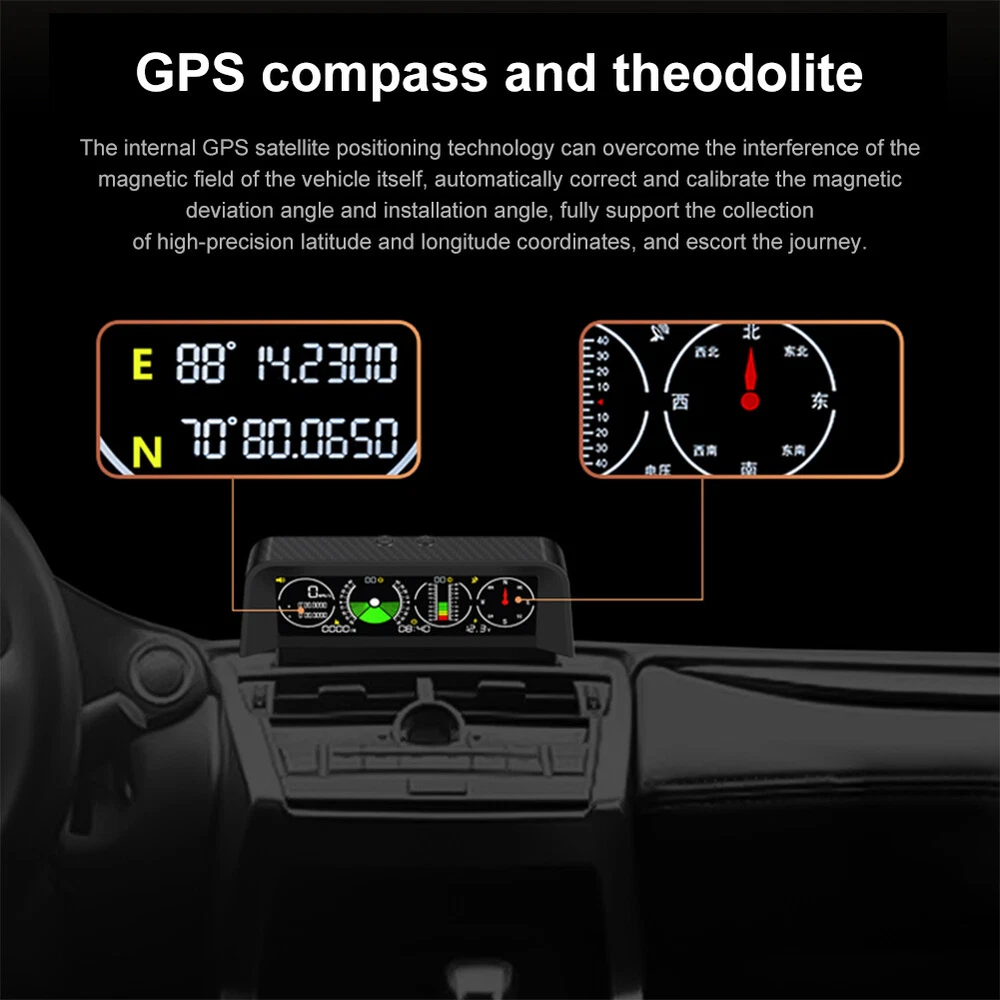 Features: *1. Multifunction - Intelligent GPS multi-function HUD speedometer supports high-precision monitoring of vehicle speed, vehicle pitch angle, vehicle roll angle, compass, time, and vehicle battery voltage status, ensuring your driving safety. *2. 3-in-1 Alarm System - Accurately displays the pitch and roll angle changes of the vehicle and sends a clear notification. When one or both angles exceed 40 degrees, negative or positive, the alarm will sound. Also cover the Overspeed and Fatigue Driving reminders. *3. High-definition LCD Display - Adopt high-resolution color LCD display with a built-in light sensor that adjusts the brightness of the screen day and night. Free rotation, more sensitive. After turning on the power, there will be backlight inside, which will help you see the screen at night or in dark conditions. *4. GPS Module - Equipped with a high-precision satellite GPS signal module. Automatically monitor vehicle driving conditions. Widely applicable to Asian cars, American cars, and European cars. *5. It can be connected to the vehicle OBD interface through a data line to read the real-time data output of the ECU, and supports the NINE OBD protocol. Size: 170x70x60mm Function: *1. GPS satellite speedometer *2. Altitude display *3. Longitude and latitude display *4. Compass *5. Satellite time display *6. Overspeed alarm(>120km/h) *7. Fatigue driving alarm (driving continuously for 4 hours) *8. Vehicle roll angle *9. Vehicle pitch angle *10. Automatical screen brightness adjustment *11. Color HD LCD display Package Includes: 1 x HUD 1 x Cigarette Lighter Power Cord 1 x ACC Power Cord 1 x Instruction 1 x Anti-slip Pad