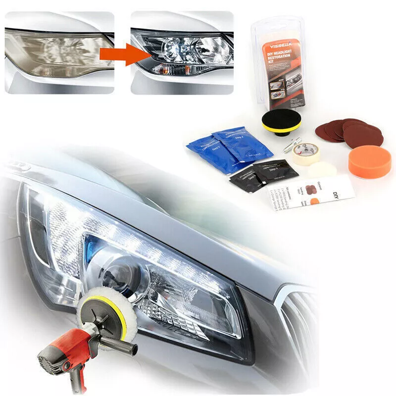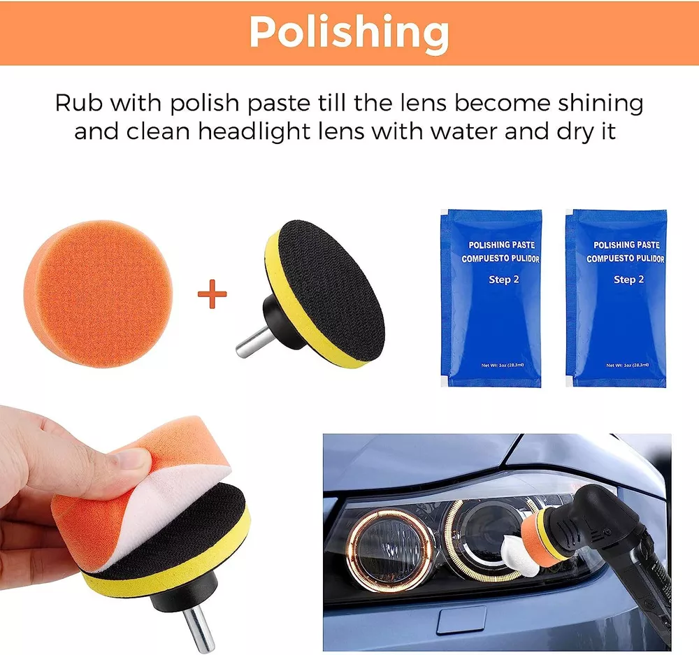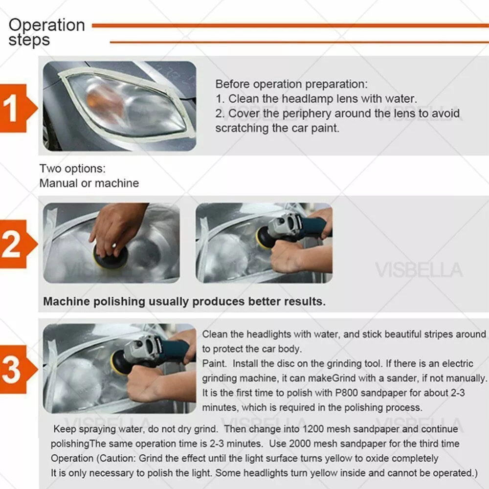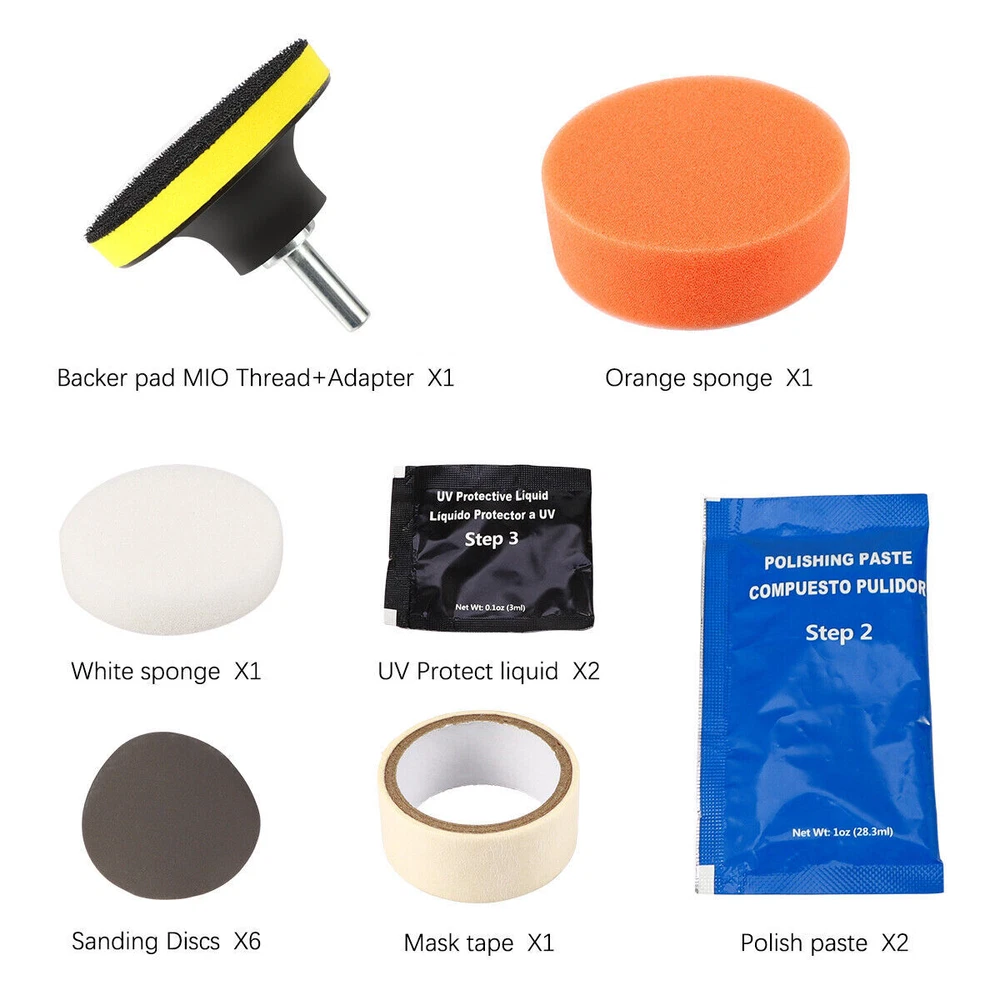 Car Headlight Lens Restoration Repair Kit Polishing Cleaner Cleaning Tools Clean Item Description Description: Professional headlight restoration kit lets your shine and restore plastic lenses, including headlights, taillights, fog and directional lights. By restoring clarity to lens, the performance of the headlight is improved and the appearance of the vehicle is enhanced. Now you can produce professional results with the headlight lens restoration kit. Kit includes all kit includes all items necessary to perform the task except for the masking tape. Two ways for choose: Manual or Machine. Machine polishing will generally yield better results. Features and Advantages: 1. Designed to restore clarity to headlight lenses that have become yellowed, cloudy, or hazy. 2. Headlight lens restoration kit improves the performance of the headlight. 3. Three easy steps: sand, polish and protect. 4. Easier than replacing an old headlight 5. Comes with easy-to-use instructions. 6. Car headlight, restoration kit does not include household polishing machine. 7. Restores headlights, taillights, fog lights or directional lights. 8. This kit is intended to restore 2 headlights. Packing List: 2x P800 Sanding Discs 2x P1200 Sanding Discs 2x P2000 Sanding Discs 1x Orange Sponge Disc 2x 28.3ml Polish Paste 2x 3.0ml Protect Liquid 1x Tape (300x2cm) 1x Backer Pad M10 Thread 1x Adaptor 1x Sponge Disc White How to Operate: Prepare : Clean the headlight lens with water. Mask off the surrounding perimeter of the lens to avoid scratching the paint of the vehicle. Step1. Sand Wet the sanding disc and attach it to the backer pad. Sand with three different grits to completely remove the heavy yellowing, fading, and corrosion. Note : Use the sanding discs from coarse to fine: P800--> P1200--P2000. Not doing so will result in restoration failure Step2. Polish Attach. the orange sponge disc to the backer pad and apply the polish paste. Polish the lens until the shine is restored to its condition. Note : For best results, use an electric buffer or polisher. If polishing by hand, polish with no less than 200 strokes in a circular, clockwise motion. Step3. UV Protection Liquid (Important) Clean the headlight lens and make sure the lens is dry before the protection step. Use the white sponge disc provided in the kit. Evenly apply the protect liquid on the surface of the lens. After apply it, stay for 10-15mins to let the liquid flow evenly itself. Then dry it direct sunlight immediately (1 to 2 hours is suggested). if not, dust and other dirt will adhere to protect liquid due to its viscosity, which will affect the brightness of the headlight. Note: Please must avoid any sunlight when apply the protect liquid on headlight (very important). After step 3, keep the lens dry. Do not wash the car for 24 hours Step4. About removing the Masking Tape After finishing all the steps, please remove the mask tape, otherwise the longer the time, the harder it is to remove and may leave traces Detail Images Shipment All item will be carefully packaged very well with safe material and shipped to US States. Items will be sent in 2 working days,usually shipped by USPS Priority Mail. It will take about 3-5 days to US addresses. If you would like to ship by other shipment methods,please contact us.( shipping cost will be combined for multiple items you purchase at a time.) Payment Only PayPal is acceptable.It is a safe and easy payment method for buyers. Please pay in 48 hours after you win the item(s).If payment cannot be made in five days,your order(s) will be claimed as unpaid case and the item will be relisted. Return & Refund Customer satisfaction is our first priority. 30-days return is available after delivery. However, return shipping and insurance cost will be on buyers. Please email us before returning. Delivery date will be different according to UPS or USPS tracking system, so please inspect your item immediately upon arrival. Money will be return to you after the return item is sent back. We can not refund to you, if your return item is broken or damaged. Please ensure its safety. Feedback Your feedback is very important to us. If you can't leave us a "5-Star" rating and a positive feedback, please contact us without hesitation before leaving feedback. We are eager to work with our customers. We believe in communication. Give us a call or send us an email, we will make things right for our buyers. Positive feedback for our buyers will be left automatically by eBay Seller Manager Pro.