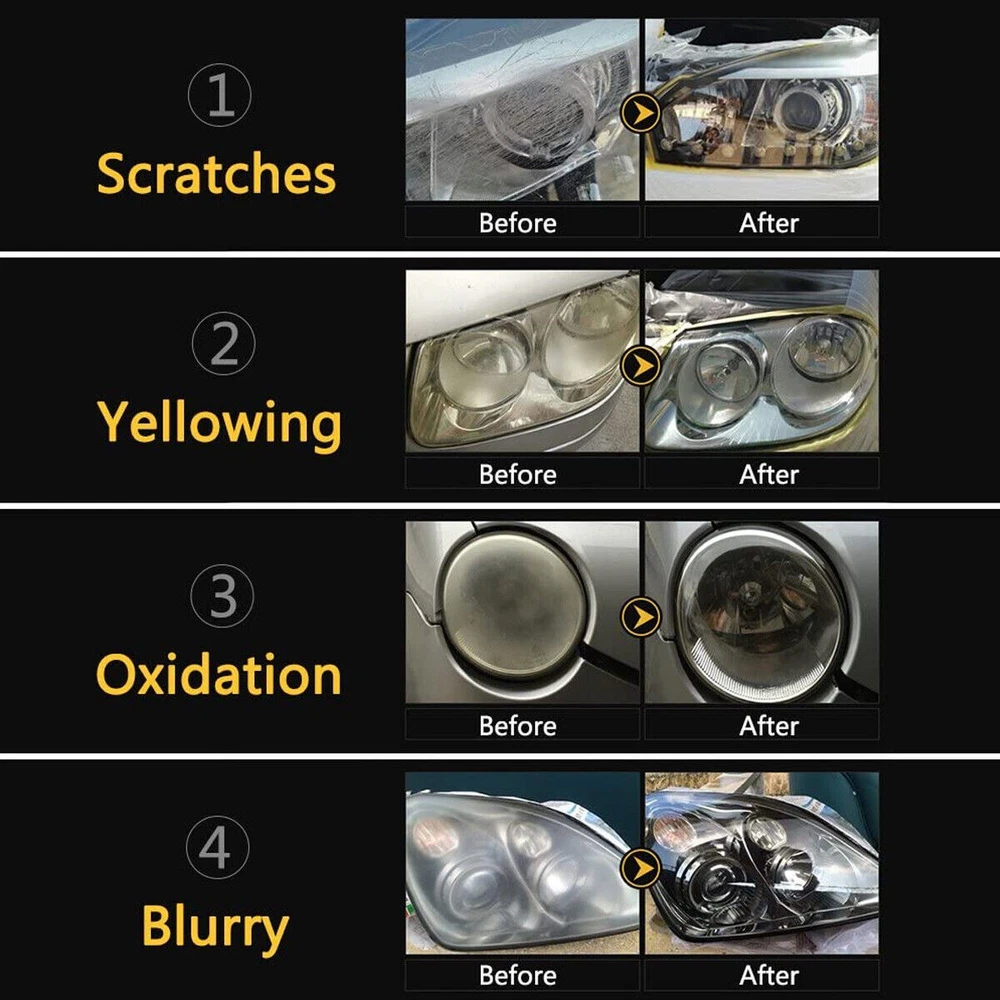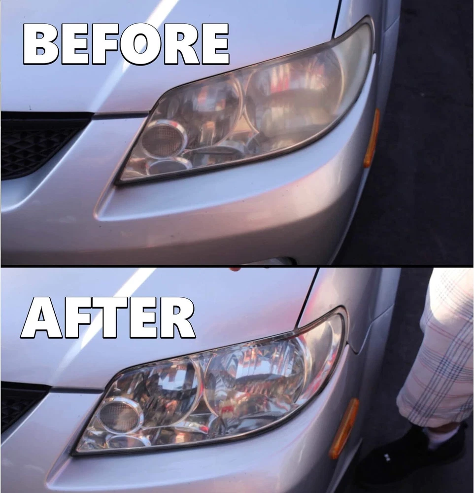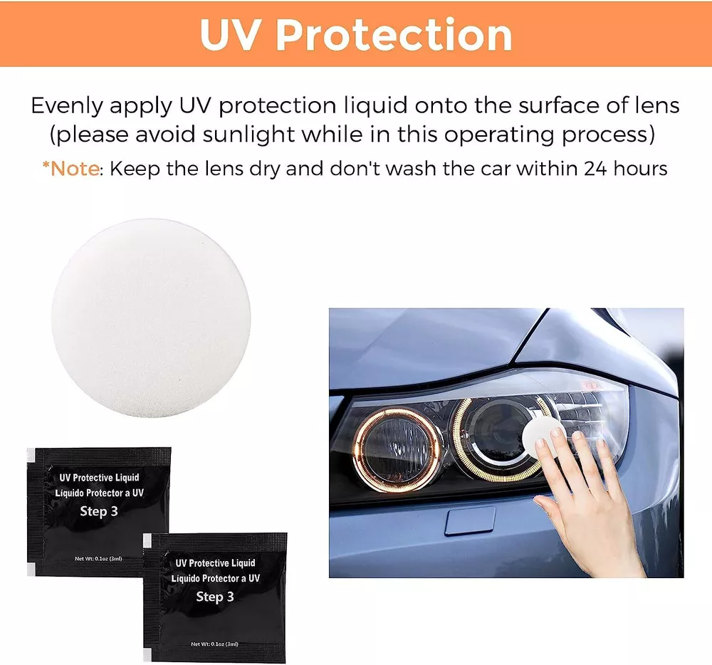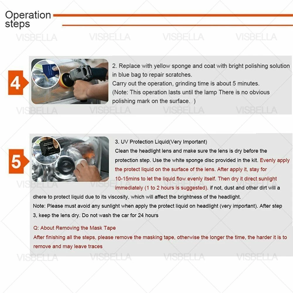 Car Headlight Lens Restoration Repair Kit Polishing Cleaner Cleaning Tools Clean Item Description Description: Professional headlight restoration kit lets your shine and restore plastic lenses, including headlights, taillights, fog and directional lights. By restoring clarity to lens, the performance of the headlight is improved and the appearance of the vehicle is enhanced. Now you can produce professional results with the headlight lens restoration kit. Kit includes all kit includes all items necessary to perform the task except for the masking tape. Two ways for choose: Manual or Machine. Machine polishing will generally yield better results. Features and Advantages: 1. Designed to restore clarity to headlight lenses that have become yellowed, cloudy, or hazy. 2. Headlight lens restoration kit improves the performance of the headlight. 3. Three easy steps: sand, polish and protect. 4. Easier than replacing an old headlight 5. Comes with easy-to-use instructions. 6. Car headlight, restoration kit does not include household polishing machine. 7. Restores headlights, taillights, fog lights or directional lights. 8. This kit is intended to restore 2 headlights. Packing List: 2x P800 Sanding Discs 2x P1200 Sanding Discs 2x P2000 Sanding Discs 1x Orange Sponge Disc 2x 28.3ml Polish Paste 2x 3.0ml Protect Liquid 1x Tape (300x2cm) 1x Backer Pad M10 Thread 1x Adaptor 1x Sponge Disc White How to Operate: Prepare : Clean the headlight lens with water. Mask off the surrounding perimeter of the lens to avoid scratching the paint of the vehicle. Step1. Sand Wet the sanding disc and attach it to the backer pad. Sand with three different grits to completely remove the heavy yellowing, fading, and corrosion. Note : Use the sanding discs from coarse to fine: P800--> P1200--P2000. Not doing so will result in restoration failure Step2. Polish Attach. the orange sponge disc to the backer pad and apply the polish paste. Polish the lens until the shine is restored to its condition. Note : For best results, use an electric buffer or polisher. If polishing by hand, polish with no less than 200 strokes in a circular, clockwise motion. Step3. UV Protection Liquid (Important) Clean the headlight lens and make sure the lens is dry before the protection step. Use the white sponge disc provided in the kit. Evenly apply the protect liquid on the surface of the lens. After apply it, stay for 10-15mins to let the liquid flow evenly itself. Then dry it direct sunlight immediately (1 to 2 hours is suggested). if not, dust and other dirt will adhere to protect liquid due to its viscosity, which will affect the brightness of the headlight. Note: Please must avoid any sunlight when apply the protect liquid on headlight (very important). After step 3, keep the lens dry. Do not wash the car for 24 hours Step4. About removing the Masking Tape After finishing all the steps, please remove the mask tape, otherwise the longer the time, the harder it is to remove and may leave traces Detail Images Shipment All item will be carefully packaged very well with safe material and shipped to US States. Items will be sent in 2 working days,usually shipped by USPS Priority Mail. It will take about 3-5 days to US addresses. If you would like to ship by other shipment methods,please contact us.( shipping cost will be combined for multiple items you purchase at a time.) Payment Only PayPal is acceptable.It is a safe and easy payment method for buyers. Please pay in 48 hours after you win the item(s).If payment cannot be made in five days,your order(s) will be claimed as unpaid case and the item will be relisted. Return & Refund Customer satisfaction is our first priority. 30-days return is available after delivery. However, return shipping and insurance cost will be on buyers. Please email us before returning. Delivery date will be different according to UPS or USPS tracking system, so please inspect your item immediately upon arrival. Money will be return to you after the return item is sent back. We can not refund to you, if your return item is broken or damaged. Please ensure its safety. Feedback Your feedback is very important to us. If you can't leave us a "5-Star" rating and a positive feedback, please contact us without hesitation before leaving feedback. We are eager to work with our customers. We believe in communication. Give us a call or send us an email, we will make things right for our buyers. Positive feedback for our buyers will be left automatically by eBay Seller Manager Pro.