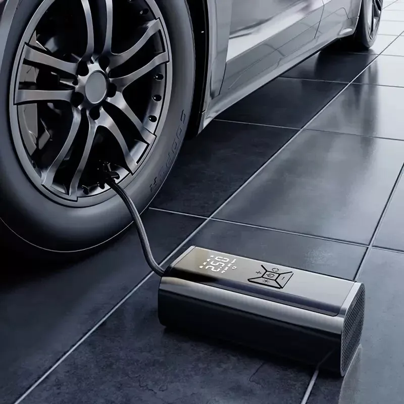 High-Power Portable Car Tire Inflator with Auto-Stop & LED Light - Fast, Convenient, Compact Automotive Air Compressor for Quick Inflation This portable car inflator is a must-have for every driver. With its wireless and cordless design, it can easily inflate your car's tires without the need for a professional mechanic. The digital display ensures accurate pressure readings, making it easy to inflate your tires to the perfect pressure. This air pump is designed for recharging (USB) and is 12V and 120 Watts of Power along with up to 150psi. It is available in a sleek black color and is highly portable, making it easy to carry around with you wherever you go. Whether you need to inflate your tires at home or on the go, this portable car inflator is the perfect solution. This product also charges electronic products such as mobile phones and tablets. Highly Rated (4.8 Stars) product