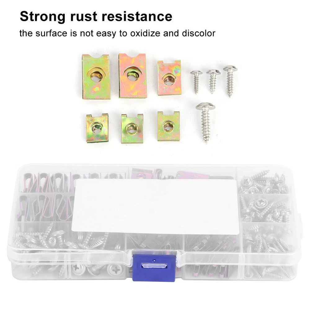 Condition: 100% Brand New Item Type: U-Clips Material: 65 Manganese Steel + 304 Stainless Steel Color: As picture shown Specification: No.6-25pcs M3x12-25pcs No.8-25pcs M4x12-25pcs No.10-25pcs M4x16-25pcs No.12-25pcs M5x20-25pcs Application: Suitable for motorcycles, automobiles, etc.