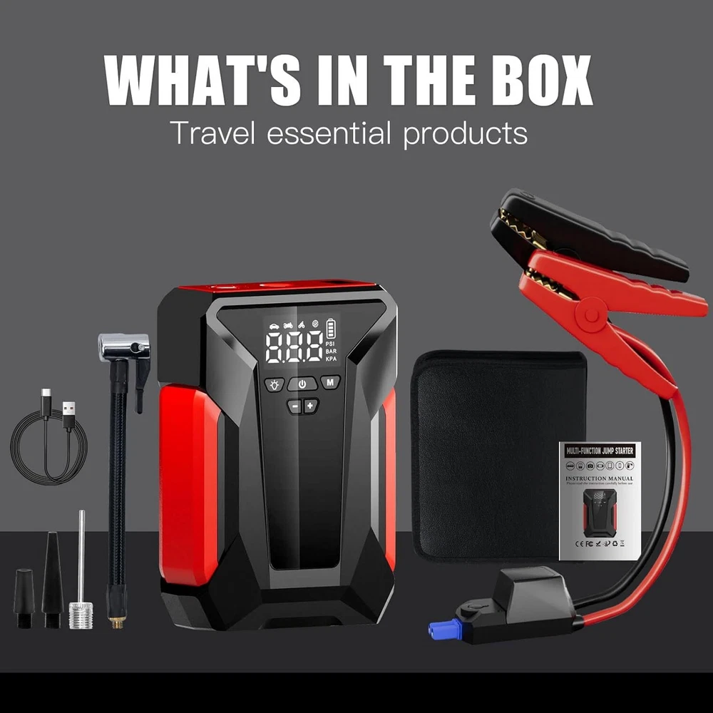 Car Jump Starter, 4000A Peak Jump Starter Battery Pack with Air Compressor, 12V Portable Car Battery Charger, Jump Box and Jump Cables (up to 10L Gas or 8.5L Diesel) with LED Flashlight, Power Bank Product Details Brand: UINCLU Product Dimensions: 7.5"D x 10.4"W x 2.4"H Item Weight: 3 Pounds Amperage: 4000 Milliamps Peak Output Current: 4000 Amps Manufacturer: Shenzhen Xinlijie Technology Co., Ltd. Item Weight: 3 pounds Item model number: J16 Batteries: 1 Lithium Polymer batteries required. (included) Manufacturer Part Number: Shenzhen Xinlijie Technology Co., Ltd. Brand: UINCLU Product Dimensions: 7.5"D x 10.4"W x 2.4"H Item Weight: 3 Pounds Amperage: 4000 Milliamps Peak Output Current: 4000 Amps Battery Cell CompositionVoltage: Lithium Polymer12 Volts Vehicle Service TypeBattery Capacity: All of the above29800 Amp Hours ➤【 】:The 4000A peak current jump box is stronger than most starters on the market. It can easily start 12V vehicles (up to 10L Gas or 8.5L Diesel) even in extreme weather (-4°F-140°F), suitable for lawn mowers, motorcycles, cars, SUVs, etc. It will always be your reliable and trustworthy road partner. ➤【 】:After the car jump starter is connected to the tire, the tire pressure can be read. Preset the tire pressure in advance, and the tire pressure will automatically stop when it reaches the preset value. The maximum 150PSI can inflate various tires and balls. The hose will heat up slightly during the inflation process, please don't worry, this is normal. ➤【 】:The jump starter has 3 modes of LED emergency lights (flashlight, strobe, SOS), which is very suitable for friends who like camping. The operation is also very simple. Press and hold the power button for 3 seconds to turn on the display screen, and then press the light button to switch to different light modes. ➤【 】:The jump starter battery pack has a USB port that can charge USB devices. It is a good choice when you need to charge your mobile phone urgently, but it cannot completely replace the power bank. In addition, in order to extend the service life, please charge it in time after each use. If it is not used for a long time, please charge it every two months. ➤【 】:Product safety is our primary goal, so our smart jump cables have 10 safety protection measures, such as over-current and over-voltage. So it is normal that sometimes the car cannot be started at once, because this is a protective measure at work. ➤【 】:The battery jumper comes with a leather storage bag (8.7 inches * 10.4 inches * 2.6 inches), which has a zipper and handle for easy carrying and storage of products. In addition, the leather bag is very soft, which can prevent product wear, cushion external pressure, and better protect the product. ➤【 】:1 X carrying bag, 1 X jump starter with air compressor, 1 X user manual, 1 X smart jumper cable, 1 X Type-C cable , 1 X inflation hose and 3 X air nozzle (in the side storage area of the product). If you have any after-sales questions about jump starter, please feel free to contact us. ➤【 】:1.Please fully charge after each use. 2.If not used for a long time, please charge it every two months. 3.Please do not store the product in a low temperature environment during winter, as the lower the temperature, the easier it is for the battery to be discharged. 4.Please read the user manual carefully before use.