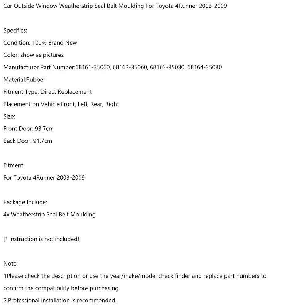 SAFE & SECURE SHOPPING 100% SATISFACTION GUARANTEED FAST SHIPPING Store Categories Store Categories Other eBay Motors Honda Toyota Ford Chevrolet Audi Mercedes-Benz Dodge Jeep You may also like 4x Oxygen Sensor Up&Down 234-9072 For Nissan Pathfinder Frontier Xterra 4.0L #8 101.69 USD Free shipping 2PCS Power Liftgates Lift Support 31386705 31386706 Fit Volvo XC60 2012-2017 211.69 USD Free shipping Differential Lock Motor 1645400288 For Mercedes Benz Ml63 Amg 6.3L 2007-2011 171.69 USD Free shipping Folding Aluminum Platform RV Step Stool Trailer Camper Working Ladder USA 105.6 USD Free shipping NEW Gloss Black Front Kidney Grill Grille fit BMW G20 320i 330i M340i 23-24 US 128.99 USD Free shipping Front Bumper Cover Fog Light Bezel Insert Grill Grille Fit Audi Q7 2016-2019 131.69 USD Free shipping Car Outside Window Weatherstrip Seal Belt Moulding For Toyota 4Runner 2003-2009 Product Description Car Outside Window Weatherstrip Seal Belt Moulding For Toyota 4Runner 2003-2009 Feature: 1: According to the original factory specifications,perfect match for the original car. 2: Own different test machines to design exact accurate parameter for our products.All switches were tested for performance. 3: Made by high quality material, lightweight, anti-rust, colorfast and durable. 4: Aftermarket product with premium quality. 5: Stable performance, high reliability,suitable for replacing your broken one. Specifics: Condition: 100% Brand New Color: show as pictures Manufacturer Part Number:68161-35060, 68162-35060, 68163-35030, 68164-35030 Material:Rubber Fitment Type: Direct Replacement Placement on Vehicle:Front, Left, Rear, Right Size: show as pictures Fitment: For Toyota 4Runner 2003-2009 Package Include: 4x Weatherstrip Seal Belt Moulding [* Instruction is not included!] Note: 1Please check the description or use the year/make/model check finder and replace part numbers to confirm the compatibility before purchasing. 2.Professional installation is recommended. About Us Shipping Terms Returns Contact Us About Us VIPIH is one of the international leading distributors specialized in distribution of auto spare parts of the world’s prime auto part suppliers on a global scale with the full responsibility in procurement, shipping, sales and marketing and after sales service. VIPIH fulfills all needs of its clients completely and on a timely basis with the know-how it has built up since it was established and the comprehension knowledge of the sectors standards. The perfectionist approach in product quality, high service availability, strict principle of business follow-up, reliability and the good reputation which has gained strength as a result of customer satisfaction are the most striking components of VIPIH ’ s success. VIPIH is presently capable of supplying all demands for auto parts from the gear box to turbo hoses in a wide range. Free delivery with worldwide shipping options available. If can not locate what you need then please get in touch! Shipping Shipping Terms International Buyers – Please Note: 1. Import duties, taxes and charges are not included in the item price or shipping charges. These charges are the buyer’s responsibility. 2. Please check with your country’s customs office to determine what these additional costs will be prior to bidding/buying. 3.Buyers' Information: We strive our best to provide you the most reliable, affordable way of shipping service. But sometimes international delivery is highly depended on the courier company and local customs/duties. If you do not receive your item on time, please sent us ebay message immediately for further assistance. Thank you for your understanding. Terms We stand behind everything that we sell and will do everything possible to assure you are satisfied. When you receive your purchase if you are not 100% satisfied, please sent me ebay message and we will do our best to make you happy. If you still want to return your purchase, simply ship the item(s) back to us and we will refund your original purchase price and the original shipping charge. Buyers are responsible for the postal cost of returning the items. We must be notified of the intent to return your item within 30 days of receiving the item. Items returned must be in the same condition that they were received. How to return 1,Please ask us for return address . 2,Shipping back the package . The RMA#(Return Merchant Authorization Number = Your ebay ID) must be clearly written on the return package ,Otherwise the package will be refused. 3,Sent us the return tracking number. 4,All returns will be inspected prior to a credit being issued. Returns 1:Returns are accepted within 60 days of purchase. 2:All returned items MUST BE in the original packaging. 3:We will be happy to assist you if if any item needs to be returned or replaced 4:Please don't open a return request before contacting us first to solve, many thanks. Contact Us If you have any questions, our Customer Service staffs welcome you to sent me ebay message. We strive to answer all questions and resolve any problems as quickly as possible. Business Hours: Monday-Saturday 9:00-17:00 Copyright © 2022 Tongtool