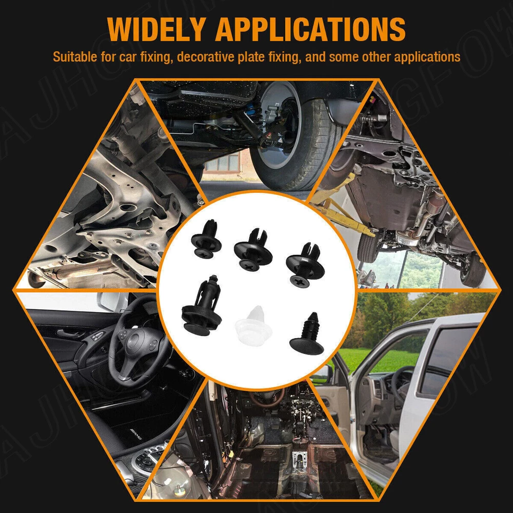 Attachment Type: Clip-On Manufacturer Warranty: 1 Year Other Part Number: Under Engine Splash Guard Rivet Fastener Clips Fitment Type: Direct Replacement Package Contains: 100pcs Clips, 1 Plastic Box Manufacturer Part Number: 100 Pcs Automotive Push Type Retainer Kit Packing: PP Box Superseded Part Number: Universal For Auto Car SUV Off-Road Pickup Truck Material: Nylon Clips, Plastic Box Universal Fitment: Yes Country/Region of Manufacture: China gtin13: 138465855771 Color: Black & White UPC: 138465855771 OE/OEM Part Number: Clip Trim Car Push Placement on Vehicle: Left, Right, Front, Rear, Upper, Lower Interchange Part Number: Screw Fender Body Door Trim Panel Hood Features: Easy Installation Finish: Plastic Warranty: 1 Year Type: Bumper Brand: Unbranded Item Type: Fastener