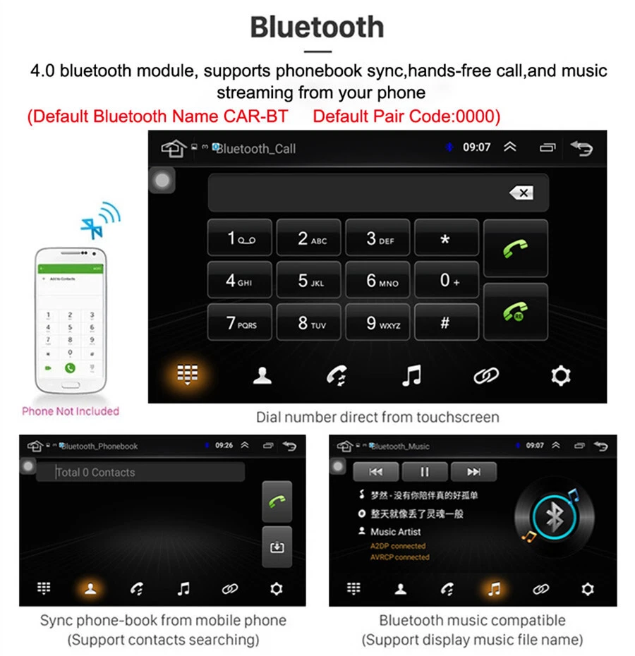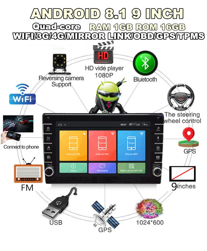 Home Payment Shipping About us Contact us Store Categories Store Categories Other Details Quad-core Android 8.1 Car Radio 9 Inch MP5 Multimedia Player GPS Wifi FM USB Single Din Car Stereo 1+16GB With Knob Button Specifications This vehicle list is just for your reference, please check size before purchase. Thank you very much. General - Power Supply: DC 12V (allowance range: 10.8-14.5V) - Max. Current: 10A - Screen Size: 9 inch - Front panel Size: 250mm(Top width)*146mm(High)*241mm(Bottom width Type - Single Din,Height Adjustable,more universal. New model with knobs and keys System - Operation System: Android 8.1 - CPU: Quad Core - GPU: Quad Core - ROM: 16GB - RAM: 1GB - Extended USB: Support USB Disk up to 32GB Display - Touch Screen: Yes - Resolution: 1024*600 - Capacitive or Resistance Screen: Capacitive - Built-in Clock and Calendar: Yes, show real time and can use network-provided time - Main Menu Status Bar display: Can be changed to Music/Radio/BT-Stereo Player and Clock/Date/Week - Change Apps-Icon Position: Yes WiFi/3G/4G - Connector: On the Back - WiFi: Built-in WiFi Modem, support 802.11b/g/n - Supports 4G & 3G Internet (4G Dongle and 3G Dongle are not included) Internet - Explorer: Opera, UCWeb, SkyFile, Dolphin and more explorer for your selection - Online Entertainment: Online Video, TV, Movie, Music, Radio, Video Chat - Online Navigation: Online Google Maps Navigating - Online Games: Yes, online play or you can download it from google play store - Online Communication: WeChat, Twitter, Facebook, Skype, Gmail, Whatsapp etc. - Read and edit Office Software: Yes, support Word, Excel, Powerpoint, PDF, TXT Audio - Format: MP3/WMA/MP2/OGG/AAC/MA4/FLAC/APE/WAV etc. Could play via song list - Record: MP3, WMA - Other: LRC synchronized display; ID3 search; Search by files; Album Picture; User-defined audio effect - Audio IC: Top Global Cirrus IC, independent audio decoding - SNR: Noise rations:=90dB Video - Format: Support AVI (H.264, DIVX, XVID), RM, RMVB, MKV (H.264, DIVX, XVID). WMA, MOV, MP4 (H.264, MPEG, DIVX, XVID). DAT (VCD format). VOB (DVD format). PMP, MPEG, MPG. FLV (H.263, H.264). ASF, TS, TP, 3GP, MPG etc. =30 formats, Playing internet video directly (while downloading) - Play: Up to 1920*1080 Pixels, 30Mb. Fluent play without light spot GPS - Operation System: Android 8.1 - Support Maps: IGO, Sygic, Google Map etc. - Voice Guidance: Yes - Support 2D/3D Map Views: Yes - Dual Zone: Yes, navigating while music playing - Online Navi: Yes, support google maps online navigating Bluetooth - Hands Free: Yes - A2DP (Bluetooth Stereo Music): Yes, can play stereo music through Bluetooth - Bluetooth Music Control: Yes, play/pause/previous/next - PB-Download: Yes, can download phonebook from mobile to this unit - PB-Search: Yes, can use the first letter to search contact member in PB-Listings - Calling Records: Yes, Dialed Call, Received Call, Missed Call - Setup: Auto Answer, Auto connect, Device name - Built-in Microphone: Yes, on the front panel Radio - FM Tuning Range: 87.5-108MHz - FM Increment: 0.05MHz(EU)/0.1MHz(US) - FM Area: Europe/USA1/USA2/Japan/Russia - Preset Stations: 30(FM 3*6, AM 2*6) USB - Position: 2 USB Port, can be connected with Media/Camera/DAB+ Box/Smartphone - Play MP5 Videos: Yes, can play RMVB Videos up to 1080P - Touch Music Title to play directly: Yes DVR - Built-in Car Recorder App: Yes, just connect a USB Camera to use this function - Support HD CCD Camera: Yes - Play recorded Video directly: Yes - Storing Position: Nand Flash/GPS Card/SD Card/USB Storage can be changed DAB(+)-IN - Support(DAB+ BOX NEED TO BUY SEPARATELY) DTV-IN - Built-in Digital TV Tuner: No (you can us to buy it together) - External Port for TV Box: Yes, Support DVB-T/DVB-T2/ATSC/ISDB Box - Power Supply to TV Box directly: Yes, you can connect our TV Box to achieve this function - Touch Control the TV Box on unit: Yes, you can connect our TV Box to achieve this function Additional - Textbook: Could change font, font color, background color, bookmark, reading E-book while listening music - Photo Viewer: Support JPS, BMP, PNG, GIF etc. format. play by revolve, Powerpoint Support 4096*4096 Pixels - Wallpapers: 5 live wallpapers, 17 standard wallpapers, support DIY wallpaper from Gallery - APK Installer: Support Android Package installer - Support Torque Pro(OBD2 &Car): Yes, you can connect a Bluetooth OBD2 Scanner Tool to use this function - Support Mirror Link function: Yes, support screen mirroring from iPhone and android smartphone - Support TPMS: YES (Not Included, you can us to buy it together) Setup - WiFi/Hotspot/Bluetooth: Yes - Brightness level adjustable: Yes - Wallpaper: Wallpapers/Live Wallpapers/Gallery - Sound: Key Tone & Volume - Storage: Display Internal Storage/Nand Flash/Connected Device Storage - Apps: Running Apps display/force stop/uninstall - Security: Yes - Accounts: Yes - Languages and Input: more than 70 Languages and choose input method - Backup and Reset: Yes - Date and Time: Setting Date&Time by yourself or choose GPS/network-provided time - Accessibility: Yes - GPS: Yes, GPS application options/monitoring/sound mode/mixing ratio - Driving safety: Watching Video, Reversing X-mirror/Volume, Reversing Trajectory/radar Display, Rear view ruler - Amplifier: Rock/Pop/Jazz/Classic/Flat/Voice/Custom - Steering Wheel Control: Yes - About Device: Display Parameter Info. Input - AUX Video In - Rear-View Camera Video In - AUX Audio In: R/L - DTV Box In - DAB+ Box In - Car DVR In - GPS Antenna In Output - Video Out - Audio Out - Surround Stereo Out: 4*50W Accessories -1 x Car MP5 -1 x GPS Cable -2 x USB Cable -1 x Power Cable -1 x RCA Cable -1 x Camera Input Cable Shipping Policy Payment Method Returns Policy Shipping Policy Payment Method Returns Policy Home Payment Shipping About us Contact us Home Payment Shipping About us Contact us Store Categories Store Categories Other Details Quad-core Android 8.1 Car Radio 9 Inch MP5 Multimedia Player GPS Wifi FM USB Single D