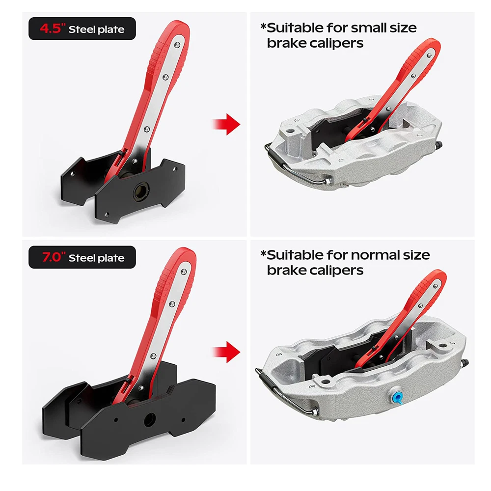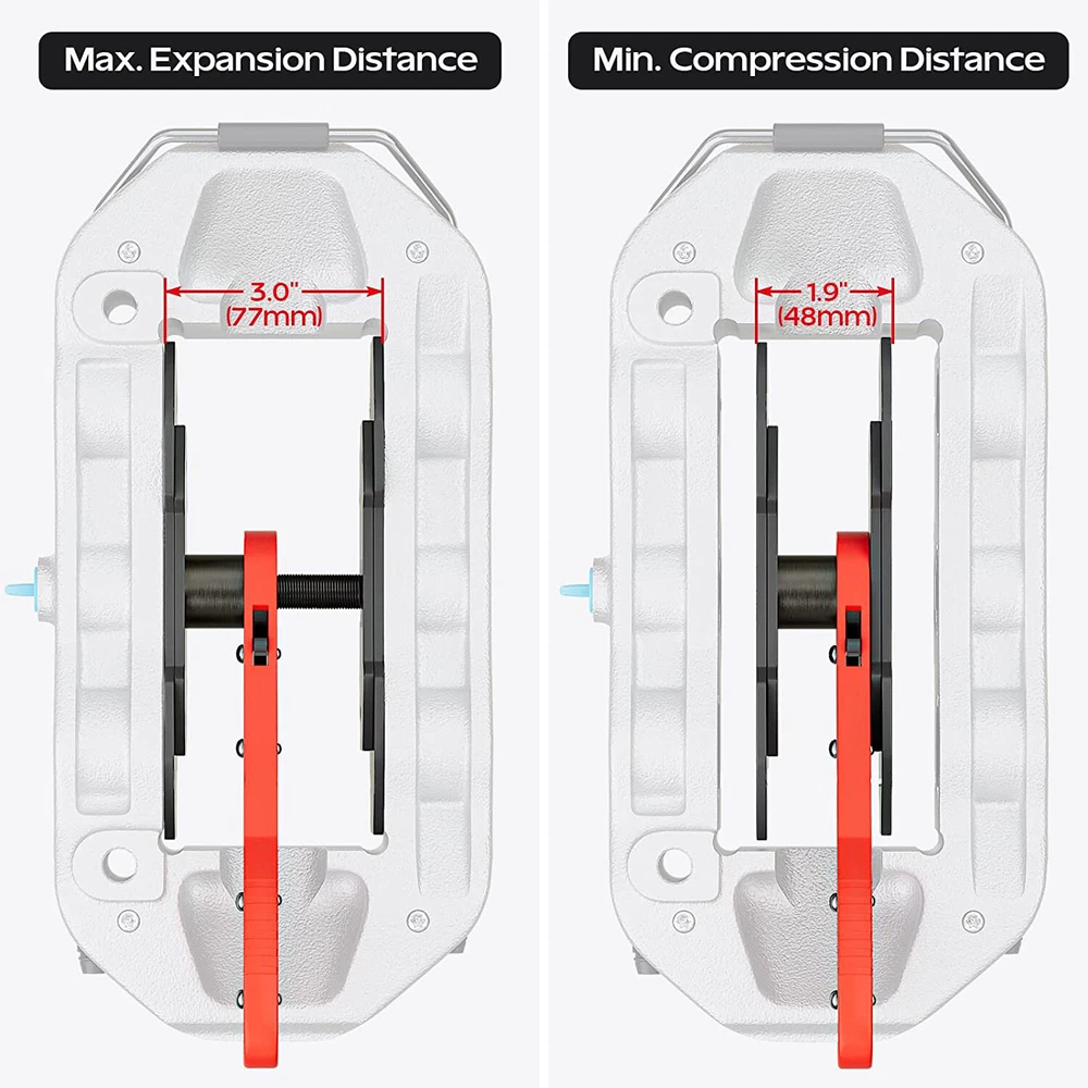 Be used on twin and quad piston fixed calipers, as well as single and twin piston floating calipers. Suitable for ear-type hose clips found on fuel, cooling system and vacuum hoses. Ratchet technology gives a full 360 degree swing so that the spreader may be placed at any position. Features: This ratchet brake piston caliper spreader tool is suitable for brake tools and brake cylinder adjustment group. Centrally distribute power to prevent piston misalignment. 360° ratchet swing allows for use at any angle, more convenient. Easy to use, can compress your brake pistons effortlessly in seconds. Made of premium quality material, solid and durable. Suitable for most kinds of single, double and four-piston calipers. Specification: Material: Plastic & Metal Package Size: approx. 30 * 10 * 5cm / 11.81 * 3.94 * 1.97in Package Weight: approx. 1000g / 35.27oz The pads spread from a range of 1-1/2" to 2-5/8" pushing the caliper pistons back to allow plenty of room to install the new brake pads. Package List: 1 * Brake Caliper Press Tool