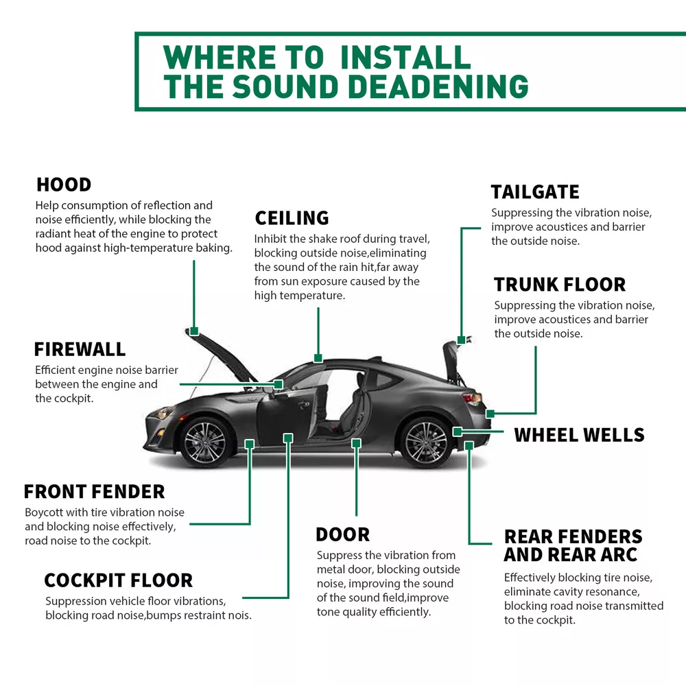 Specifications: Condition: 100% brand new Features: Car heat / sound insulation Placement on Vehicle: Front/Rear/Left/Right Reinforced / Crush Resistant: Yes Mildew & Mold Resistant: Yes Water resistant: Yes Non-toxic: Yes Material: Aluminum & Foam & Adhesive Backing Size:1m*1m=39INCH*39INCH=11sq.ft Thickness: 5mm=197mil=1/4INCH Feature: Yetkole Best choice of motor parts Car & Truck 11Sqft Sound Deadening Mat Offers Comprehensive Coverage 39"x39" Specifications: Condition: 100% brand new Features: Car heat / sound insulation Placement on Vehicle: Front/Rear/Left/Right Reinforced / Crush Resistant: Yes Mildew & Mold Resistant: Yes Water resistant: Yes Non-toxic: Yes Material: Aluminum & Foam & Adhesive Backing Size:1m*1m=39INCH*39INCH=11sq.ft Thickness: 5mm=197mil=1/4INCH Feature: 1. Durable housing for harsh environments 2. Easy to cut and fit, with strong adhesion 3. Due to its excellent load resistance, it is very suitable for underfloor applications 4. High temperature resistance, high noise reduction and insulation performance, non combustible and flame retardant 5. Easy to install, suitable for various car models, simply trim piece s to fit, peel and place and hand roll to ensure good adhesion. No messy spray paint or adhesive is required to install this product. 6. Can be used for the entire interior of any vehicle including: floor panel, door, carpet under/seat, headliner/roof, trunk, trunk lid, firewall (internal side). 7. By reducing or suppressing the sound vibration of the metal plate, you can eliminate road noise. 8. This car insulation is used in many applications, such as muscle cars, hot rods, light cruisers, imports, tuners, street rods, mouse rods, classic cars, racing cars, stock cars, old antique cars, pickups, trucks, low rider and many more. We even have customers using it on their SUVs, vans, RVs, luxury cars, campers, yachts, RVs and school buses. Features & Details: 【Reduce road noise】If you often drive on uneven roads or on noisy highways, sound insulation can bring you more comfort. It will reduce the noise of roads and other drivers. It will make your driving smoother and have the added benefit of better media listening 【Enhance the music】Use sound insulation to make your radio clearer. You will no longer have to turn it up because of traffic noise. Not only is it good for music, but audio books and telephones will sound better, too 【Improve privacy】If you don't want other people on the road to hear what you're listening to, the sound insulation prevents the noise from escaping. Sound insulation will help you 【Warm in winter and cool in summer】The car insulation will help reduce your interior temperature in the summer, and in winter, the heat insulation can keep you warm in the car, which is conducive to warmth reduce engine/tunnel/console 【Protect car paint】In summer, the temperature is too high, the engine runs at high speed and accelerates for a long time, and generates heat, which can easily cause the aging and fading of the car paint; the heat insulation pad can protect it 【Increase the life of the car】In summer, due to high temperature and long-term driving, it is easy to cause the cabin to heat up and cause a fire, which may seriously damage your car. Using heat insulation pads can extend the life of the car Installation: 1. Please clean the surface you want to paste. 2. Make insulation materials and sheet metal firm fit, and play best adhesive, damping performance. 3. It is best not to repeatedly tear and paste during the successful installation process, otherwise the paste effect will be destroyed. Package included: 1x Heat Sound Deadener Insulation Mat 1x Rollers 4x Installation Tools (Please allow 1-3cm difference due to manual measurement.) Important Note: Please allow slight dimension difference due to different manual measurement. Due to the light and screen setting difference, the item's color may be slightly different from the pictures. If you have any questions about quality, shipping or other problems, please contact me first via eBay message. I will give you a satisfy solution. Item Specifics Brand Modigt Type Carpet Mat, Heat Sound Deadener Insulation Material Aluminum & Foam & Adhesive Placement on Vehicle Cargo/Trunk/Bonnet/Dashboard/Under Seat/Doors Color Silver Features Easy to install, waterproof, fireproof, mildew proof Universal Fitment Yes Manufacturer Warranty 2 Years Function Noise Reduction, Easy to Cut, Self-Adhesive Function 1 Protects Paint from Blistering Function 2 Reduce the road/ Engine/ Wind noise Function 3 Dustproof, Waterproof, Anti-moisture Application1 Turbo,Front Fender,Rear Fender Application2 Hood,Firewall,Doors,Floor,Roof Application3 Trunk Lid,Trunk Room,Engines,Tailgate Application4 Ceiling,underneath bonnets,Underfelt Application5 Classic Car,Race Car,Stock Car,Old Vintage Car,Pickup,SUV,Caravan Application6 Cockpit Floor, Tailgate, Firewall U Type Wall Application7 For Use in The Application Of Any Sound Application8 Car& Home Interior Heat Sound Deadener Application9 Car& Home Interior Heat Sound Deadener Insulation Thickness 5mm=197mil =1/4INCH NOTE with free rollers Manufacturer Part Number Car Heat / Sound Insulaiton Deadener Superseded Part Number Heat Sound Deadener Insulation Mat Interchange Part Number Deadening Material Insulation Cars & Truck Fitment Type Direct Replacement Finish Matte Size 1m*1m=39INCH*39INCH=11sq.ft Payment 1. It will be much appreciated that you finish your payment asap or it will make UPI (unpaid item case) on your account leading to be suspended or restricted by eBay when those UPI cases carry over to certain amount. 2. Any problems please contact us for more details. Shipping 1. All items will be shipped to buyer's ebay address. 2. All items will be shipped within 24-48 working hours upon receipt of payment, and multiple items will be combined shipping. 3. In most cases, delivery takes around 3-5 business days, it's highly depended on the efficiency of