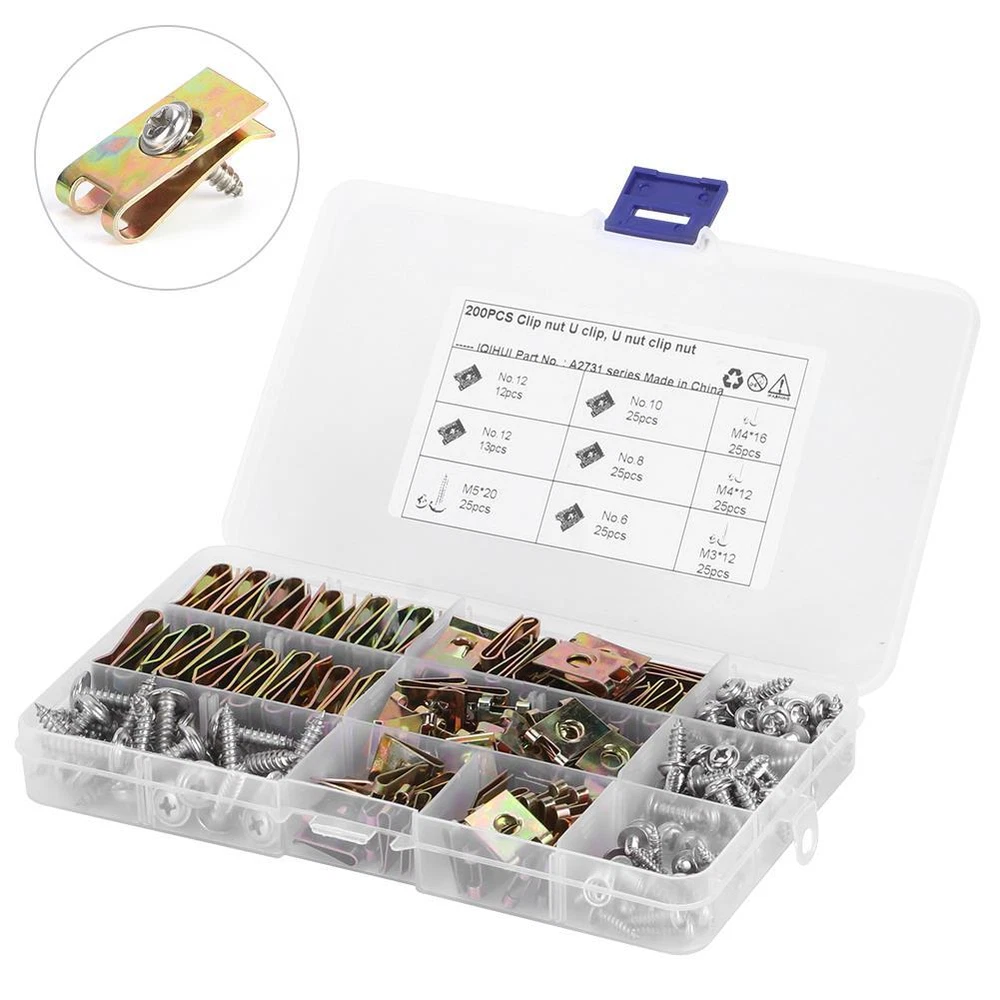 Condition: 100% Brand New Item Type: U-Clips Material: 65 Manganese Steel + 304 Stainless Steel Color: As picture shown Specification: No.6-25pcs M3x12-25pcs No.8-25pcs M4x12-25pcs No.10-25pcs M4x16-25pcs No.12-25pcs M5x20-25pcs Application: Suitable for motorcycles, automobiles, etc.