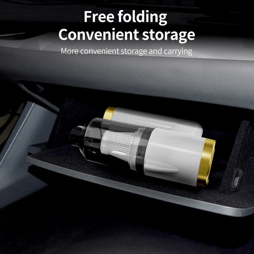 The car vacuum cleaner is a versatile and powerful cleaning tool designed to make your cleaning tasks effortless. With its three types of nozzles, you can easily tackle different cleaning needs. The wide nozzle efficiently handles large areas, such as the car floor, while the brush nozzle effectively removes dust from the gaps between air conditioning vents. The flat nozzle is perfect for reaching small and hidden corners that are often overlooked. Car Vacuum Cleaner Cordless Handheld Car Vacuum Cleaner Versatile nozzle options: The car vacuum cleaner comes with three types of nozzles: wide nozzle, brush nozzle, and flat nozzle. Each nozzle is designed for specific cleaning purposes, such as large areas, gaps between air conditioning vents, and small corners. Powerful and foldable: The vacuum cleaner is equipped with a 4000mAh rechargeable battery that provides up to 30 minutes of continuous use. It offers a strong suction power of 9000pa and features a foldable design for convenient storage and portability. Noise reduction: The optimization of the air duct and tight engagement of components help reduce wind resistance, vibration noise, and rotor friction noise, resulting in a quieter cleaning experience. LED illumination: The vacuum cleaner has a built-in LED light that automatically turns on when the power is switched on. This feature allows for clear visibility of dust and debris in dark corners and crevices, both inside the car and at home. Wide range of applications: Apart from car cleaning, this vacuum cleaner can also be used to clean sofas, sheets, pet hair, carpets, desks, computers, and more. It effectively sucks away various types of debris, including sediment, confetti, hair, cigarette butts, and gravel. Product Material: ABS, PC Sution Power: 9000PA. Rated Power: 120W, Input: 5V/1.5A, Dust Collection Bin: 120ml Charging Time: Approximately 4 Hours, Built-in Battery: 4000mAh, Working Time: 30 Minutes, Item Size: 7.6*1.7in Package List: 1* Car Vacuum Cleaner Body, 1* Dust Collection Bin, 2* Washable Filter, 1* Long Mouthed Tube, 1* Brush Suction Head, 1* Charging Cable, 1* Storage Bag
