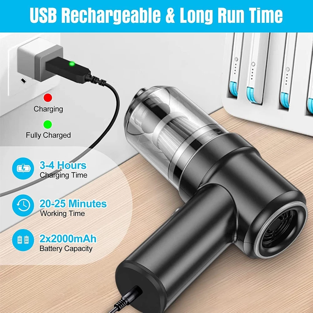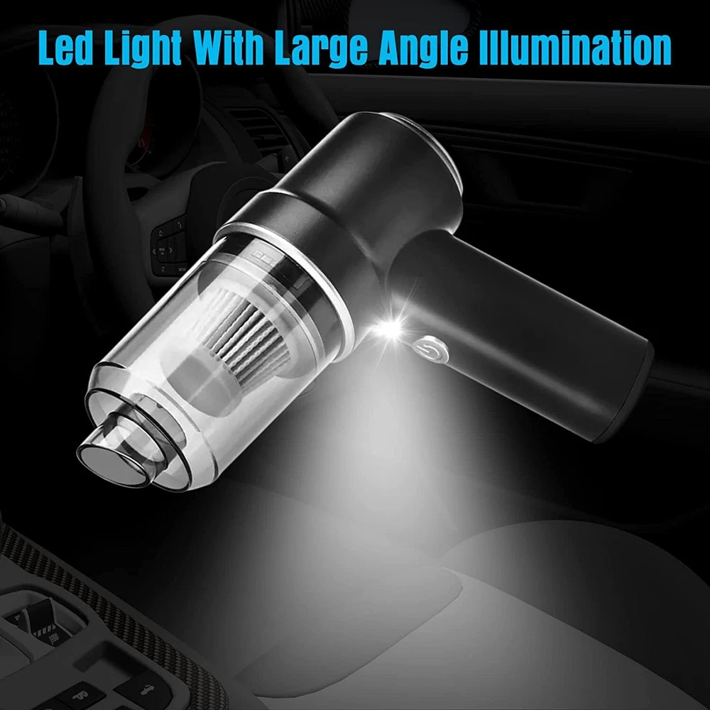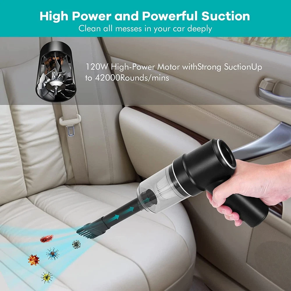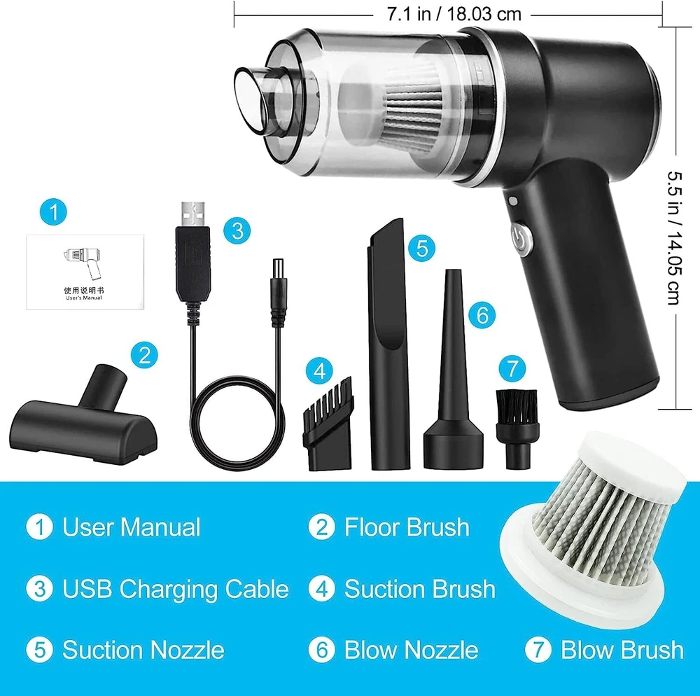 Vacuum Cleaner & Air Duster 2-in-1 【Vacuum Cleaner & Air Duster 2-in-1】--Addoped to advanced 2-in-1 technology of blowing and suction, this Car Vacuum Cleaner is very helpful for you. Our 120W high power handheld cordless vacuum has powerful suction up to 9000PA, good ideal for cleaning small crevices, such as sliding doors tracks, windows, drawers, computer hosts, car doors, sofas, keyboards, sewing machines, pianos, etc. 【Cordless Multifunctional Vacuum Cleaner】--This handheld car vacuum cleaner is cord-free design and portable, which can let you clean everywhere, includes hard to reach corners. It also designed with bright LED light, which can provide you an easy clean in darkness.which is enough to meet your cleaning needs for dust, debris, sand, pet hair and some difficult-to-clean debris in the car or home 【Easy to Clean】--Our car vacuum cleaner is equipped with a transparent large capacity 0.1L dust collection cup. One-button disassembly and quick garbage dumping, are convenient for next cleaning. It will come with a double-layer washable Haipa filter, which supports wet and dry using and making the dust collection more durable. 【Fast Charging & Long Run Time】--Adopted the latest fast charge technology and the latest generation of rechargeable batteries, this mini vacuum cleaner can be full charged in 2.5-3 hours and run for about 20 minutes(The runtime may vary according to the cleaning load.). This high power vacuum cleaner has temperature protection, over-voltage protection, over-current protection, and short circuit protection. 【What You Det】--1* Handheld Vacuum, 1*Multifunctional Suction Nozzle (Flat + Brush), 1* Multifunctional Air Nozzle ( Fine + Brush), 1* Floor Brush, 1* USB Cable, 1* Manual, 1*HEPA Filter. ( Attention: please don’t sink the machine into the water in case of short circuit), which can meet different detailing and cleaning, reaching under car seats, into trunks, into all the nooks and crannies of your vehicle and all house cleaning.