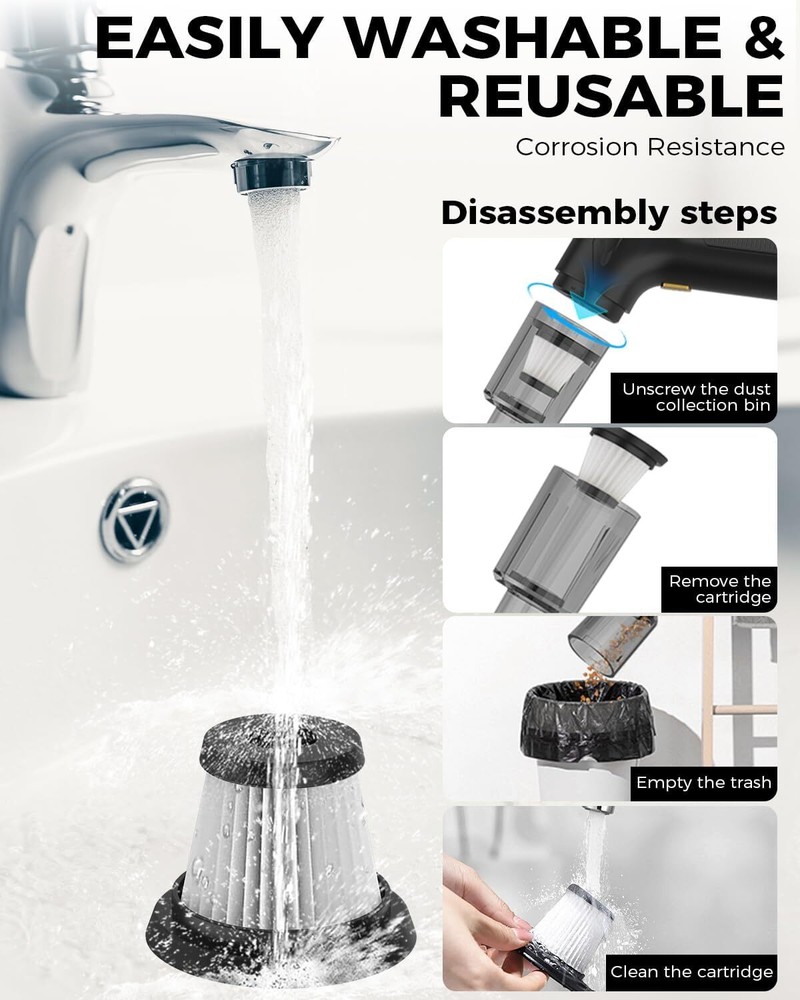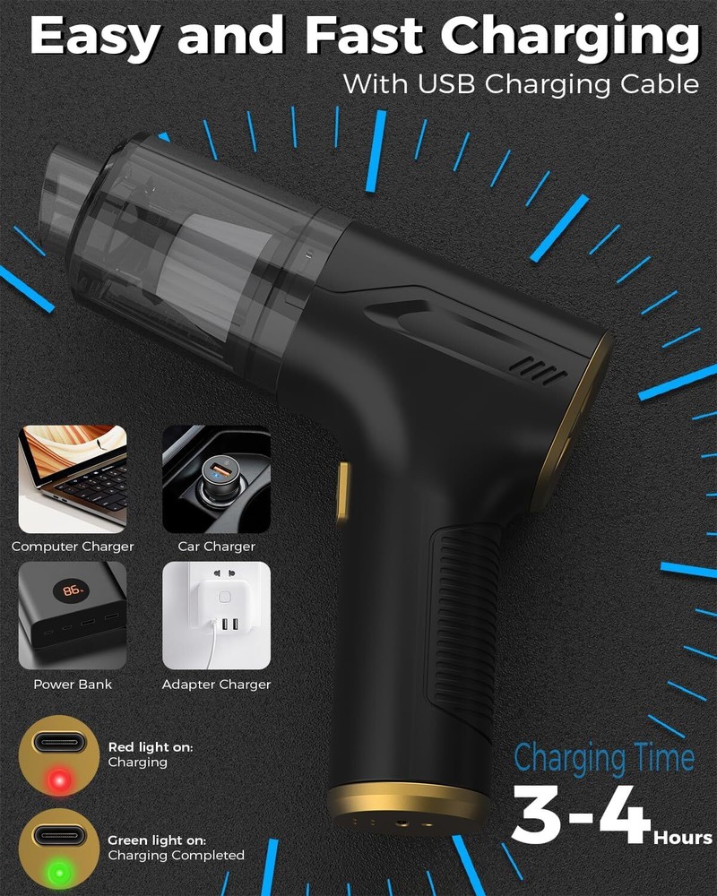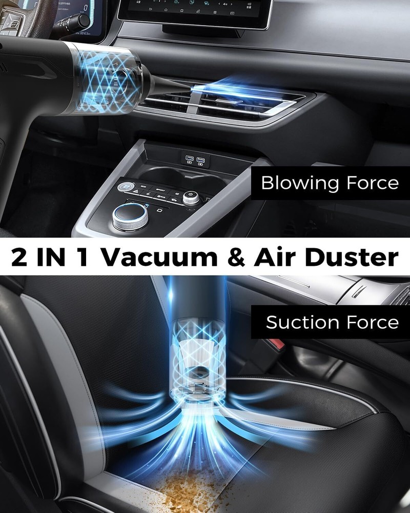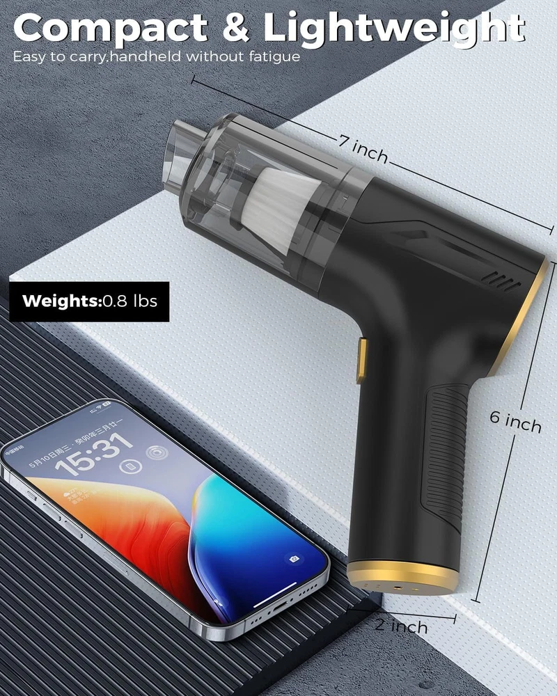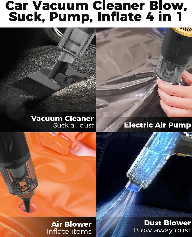Car Vacuum Portable Cordless Cleaner-High Power 9000PA Suction,3-in-1 Car Vacuum Cleaner is Compact and Portable, Suitable for Pets, Cars, Offices and Homes Product Details Brand: DEIFO Special Feature: Portable Filter Type: Cartridge Included Components: Nozzle, HEPA Filter, Brush Capacity: 0.9 Pounds Charging Time: 4 Hours Recommended Uses For Product: Car Form Factor: Handheld Model Name: YS Battery Description: Takes 4 hours to charge Noise Level: 70 dB Battery Life: 15 minutes Manufacturer: DEIFO Controller Type: Push Button Control Method: Touch Portable: Yes Product Dimensions: 7.2 x 3.1 x 10 inches Item Weight: 11.2 ounces Country of Origin: China Batteries: 1 Lithium Ion batteries required. (included) Batteries required: Yes Battery type: Takes 4 hours to charge Surface RecommendationPower Source: CarBattery Powered VoltageItem Weight: 12 Volts0.7 Pounds 【9000PA Strong Suction Power】Car vacuum has 9000PA super clear suction power.vortex vacuum car adopts a powerful motor, which can effectively daily pet hair, dusts, and food residues in your car. And provide all-around cleaning protection for every corner of your car. 【3 IN 1 Multifunctional Vacuum】Mini Vacuum Cleaner 2 heads have different efficacy. Equipped with 4 function nozzle accessories, that can meet the blowing, inflating, suctioning and pumping a variety of scenarios for use.Not only can you clean hard-to-clean crevices such as computer keyboards and mainframes, but you can also clean large stains on sofas, seats and other areas. 【Car Vacuum Cleaner Rechargeable】Car vacuum portable cordless cleaner has a built-in 4000mAh rechargeable battery, ultra-high capacity can provide max 15 min of continuous cleaning power after 3-4 hours full charging. vacuum cleaner supports Type C charging ♻【Washable HEAP Filter】 Our portable vacuum for car features improved HEPA filter that enables the vacuum cleaner to filter dust during cleaning effectively. Reusable HEPA Filter,HEPA filter is washable, but after washing it must be dried before putting it into the dust collection hood. Note: Hand vacuum cleaner machine body is not washable. ⭐【Compact & Portable Car Vacuum】Cordless vacuum cleaner is compact and lightweight, weighing only 0.8LB.Comes with a storage bag to hold all accessories.vacuum cleaner's unique accessory storage design makes it easy to operate, carry and store