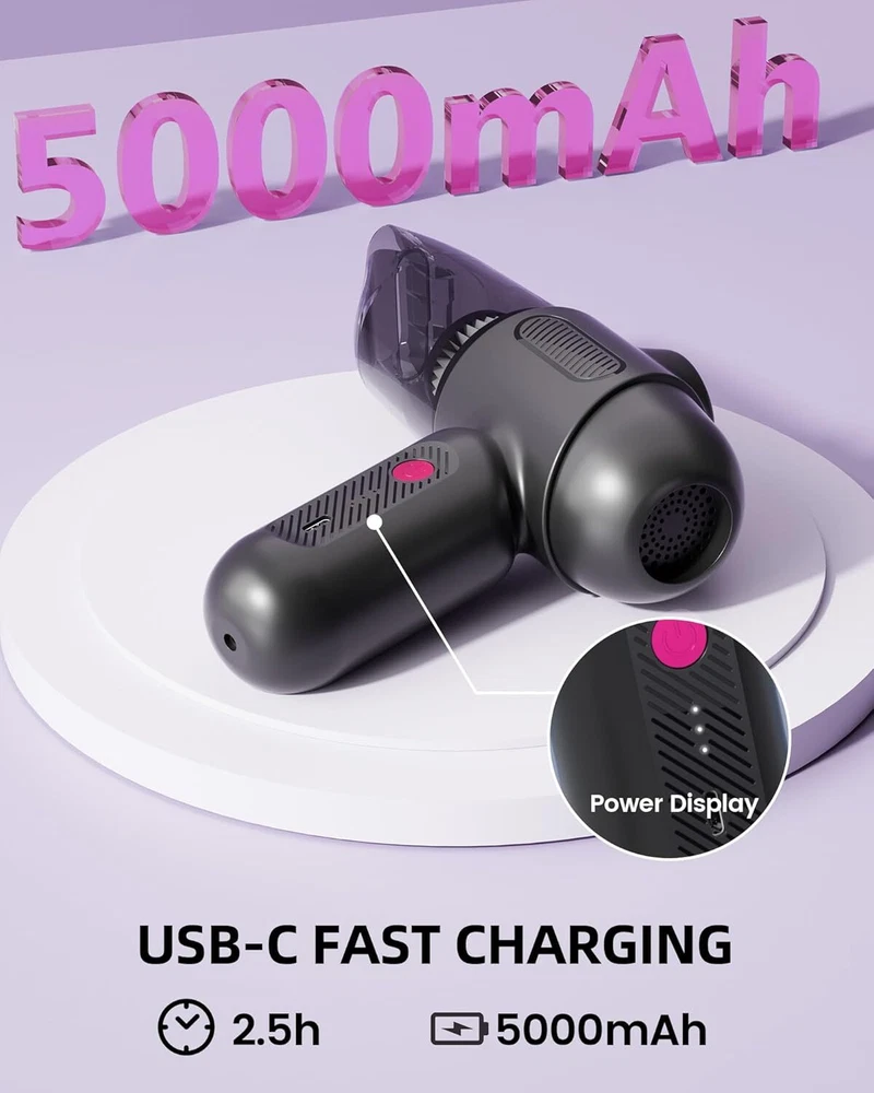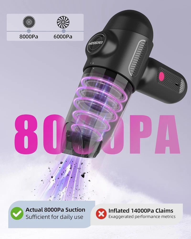 Car Vacuum V6 Pro, Cordless Handheld with 8000Pa Suction, Black Product Details Brand: EBOSSOM Special Feature: Lightweight, Cordless, Compact, Washable Filter, HEPA Filter Type: HEPA Filter Included Components: Inflate nozzle*3, USB-C charging cable*1, User manual, 2 in 1 Suction nozzle*1, Cleaning brush*1, HEPA Replacement*1, EBOSSOM Car vacuum V6 Pro*1 Is Cordless?: Yes Capacity: 180 Milliliters Recommended Uses For Product: Car,Home,Office Form Factor: Handheld Color: Black Model Name: Vacuum Cleaner V6 Pro Product Dimensions: 7.1"L x 2.5"W x 6.6"H Battery Description: Lithium-Ion Manufacturer: Hunan Weilichi Technology Co.,LTD. Number of Items: 1 Controller Type: Push Button Control Method: Touch Portable: Yes Is Electric: Yes Item Weight: 12.3 ounces Item model number: V6 Pro Batteries: 1 Lithium Ion batteries required. (included) Batteries required: Yes Battery type: Lithium-Ion Included Components: Inflate nozzle*3, USB-C charging cable*1, User manual, 2 in 1 Suction nozzle*1, Cleaning brush*1, HEPA Replacement*1, EBOSSOM Car vacuum V6 Pro*1 Inflate nozzle*3, USB-C charging cable*1, User manual, 2 in 1 Suction nozzle*1, Cleaning brush*1, HEPA Replacement*1, EBOSSOM Car vacuum V6 Pro*1Inflate nozzle*3, USB-C charging cable*1, User manual, 2 in 1 Suction nozzle*1, Cleaning brush*1, HEPA Replacement*1, EBOSSOM Car vacuum V6 Pro*1 See more Surface RecommendationPower Source: All floorsBattery Powered VoltageItem Weight: 7.4 Volts0.77 Pounds NOTE: Please fully charge the vacuum before use. Low battery or blocked filters may affect suction, clean the washable filter after each use to ensure the max. suction power. Do not use it on wet surface, keep the device dry. Charge it every 3 months if not used ENLARGED SUCTION OPENING: 1.8" Enlarged suction opening easily offering swider coverage. Speeding up the cleaning process by 30%, making car cleaning simpler and more efficient than ever, saving you time so you can enjoy your day more 8000PA SUCTION FOR REAL: The car vacuum's 8000Pa suction is for real and sufficient for daily use. Eco mode at 6000Pa runs for up to 25 minutes, while fast mode gives you 13 minutes of high-speed cleaning MULTI-SCENE APPLICATION: Not just for cars! Its portable design makes it an excellent companion for quick clean-ups at home or in the office, handling dust, dirt, and debris effortlessly 4-IN-1 SOLUTION: More than a car vacuum, it’s a versatile tool that can inflate swim rings or other inflatables, deflate them for easy storage, and even serve as an air blower to clean your computer. This handheld device is truly multifunctional