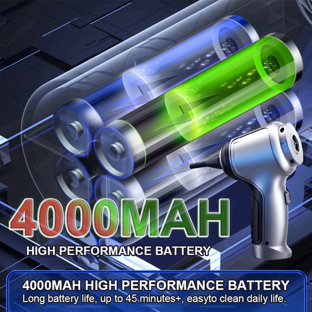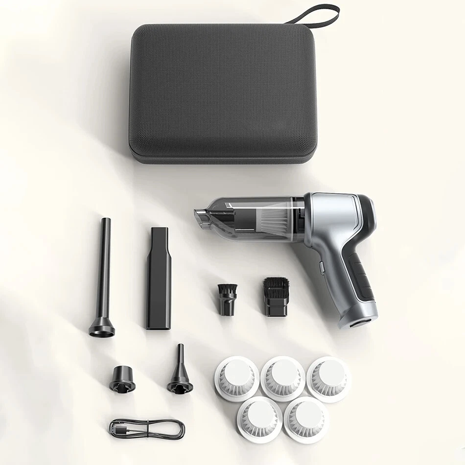 Note:Please charge before use, long press for three seconds to start the machine, and then press again to switch to high gear. Product description: Name: hand-held vehicle vacuum cleaner Color: black grey/silver grey Material: ABS Size: 21 * 16 * 6.5CM Number of gears: 2nd gear adjustment Rated voltage: DC 7.4V/DC 11.1V Vacuum degree: about 13000pa/95000Pa Rated speed: 35500rpm Battery capacity: 2 * 2000mAh Charging mode: 5V USB boost charging cable Rated power: 120W Noise: ≤ 52dB Operating temperature: - 20 ℃~+50 ℃ Product functions:mainly cleaning cars, vacuuming, blowing dust, blowing balloons and so on Product configuration: Basic: 13000Pa vacuum cleaner host * 1, long suction nozzle * 1, flat suction nozzle * 1, coarse suction nozzle * 1, small suction nozzle * 1, charging wire * 1, filter element * 1 Basic 2HEPA: 13000Pa vacuum cleaner host * 1, long suction nozzle * 1, flat suction nozzle * 1, coarse suction nozzle * 1, small suction nozzle * 1, charging wire * 1, filter element * 3 Basic 5HEPA Box:13000Pa vacuum cleaner host * 1, long suction nozzle * 1, flat suction nozzle * 1, coarse suction nozzle * 1, small suction nozzle * 1, charging wire * 1, filter element * 6,EVA BOX*1 Updated PRO(German brushless motor): 95000Pa vacuum cleaner host * 1, long suction nozzle * 1, flat suction nozzle * 1, coarse suction nozzle * 1, small suction nozzle * 1, charging wire * 1, filter element * 1 Updated PRO 2HEPA(German brushless motor): 95000Pa vacuum cleaner host * 1, long suction nozzle * 1, flat suction nozzle * 1, coarse suction nozzle * 1, small suction nozzle * 1, charging wire * 1, filter element * 3 Updated PRO 5HEPA Box(German brushless motor): 95000Pa vacuum cleaner host * 1, long suction nozzle * 1, flat suction nozzle * 1, coarse suction nozzle * 1, small suction nozzle * 1, charging wire * 1, filter element * 6,EVA BOX*1 Comfortable mute use without disturbing Powerful performance but steady voice 1.Optimization of air duct-reducing wind resistance and noise 2.Tight Engagement of Components-Reducing Vibration Noise 3.GEDE BAO Noise Reduction Composite Cotton--Reducing Rotor Vibration Sound 4.Optimization of exhaust pipe-reducing exhaust howling 5.Dynamic balance noise reduction-reducing rotor vibration sound 6.Optimal noise reduction of impeller-reducing air resistance and noise 7.Motor suspension design-reducing resonance noise 8.Motor equipped with brushless motor-reducing rotor friction noise Long-lasting battery life can easily clean up the hygiene in the home car. Dual-core frequency conversion chip can easily handle the cleaning in the car and at home, reasonably release the current under the monitoring and adjustment of intelligent power supply management system, and cooperate with air cooling system to ensure the continuous and excellent operation of battery pack, which can complete the cleaning of a larger area at one time.