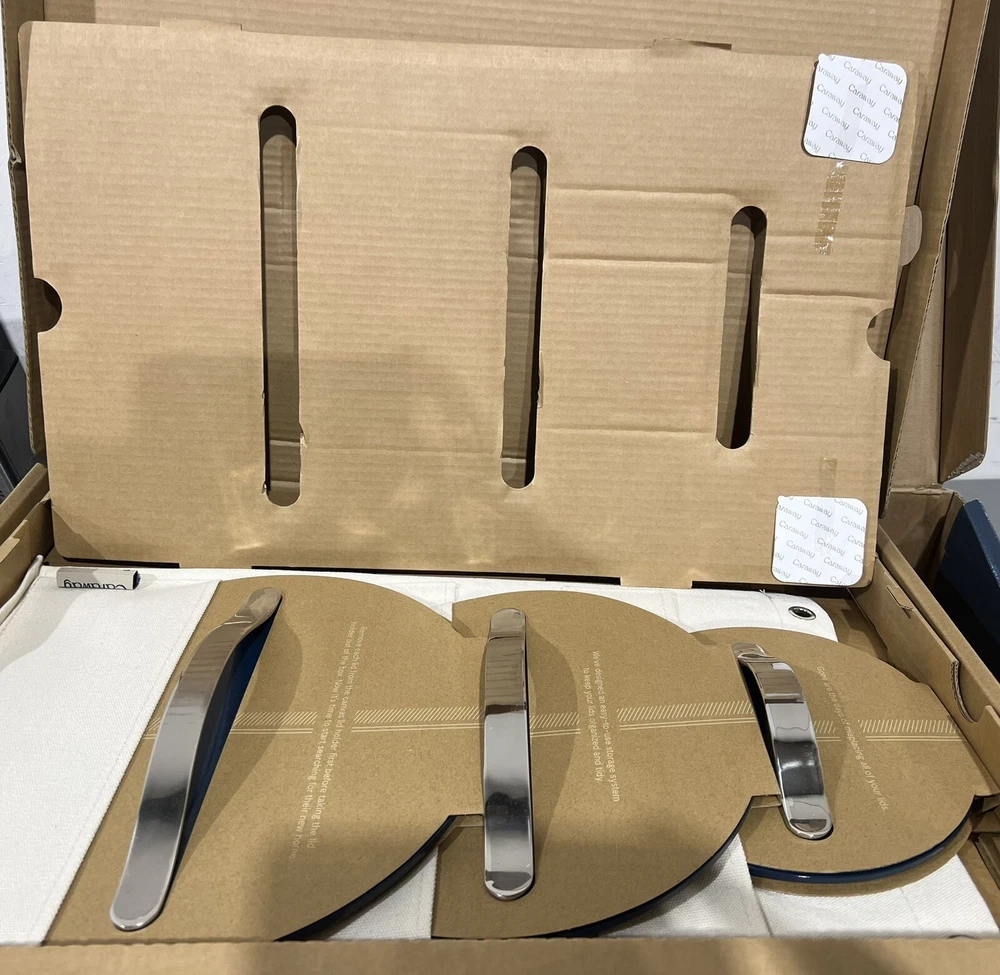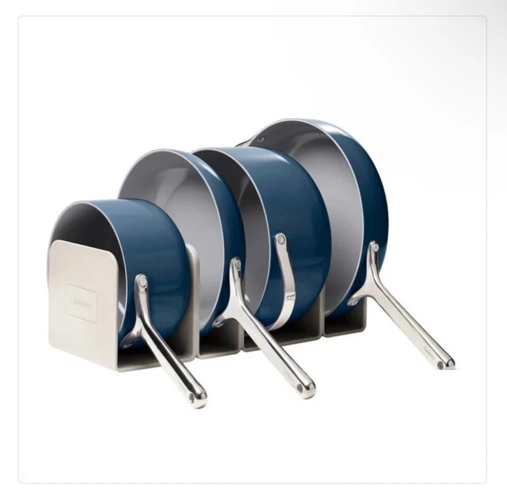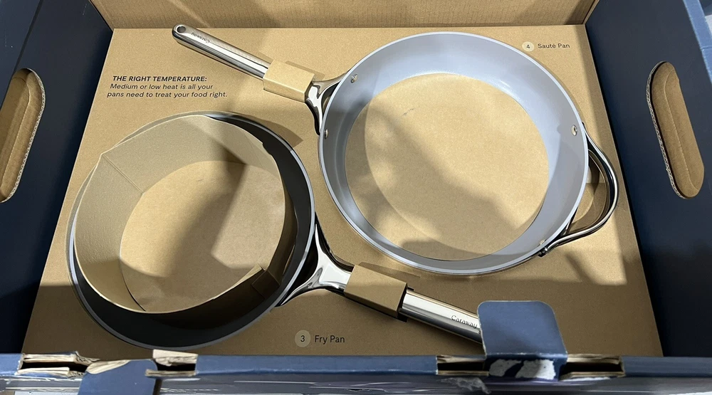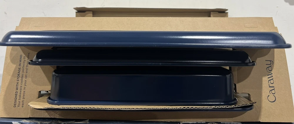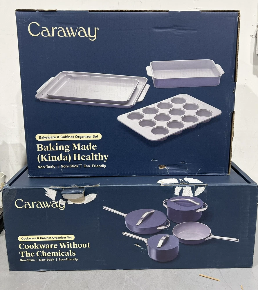 Caraway 11-piece Ceramic Non-Stick Cookware &Bakeware Set NOTE: THIS ITEM IS IN TWO SEPARATE BOXES, WILL BE SHIPPED SEPARATELY TO PREVENT DAMAGE- TRACKING INFORMATION WILL BE PROVIDED FOR BOTH BOXES NEW OPEN BOX, ONLY MISSING TRIVETS Includes: (1) 10.5” Skillet (1) 3qt Saucepan with Lid (1) 4.5qt Sauté Pan with Lid (1) 6.5qt Dutch Oven with Lid (1) Modular Cookware Rack (1) Canvas Lid Holder (1) 18” X 13” Baking Sheet (1) 10” X 15” Baking Sheet (1) 12 Cup Muffin Pan (1) 9” X 13” Rectangular Pan (1) Bakeware Storage Rack All items are inspected , if an item does not arrive to your satisfaction please do not hesitate to reach out to us. We are available 24/7. We do use recycled boxes 📦 to ship items. Thank you for your business! Don’t forget to look at our other listings O-A3