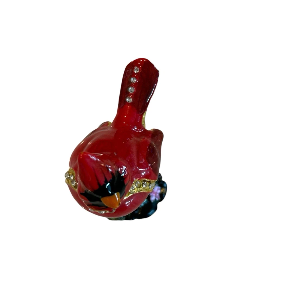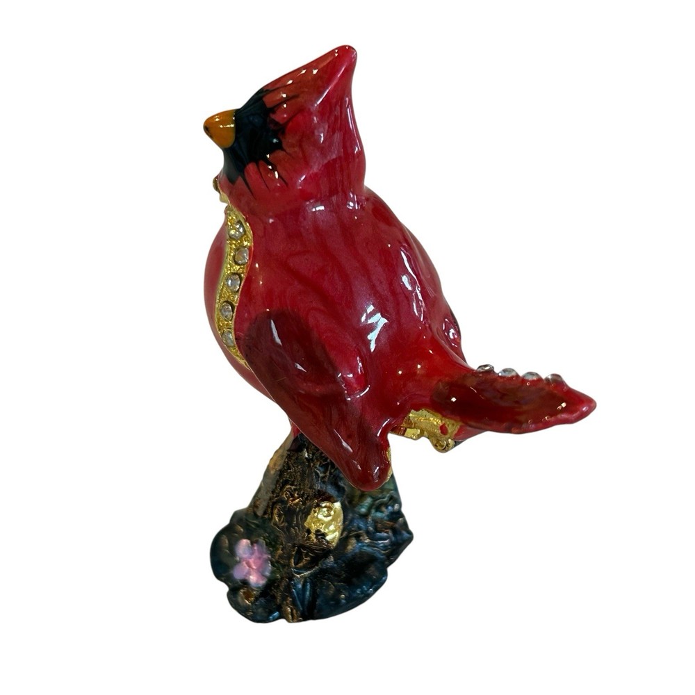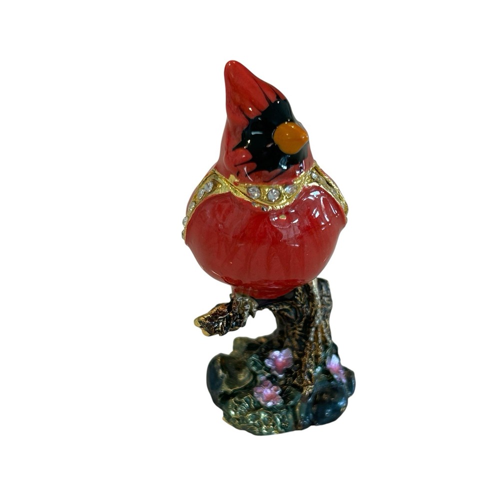 Cardinal Jewelled Trinket Box Magnetic Closure Enameled Floral Rhinestones. Good pre-owned condition with normal wear, small dark spot on beak, small enamel wear spot on front of bird, see photos for details. Measurements in photos and are approximate. (113)