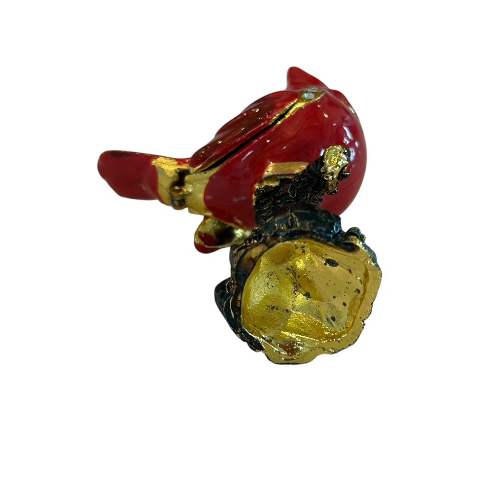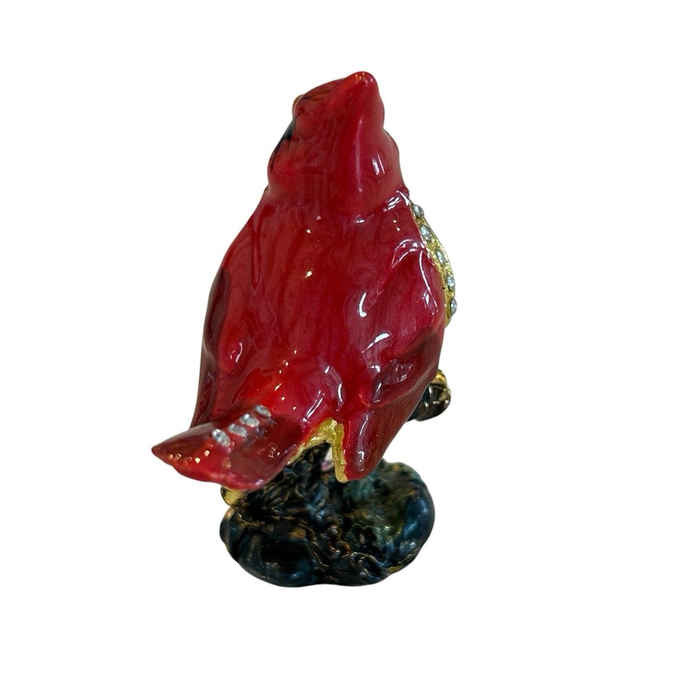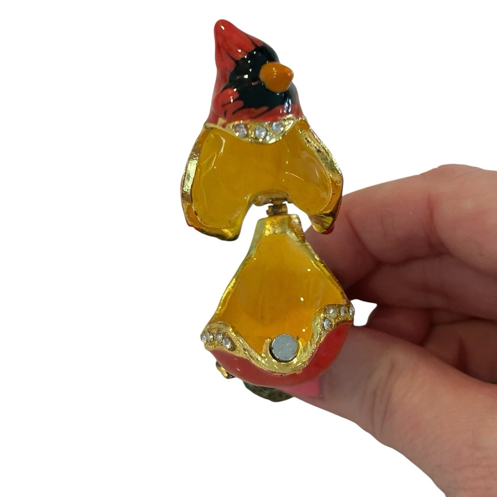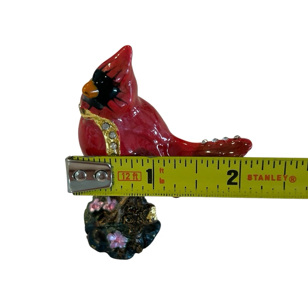 Cardinal Jewelled Trinket Box Magnetic Closure Enameled Floral Rhinestones. Good pre-owned condition with normal wear, small dark spot on beak, small enamel wear spot on front of bird, see photos for details. Measurements in photos and are approximate. (113)