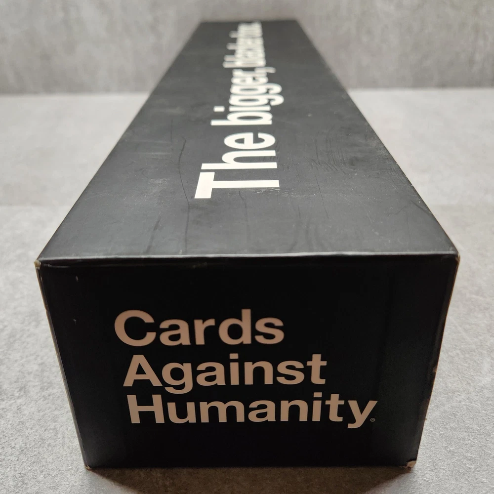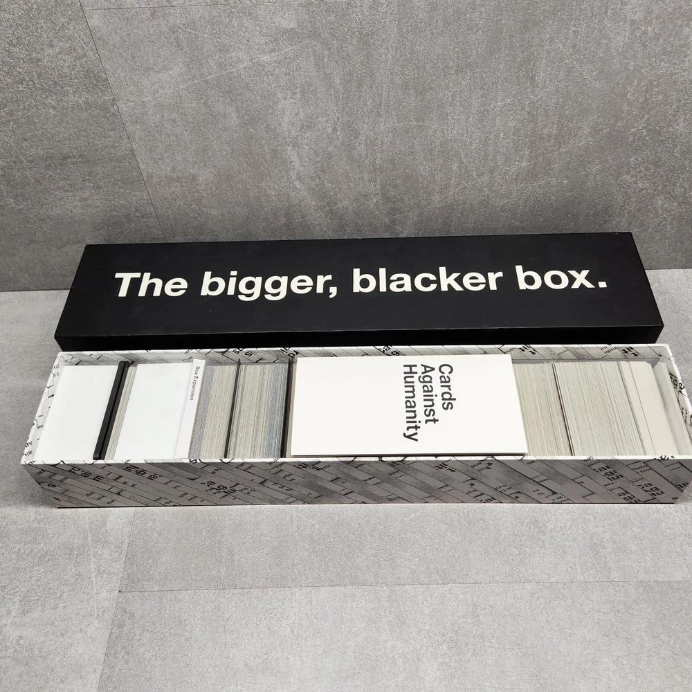 Cards Against Humanity The Bigger Blacker Box Large Storage Case with Expansions Description: Organize your Cards Against Humanity collection with The Bigger, Blacker Box , the ultimate storage case designed to hold the base game and numerous expansion packs. This sturdy, oversized box provides ample space for all your Cards Against Humanity cards, including the base game, expansions, and even more future additions. Key Features: Expansive Storage: Designed to hold the Cards Against Humanity base game and multiple expansions. Durable Construction: Keeps your cards organized and protected. Includes Dividers: Comes with internal dividers to help separate different sets. Essential for Fans: Ideal for dedicated Cards Against Humanity players looking to keep their collection in one place. Condition: Good pre-owned condition. The exterior box shows minor wear, as pictured, but overall structure is solid and ready to organize your card collection. Special Notes: The Bigger, Blacker Box is the perfect accessory for any Cards Against Humanity fan looking to store and organize their growing collection. Great for parties and gatherings where you want all expansions available in one convenient place.