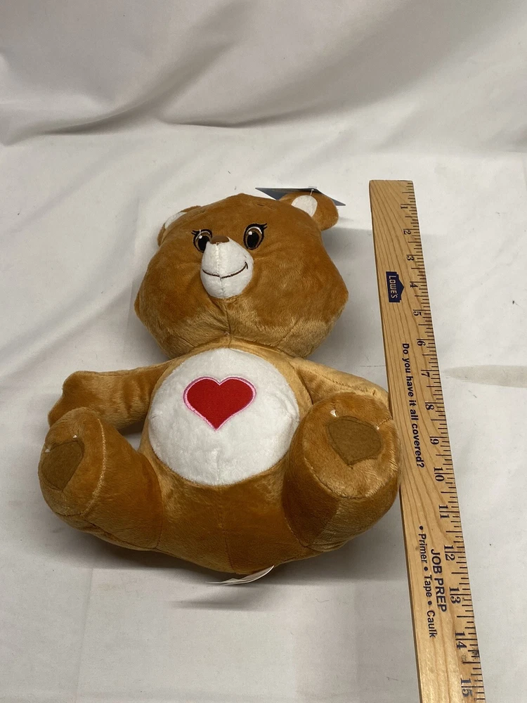This is a Care Bears Tenderheart Bear plush toy measuring 15 inches. It features a red heart on its tummy, is part of the Care Bears franchise, and was manufactured in 2016. This limited edition stuffed bear is surface washable, representing the character Tenderheart Bear. It is a single unit item and not handmade, suitable for all occasions.