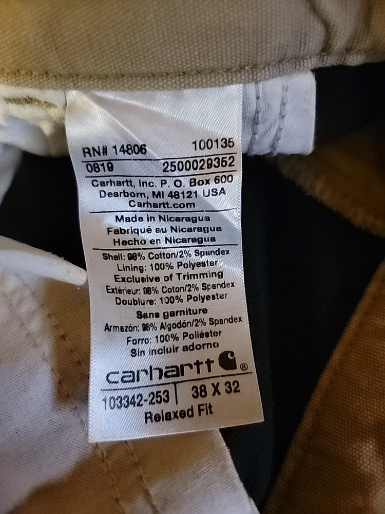 Upgrade your wardrobe with these versatile Carhartt 103342-253 Rugged Flex Lined Relaxed Fit Canvas Pants. Perfect for any occasion, whether it's for work or play, these pants come in a classic khaki tan color and feature a flat front design. The pants are made of a comfortable blend of spandex and cotton fabric, making them machine washable and easy to care for. The pants have a relaxed fit and a straight leg style, with a mid-rise of 10-12 inches and a waist size of 38 inches. They also feature a 5-pocket design with side pockets, providing ample storage space for your essentials. The pants are accented with a Carhartt logo, button, and zipper closure, adding a touch of style to your outfit. These pants are perfect for the fall, winter, and spring seasons and are ideal for outdoor activities.