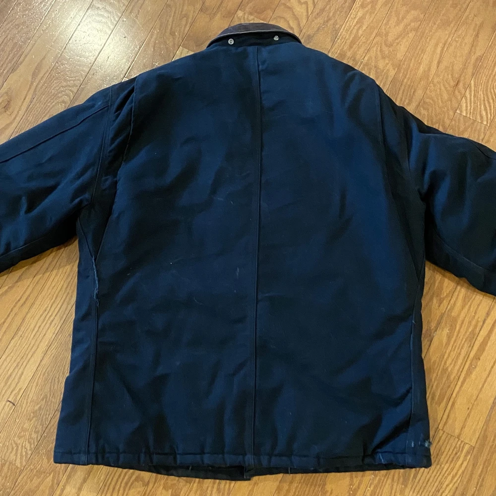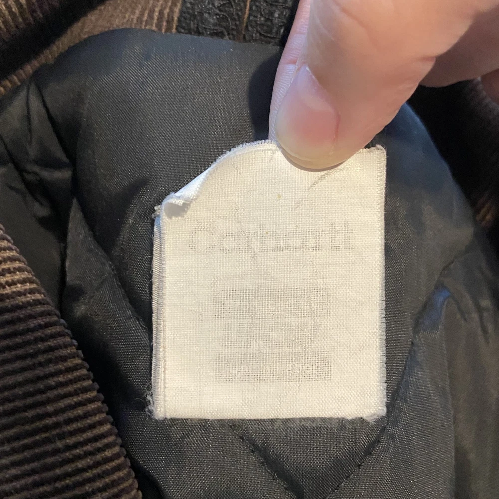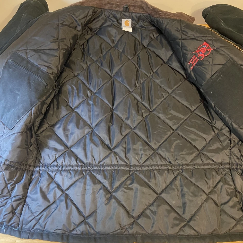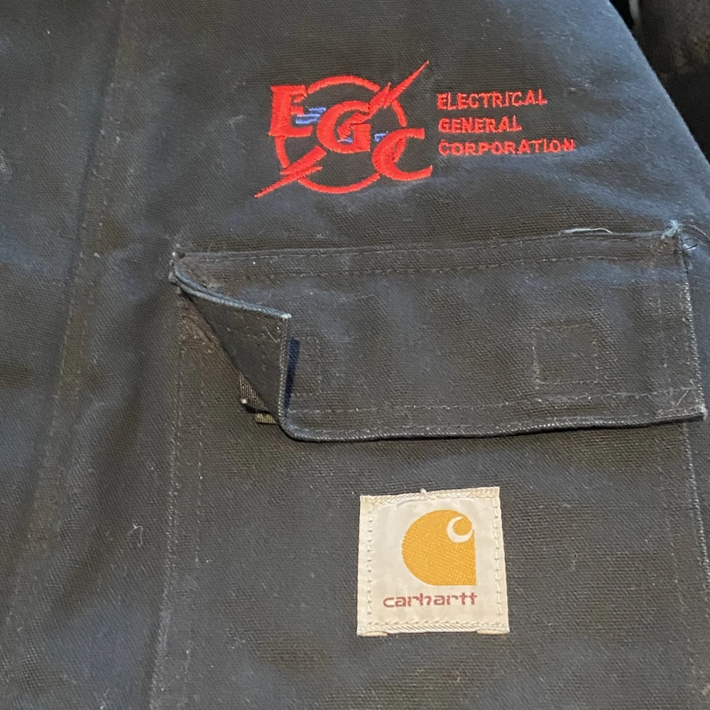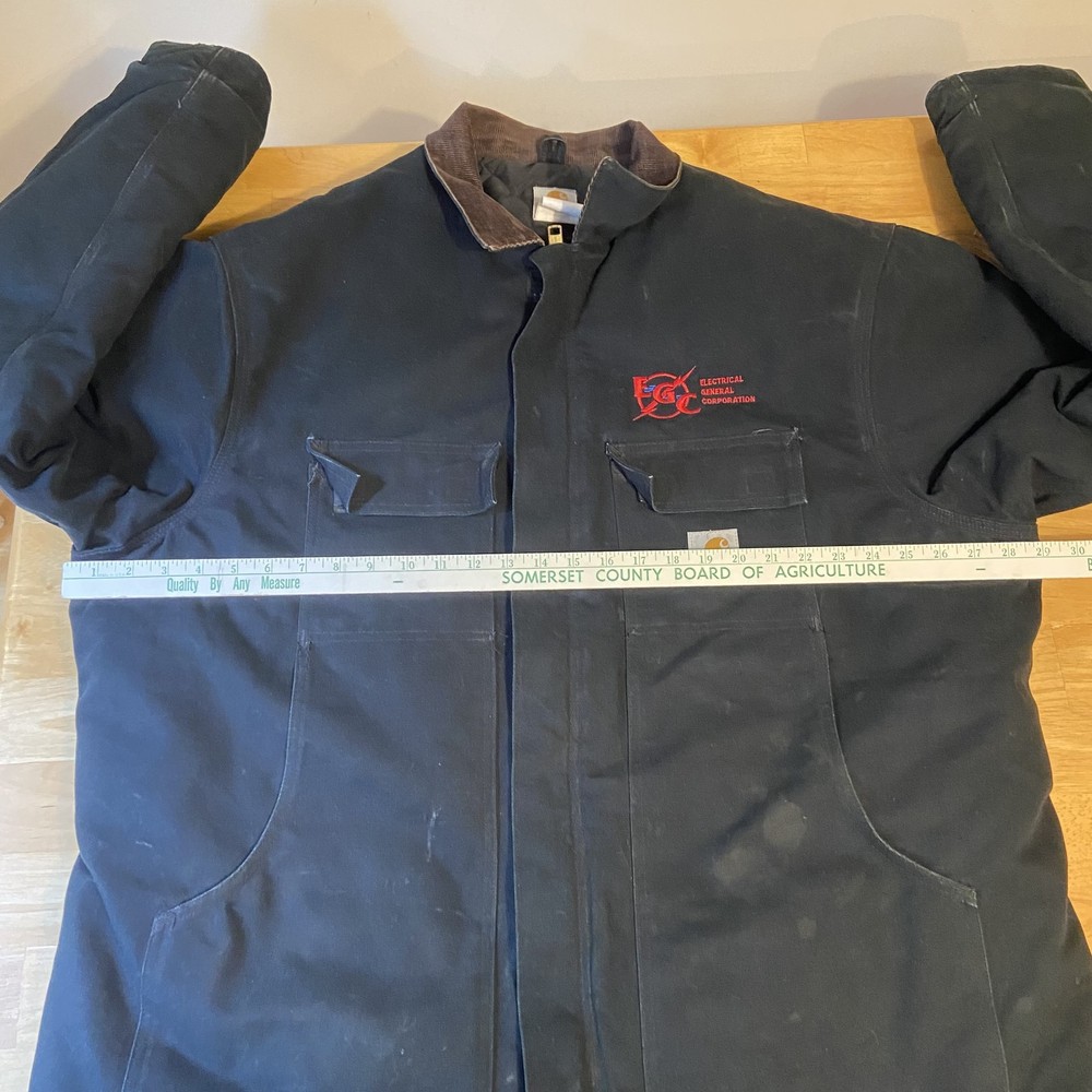 Carhartt Jacket Mens Extra Large Black Quilted Workwear Corduroy Collar EGC Logo Condition: Good pre-owned condition with some signs of moderate wear and a few minor stains and marks present throughout. Notable flaw: There is a section of fraying/wear on the back right side. No major holes or tears. All zippers and snaps function as intended. Shell: Heavyweight, durable outer canvas fabric Lining: Black quilted lining for added warmth Brown corduroy collar with hanging loop Front features two large flap chest pockets and two lower hand pockets Inner includes two large utility pockets (one zip, one open) Embroidered EGC Electrical General Corporation logo on chest Classic Carhartt tag on left chest pocket and inside label Dual brass Carhartt branded zipper with storm flap Heavy-duty ribbed knit inner cuffs Snap buttons at back collar for optional hood attachment (hood not included) Estimated size: Extra Large (XL) - see measurement photos for reference (approx. 29" pit-to-pit, 34" length) Great durable workwear or chore coat, ready for work or casual wear Style code and further details on tags are faded and not fully legible Color: Black with brown collar This is a classic Carhartt cold-weather coat ideal for work or outdoor use
