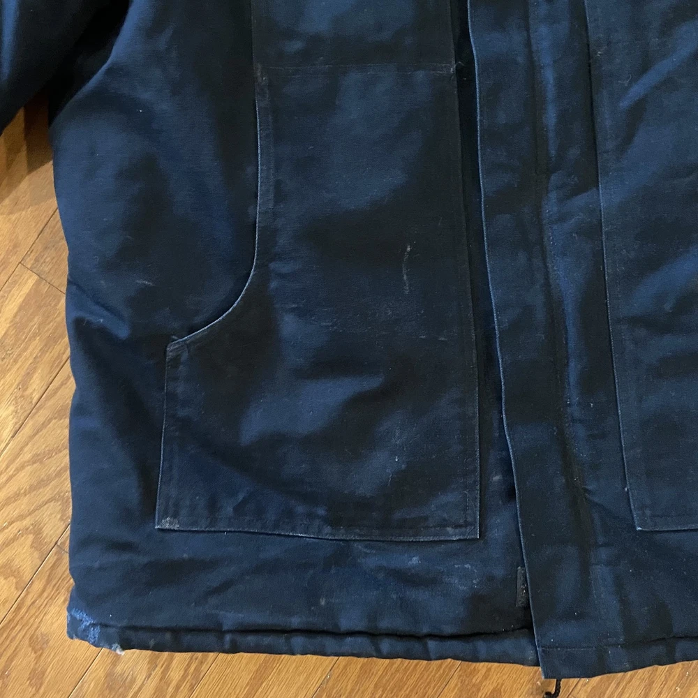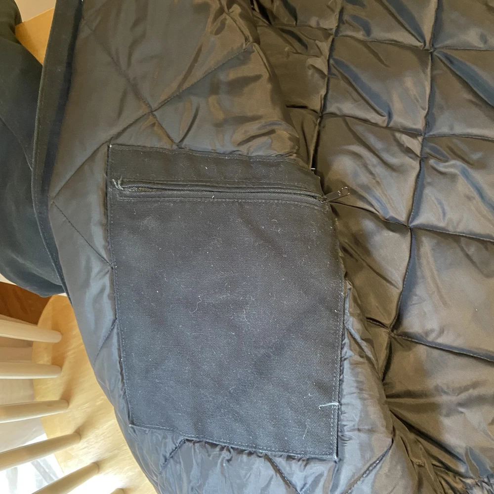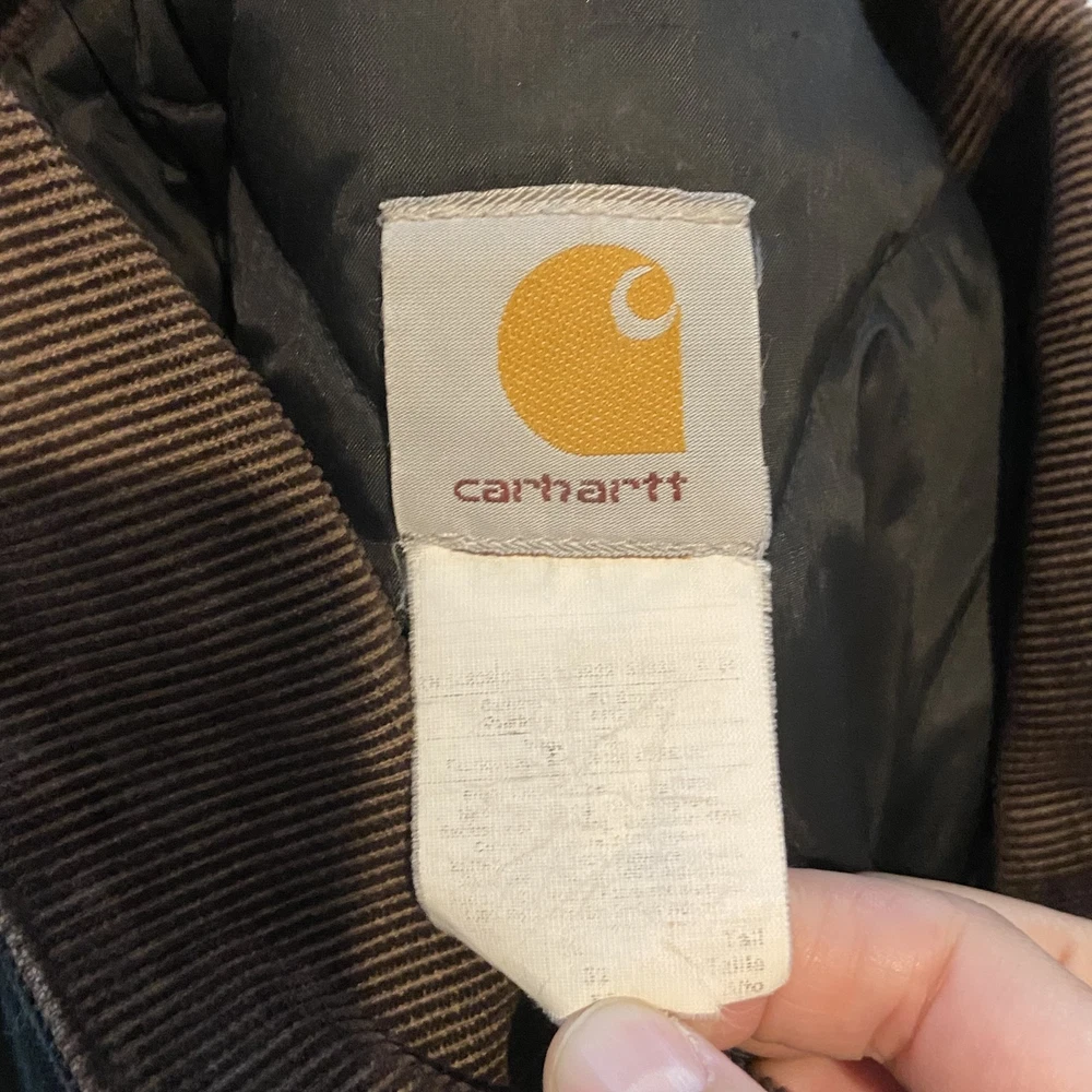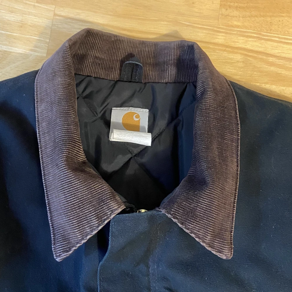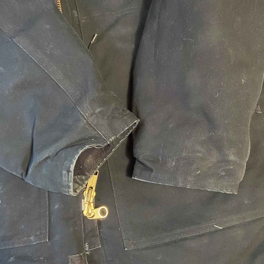 Carhartt Jacket Mens Extra Large Black Quilted Workwear Corduroy Collar EGC Logo Condition: Good pre-owned condition with some signs of moderate wear and a few minor stains and marks present throughout. Notable flaw: There is a section of fraying/wear on the back right side. No major holes or tears. All zippers and snaps function as intended. Shell: Heavyweight, durable outer canvas fabric Lining: Black quilted lining for added warmth Brown corduroy collar with hanging loop Front features two large flap chest pockets and two lower hand pockets Inner includes two large utility pockets (one zip, one open) Embroidered EGC Electrical General Corporation logo on chest Classic Carhartt tag on left chest pocket and inside label Dual brass Carhartt branded zipper with storm flap Heavy-duty ribbed knit inner cuffs Snap buttons at back collar for optional hood attachment (hood not included) Estimated size: Extra Large (XL) - see measurement photos for reference (approx. 29" pit-to-pit, 34" length) Great durable workwear or chore coat, ready for work or casual wear Style code and further details on tags are faded and not fully legible Color: Black with brown collar This is a classic Carhartt cold-weather coat ideal for work or outdoor use