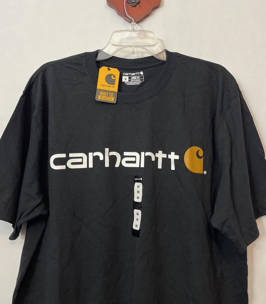 This Carhartt men's t-shirt in size medium is perfect for any outdoor or classic theme. Made of heavyweight cotton material, this shirt is built to last and provide comfort in all seasons. The relaxed fit and collarless design make it a versatile addition to any wardrobe. Featuring a solid black color with the Carhartt logo on the front, this t-shirt is both stylish and functional. The short sleeve and crew neck design make it a great choice for casual wear. Whether you're heading out for a hike or just running errands, this shirt is sure to become a favorite. Length: 31 inches. Chest: 22 inches across laying flat.