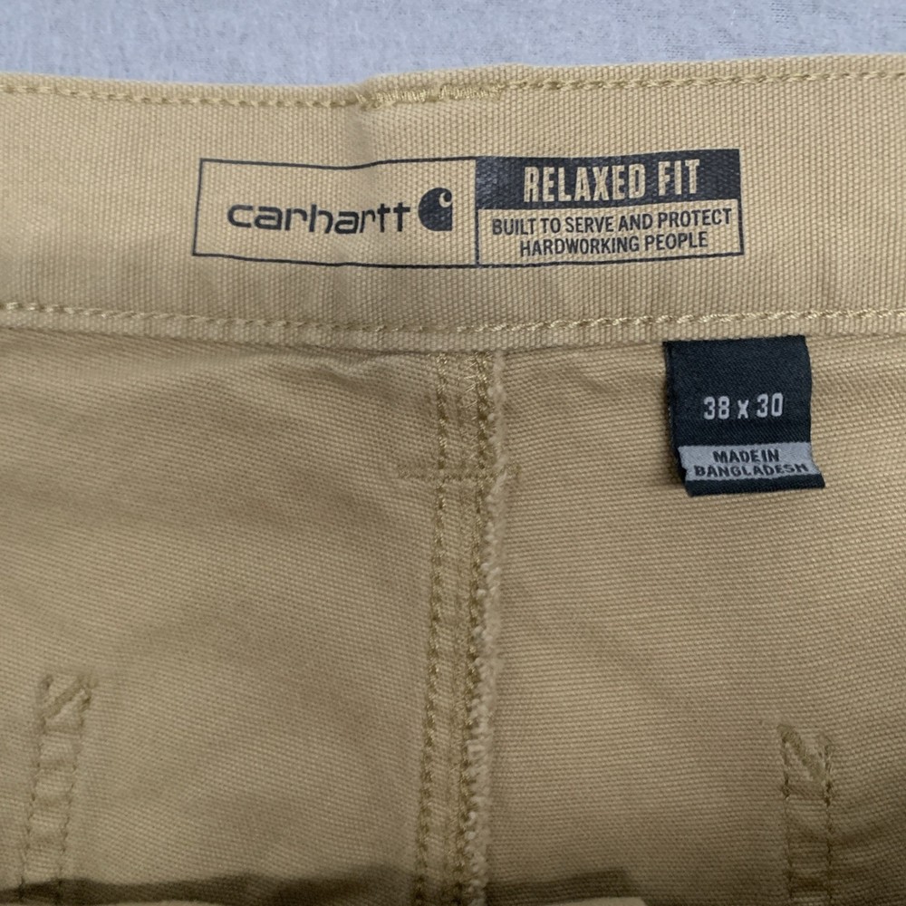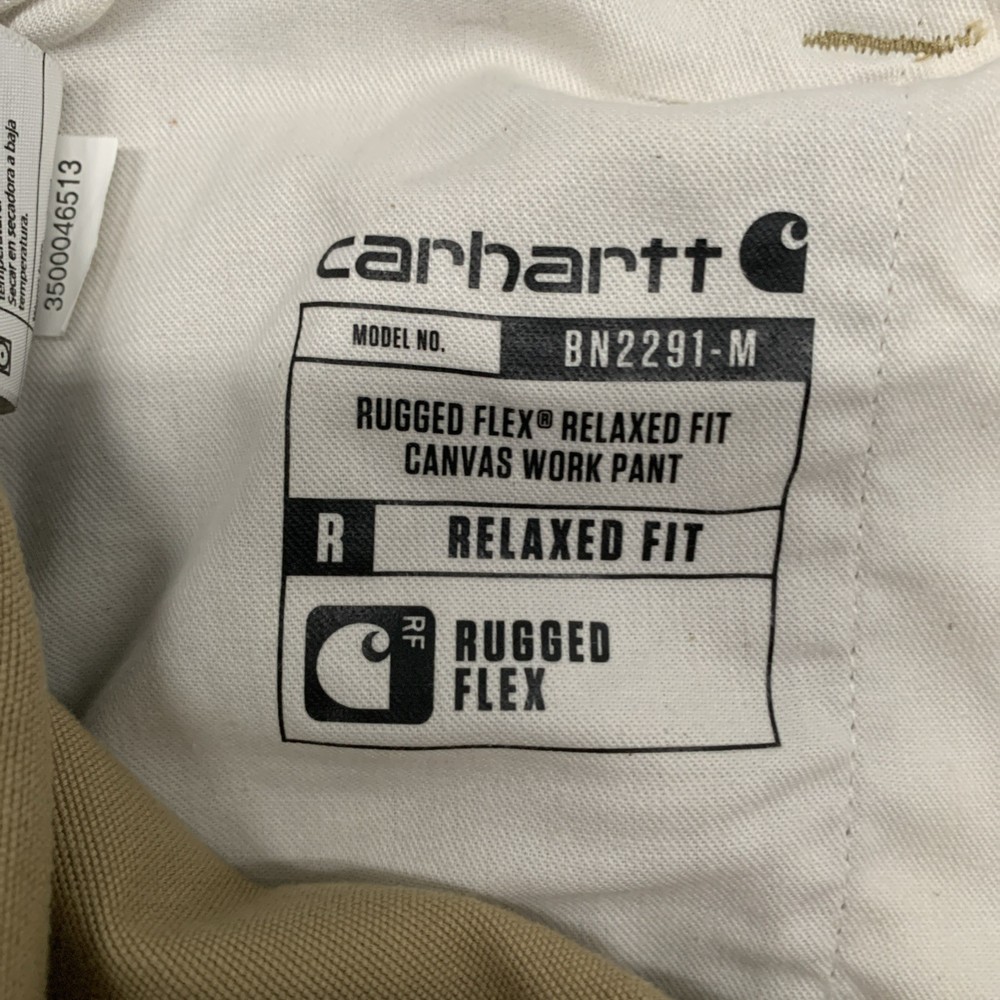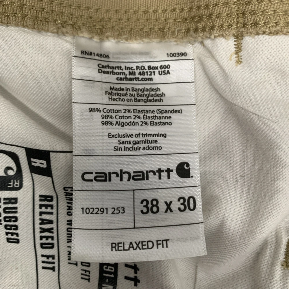 The Carhartt Men's 38x30 Rugged Flex Relaxed Fit Canvas Work Pants in Dark Khaki are designed for durability and comfort. Made from a blend of cotton and elastane, these pants feature a relaxed fit with a mid-rise and straight leg style. The 5-pocket design, zip and button closure, and easy-care fabric make them practical for casual, workwear, and business occasions. The beige color and solid pattern add a versatile touch, while the Carhartt logo accents give them a rugged and authentic look. Perfect for all seasons, these pants are a reliable choice for any man needing a sturdy and stylish bottom wear. Small discoloration mark as pictured.