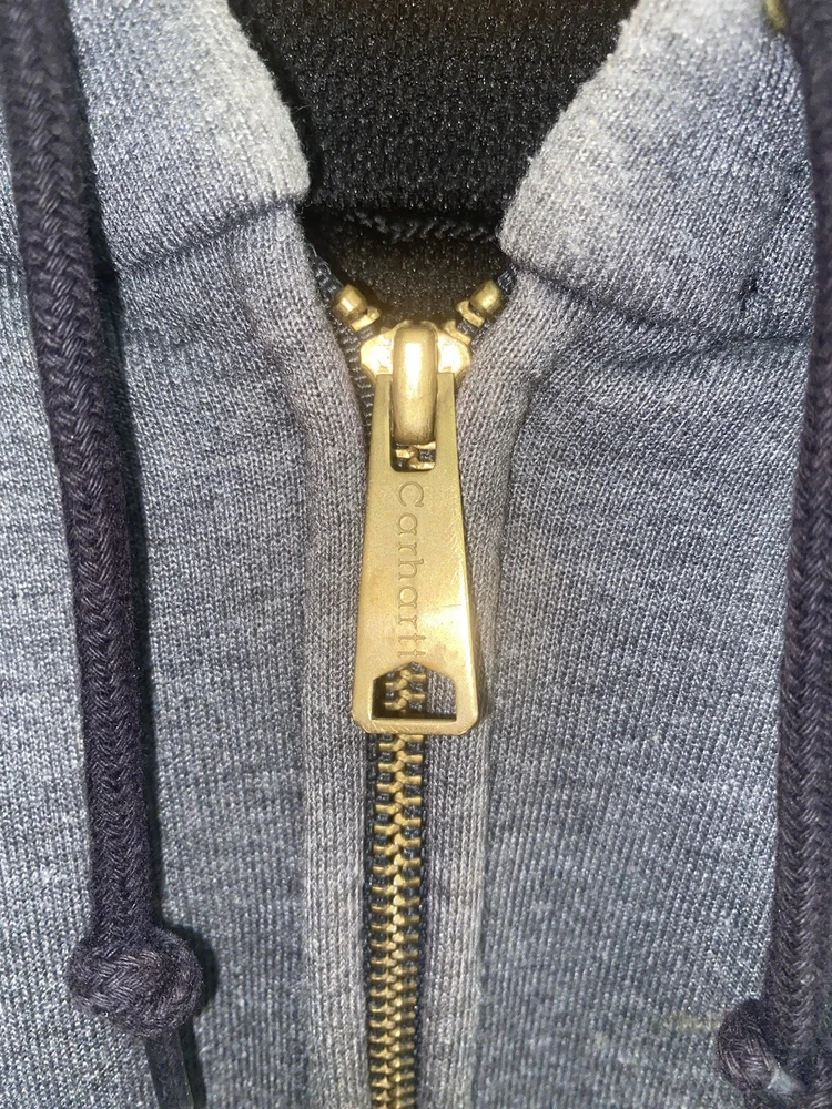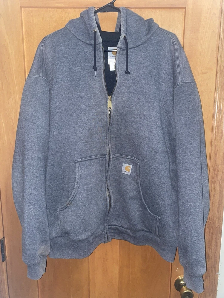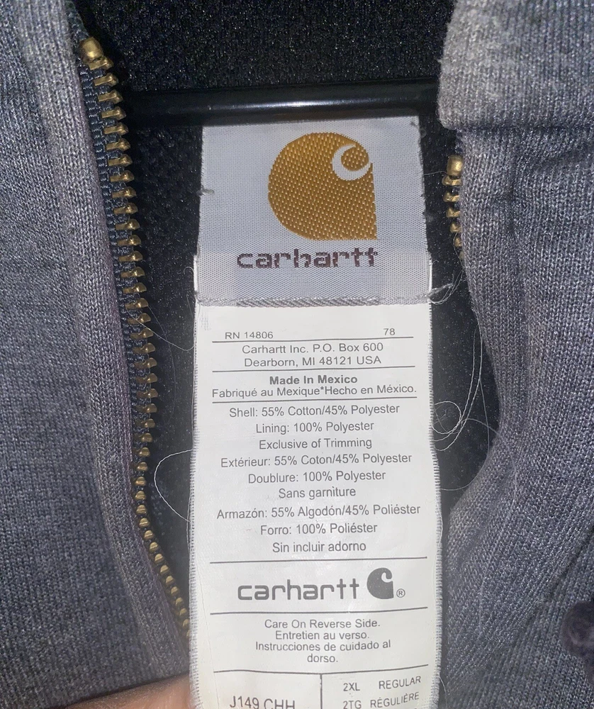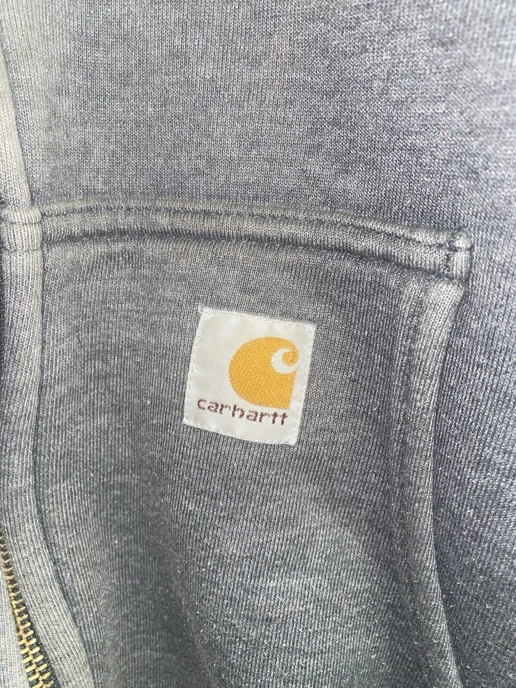 Stay warm and stylish with this Carhartt Men's Thermal Lined Rain Defender Zip Hoodie in Gray. Made of a comfortable blend of polyester and cotton fleece, this sweatshirt features a full zip closure and long sleeves to keep you cozy during the colder seasons. The hoodie also has a Carhartt logo accent on the front and a zipper closure for added style. Good condition Signs of wear Pit to pit: 31 inches Length without hood: 29 inches Sleeves: 25 inches Shell: 55% cotton and 45% polyester Lining: 100% polyester Polyester fleece lining for warmth Rain Defender® durable water repellent (DWR) keeps you dry and moving in light rain Loose fit Full-zip front with brass zipper Attached, thermal-lined three-piece hood with drawcord closure Spandex-reinforced rib-knit cuffs and waist help keep out the cold Two front handwarmer pockets with flaps for added security Hidden media pocket Inside pocket with zipper closure Locker loop Smoke-free home Perfect for outdoor activities like walking or gym training, this sweatshirt has a regular fit and is available in size 2XL. Its solid pattern and classic 90s theme make it a versatile addition to your wardrobe. Get your hands on this Carhartt product line and stay warm and stylish all year round.