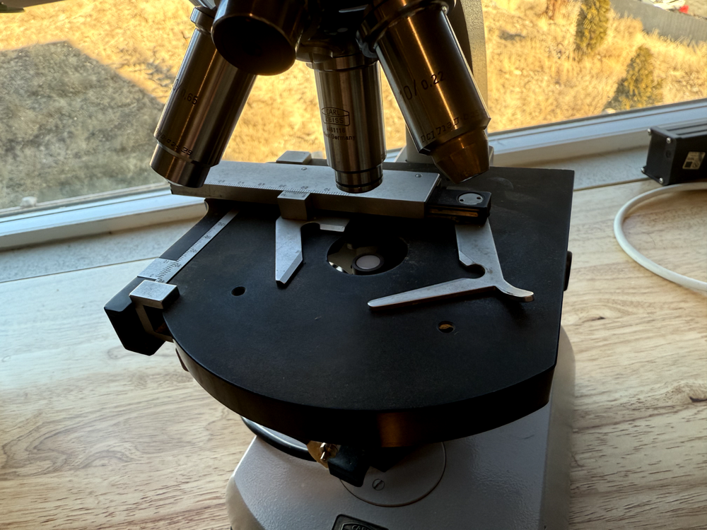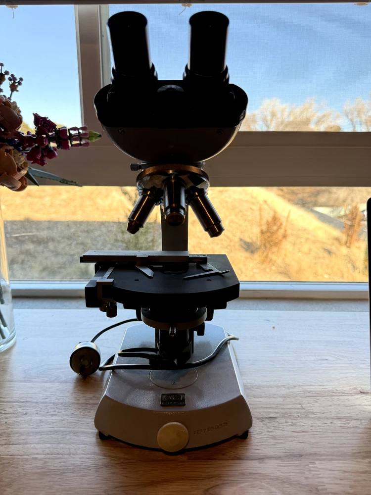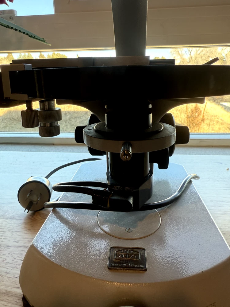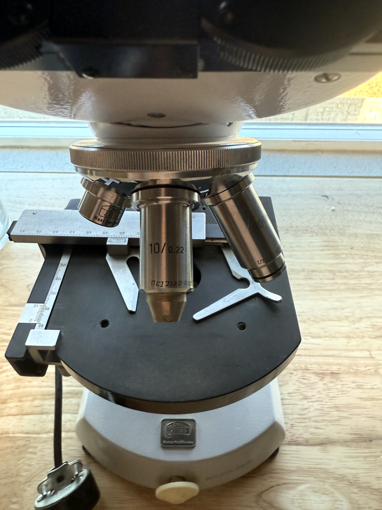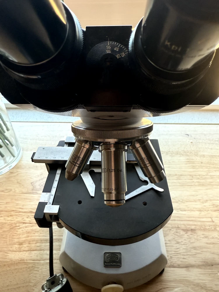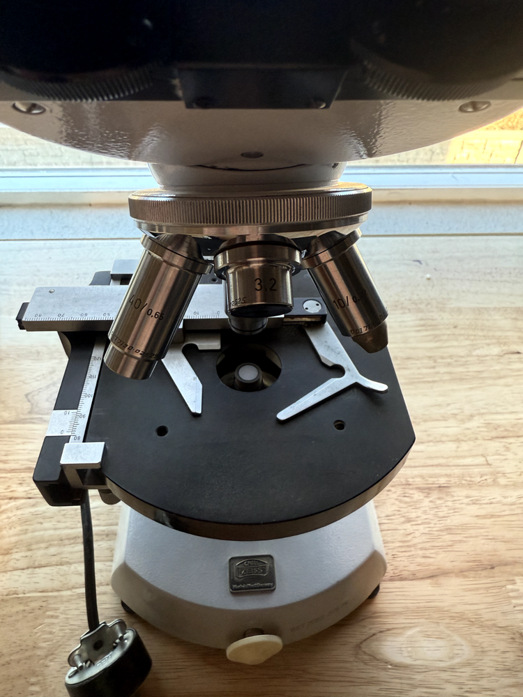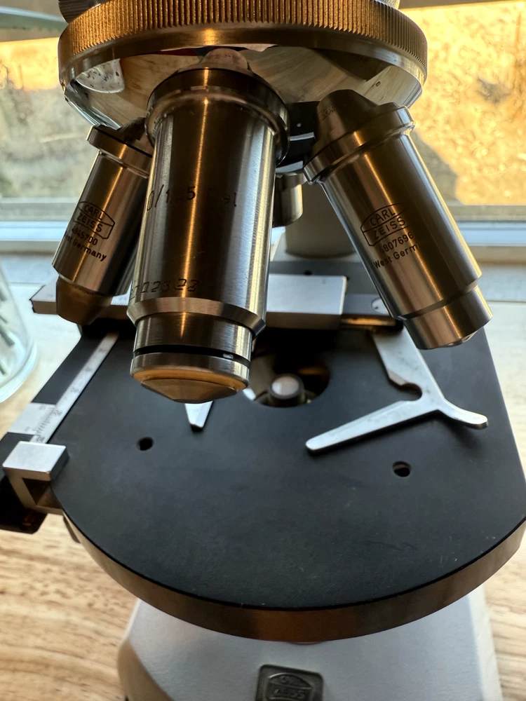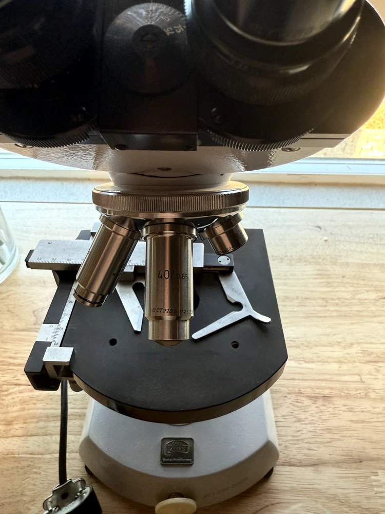 Carl Zeiss microscope, binocular + 4 objectives. All in good working condition Made in West Germany Head: Binocular Eyepiece: 10x Eyepieces Nosepiece Quadruple Focusing: Coaxial coarse & fine adjustment Stage: Mechanical Stage Objectives: 3.2x, 10x/0.22, 40x/0.65, 100x/1.25 Oel Light Source: Variable illumination