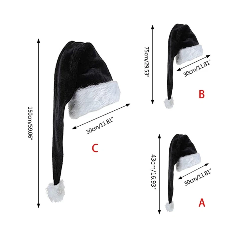 Features: Perfect decoration prop headwear for party costume to create a pleasant and interesting Great costume accessories for Christmas, Cosplay Party, Birthday party, Soft comfortable fabric to protect your for head and hair without irritation or sweat! Hand washable,not allergical and eco-friendly. You and your family will love it. The Christmas hats hat is perfect for most adult,women and men. Great gifts for and families. The Santa hat brings a nice in the Christmas, the child's interesting gift. The Santa hat with thickened design lining can keeps warm in cold. The absorb sweat lining makes it comfortable to wear and won’for t let you embarrassed when you take the Xmas hat off. You will feeling warm and happy in the New Year. The Christmas hats with for creative black and white, hand-wash needed, it's super comfortable for long term wear. Workmanship ensures the Santa hats last for many seasons to come. Specifications: Material: Plush Size: Approx. 30x45cm/ 11.81x17.71in, 30x75cm/ 11.81x29.52in, 30x150cm/ 11.81x59.05in Type: 45cm, 75cm, 105cm Package Includes: 1pc Christmas Hat note: Please allow 1-2cm errors due to manual measurement, make sure that you do not mind before you order. 2. Due to the difference between different monitors, the picture may not reflect the actual color of the item.