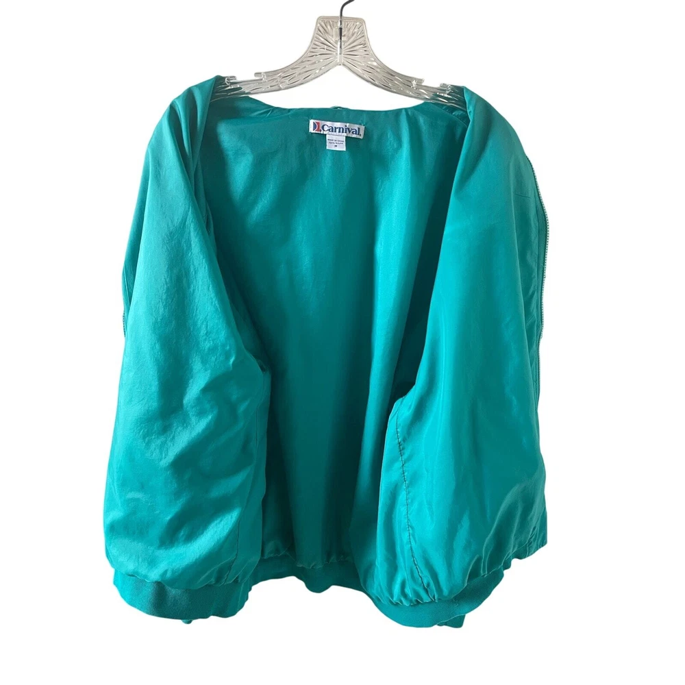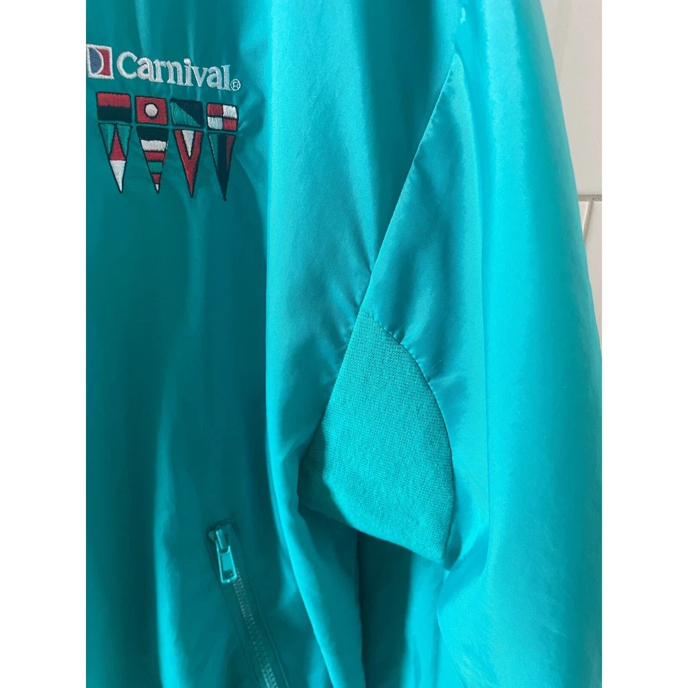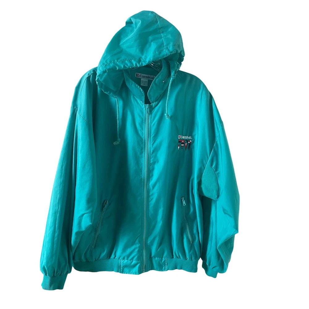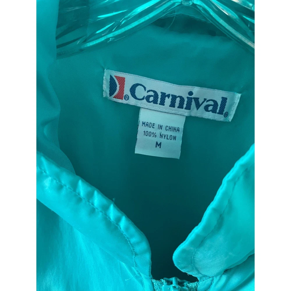 Pre-owned in very good condition. Vintage Carnival Cruise line and nautical flags logo at left chest 100% nylon Fully lined Zippered hand pockets Hood can be rolled up and zipped into neckband Ribbed knit cuffs, armpits and hem Men's size M Measures approximately: 24.5" pit to pit and 27" in length