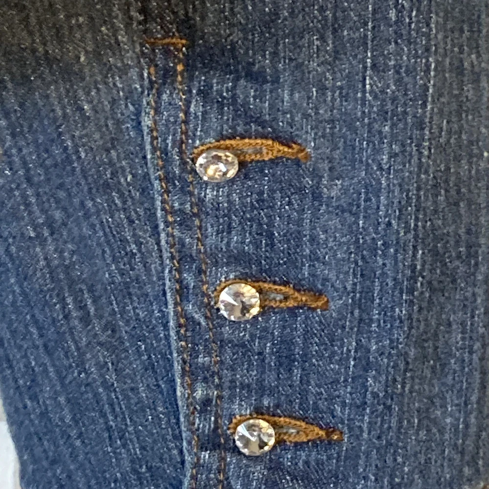 Add some bling to your maternity wardrobe with this Carole Little Jean Jacket. The rhinestone button-front adds a touch of glamour to this stylish jacket, while the blue cotton blend fabric ensures comfort for you and your growing bump. The jacket features a button closure and is a size L, perfect for any mom-to-be looking to stay fashionable during her pregnancy. The jacket's style is a classic jeans jacket, with accents of rhinestone that make it stand out. Don't miss out on this gorgeous addition to your maternity wardrobe. 97% Cotton, 3% Spandex Machine Wash Bust: 46 inches Length: 25 inches Sleeves: 24 inches
