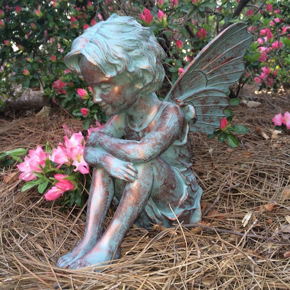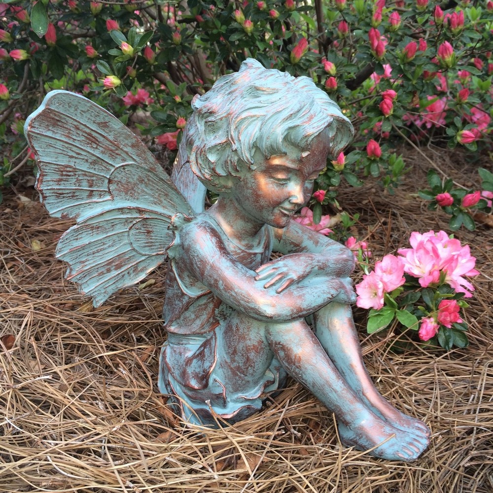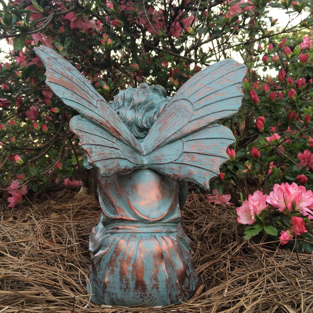 Suffolk Fairies heirloom statuary design known for detailed sculpting in face, hands, wings, hair, cloths Beautifully hand painted then finished in a elegant patina bronze finish Weather resistant polyresin and fiberglass mix for long-lasting durability and stability We recommend that all products (metal, fabric, wood, cement, polyresin,) placed outdoors be sprayed each year with a clear coat of UV Garden Décor protection spray to preserve their original appearance and to extend the life of your garden friends
