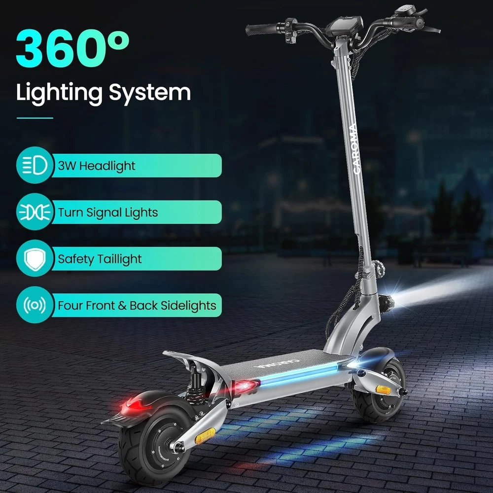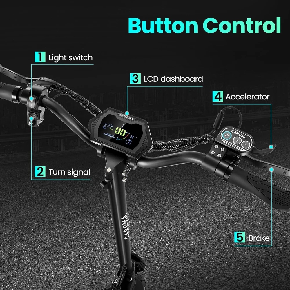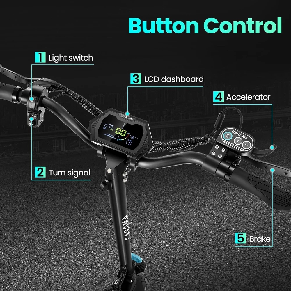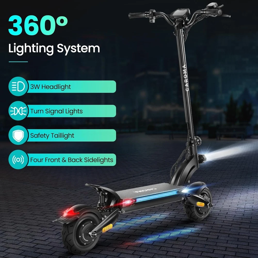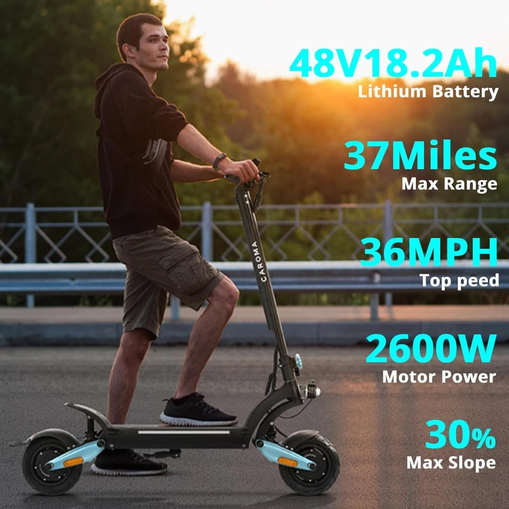Product Description About this item High Performance Off Road Electric Scooter: The Caroma off-road electric scooter for adults is equipped with 2600W motor (rated 1600W) and an impressive top speed of 36 MPH. 2600W motor makes it easier for riders to conquer challenging terrains, effortlessly overtakes traffic, and navigate the city streets and 30° slope. Max load up to 330 lbs Superior Dual Shock Absorption: Front and rear shock-absorbing rocker arms and 8.5” fat off-road tires transform every ride into an enjoyable experience. No matter the road conditions, you'll glide smoothly and joyfully Long Life Battery: The high-capacity 48V 18.2Ah battery elevates your riding experience with an extraordinary range of up to 37 miles on a single charge. Dual charging ports reduce charging time from 8 hours to 4 hours. Whether you're off-road riding, commuting to work or city walking, this adult electric scooter ensures you reach your destination without worry Superior Dual Hydraulic Braking System: Safety is paramount. Front and rear full hydraulic disc brakes controlled by two EABS brake provide unparalleled stopping power in all conditions. Whether you're navigating crowded urban streets or navigating steep downhill slopes, you can rely on the e scooter for adults responsive brakes to keep you safe Advanced 360° Lighting System: Illuminate your path and make a statement with Caroma dual motor electric scooter for adults all-around lighting system. Powerful headlight pierces through the darkness, while two fisheye lights and side light add flair to your night-time rides. Taillight and two turn signals enhance visibility, making sure you stay safe and stand out during nighttime adventures Safety: The product is UL 2272 certified