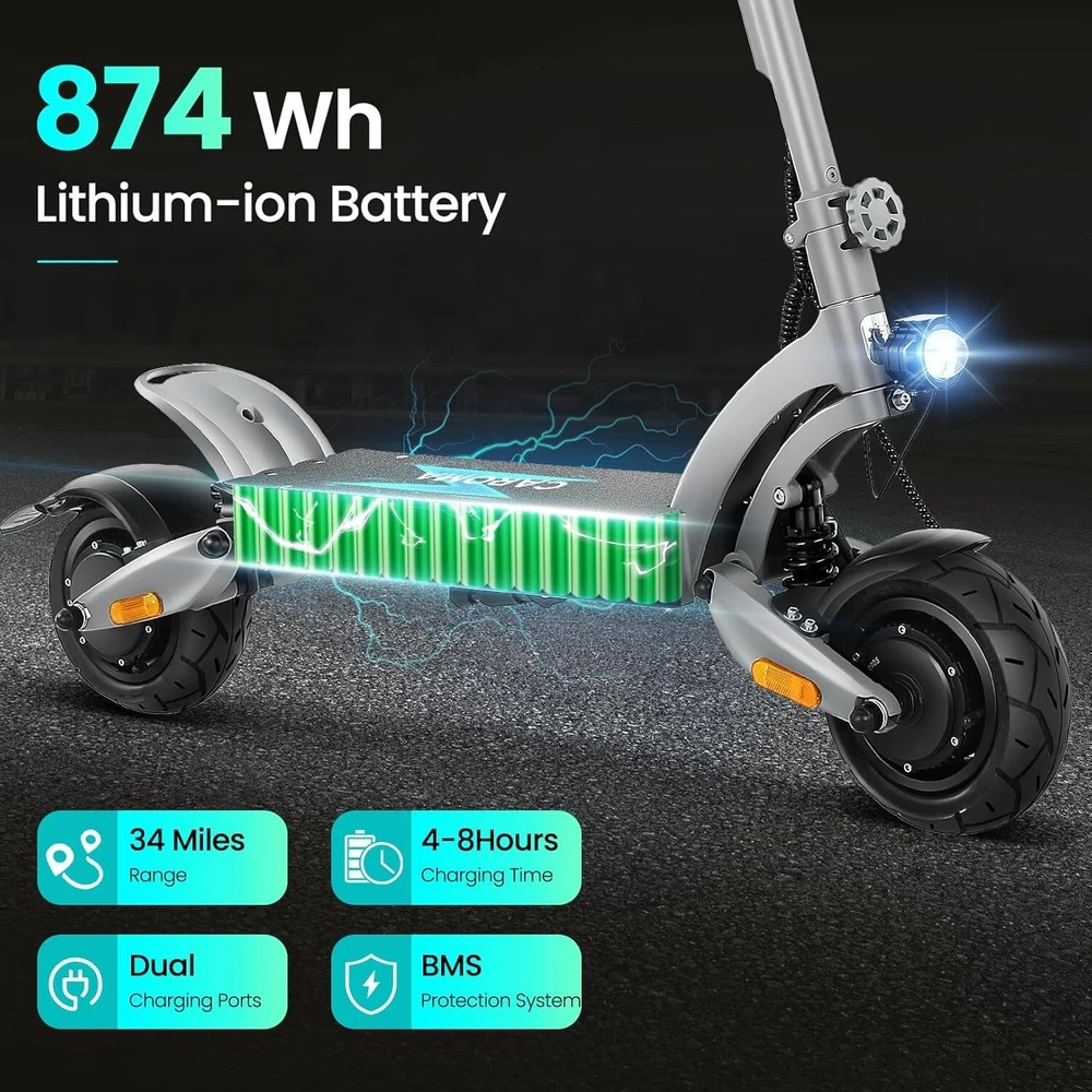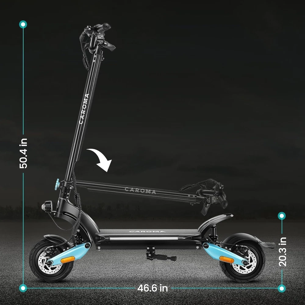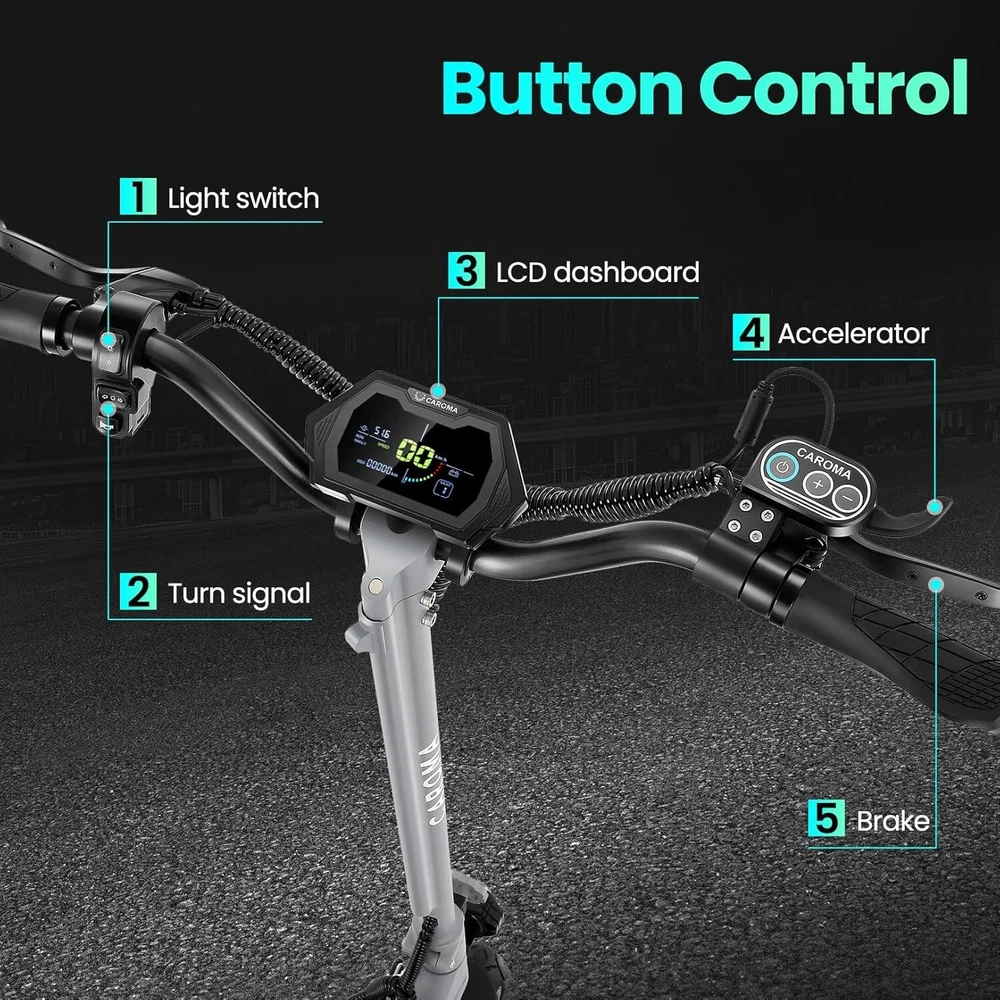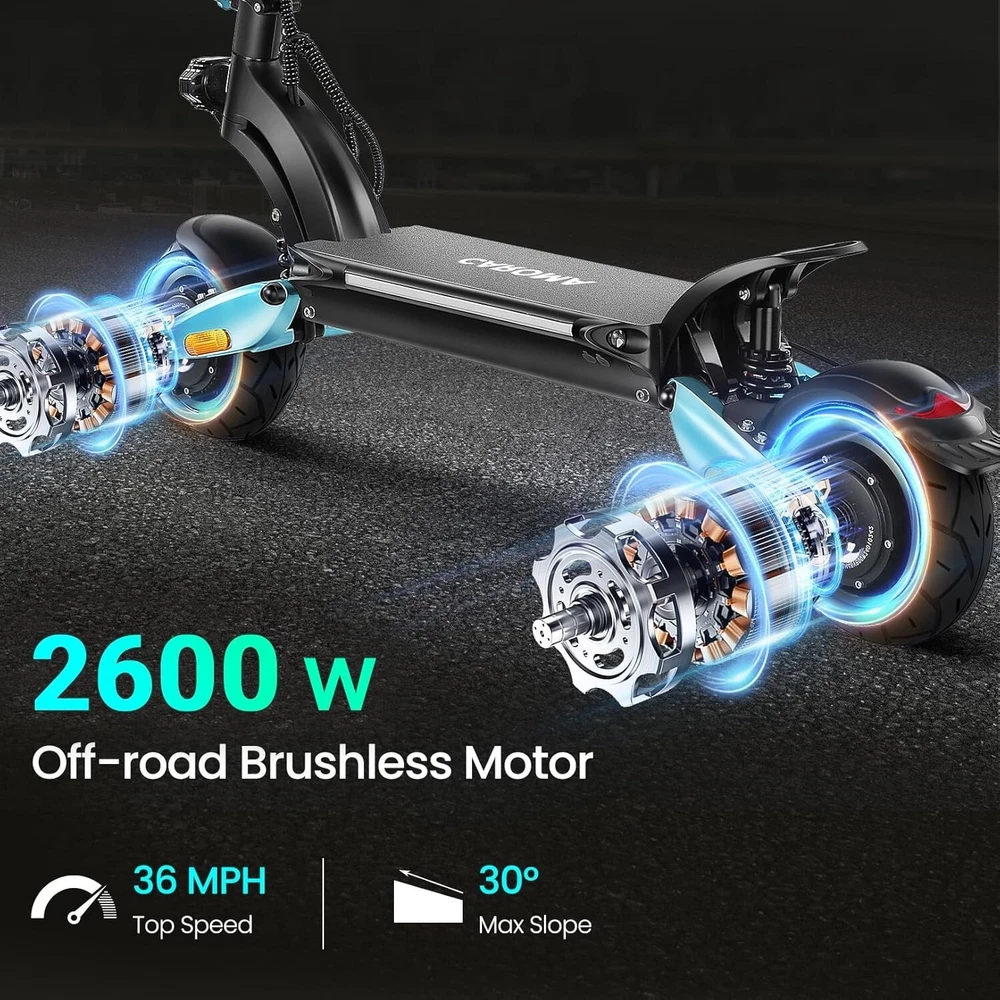 Product Description About this item High Performance Off Road Electric Scooter: The Caroma off-road electric scooter for adults is equipped with 2600W motor (rated 1600W) and an impressive top speed of 36 MPH. 2600W motor makes it easier for riders to conquer challenging terrains, effortlessly overtakes traffic, and navigate the city streets and 30° slope. Max load up to 330 lbs Superior Dual Shock Absorption: Front and rear shock-absorbing rocker arms and 8.5” fat off-road tires transform every ride into an enjoyable experience. No matter the road conditions, you'll glide smoothly and joyfully Long Life Battery: The high-capacity 48V 18.2Ah battery elevates your riding experience with an extraordinary range of up to 37 miles on a single charge. Dual charging ports reduce charging time from 8 hours to 4 hours. Whether you're off-road riding, commuting to work or city walking, this adult electric scooter ensures you reach your destination without worry Superior Dual Hydraulic Braking System: Safety is paramount. Front and rear full hydraulic disc brakes controlled by two EABS brake provide unparalleled stopping power in all conditions. Whether you're navigating crowded urban streets or navigating steep downhill slopes, you can rely on the e scooter for adults responsive brakes to keep you safe Advanced 360° Lighting System: Illuminate your path and make a statement with Caroma dual motor electric scooter for adults all-around lighting system. Powerful headlight pierces through the darkness, while two fisheye lights and side light add flair to your night-time rides. Taillight and two turn signals enhance visibility, making sure you stay safe and stand out during nighttime adventures Safety: The product is UL 2272 certified