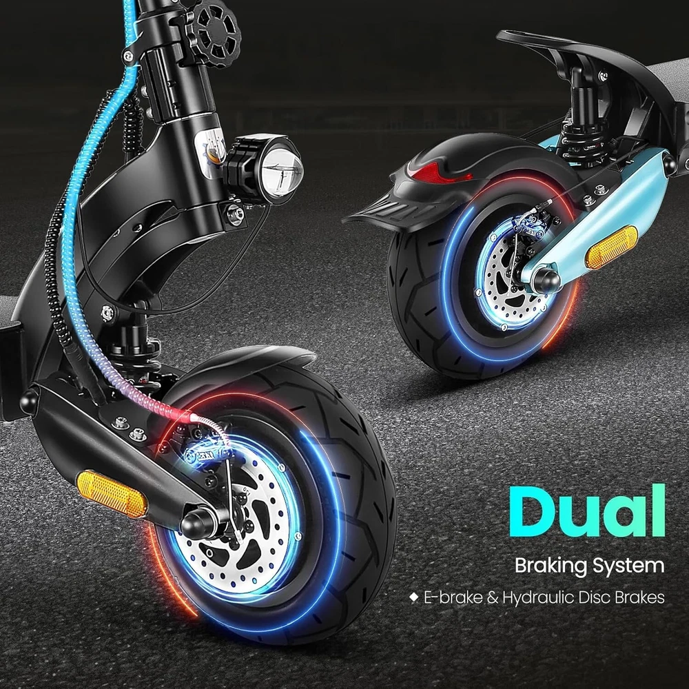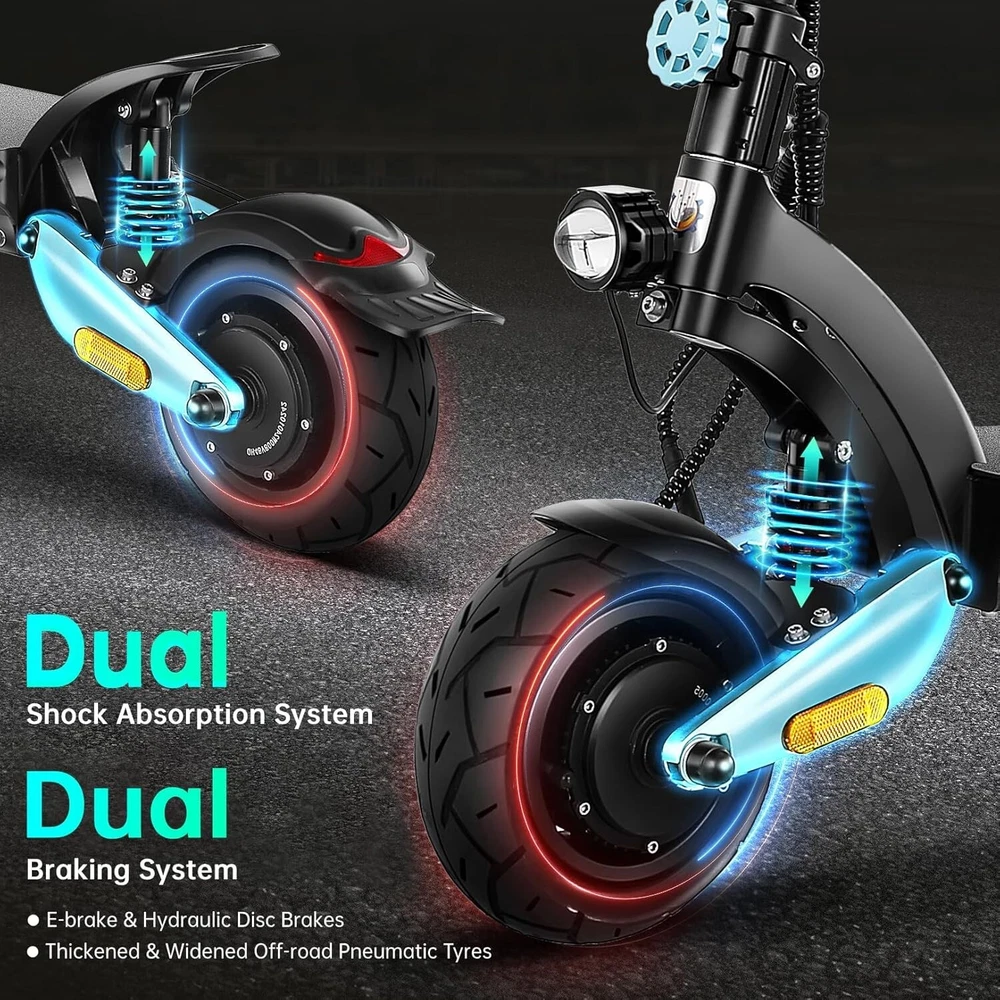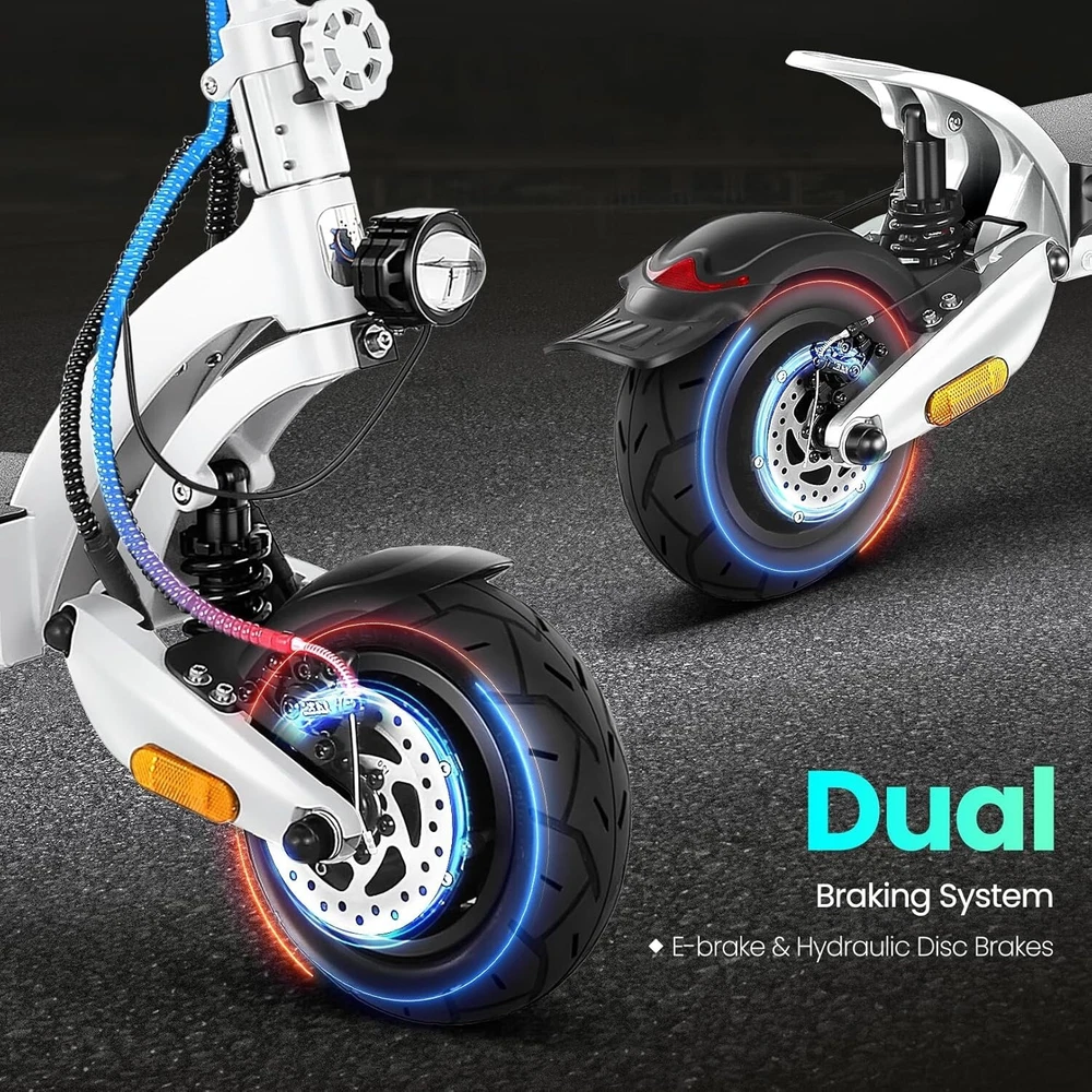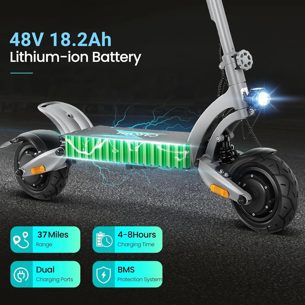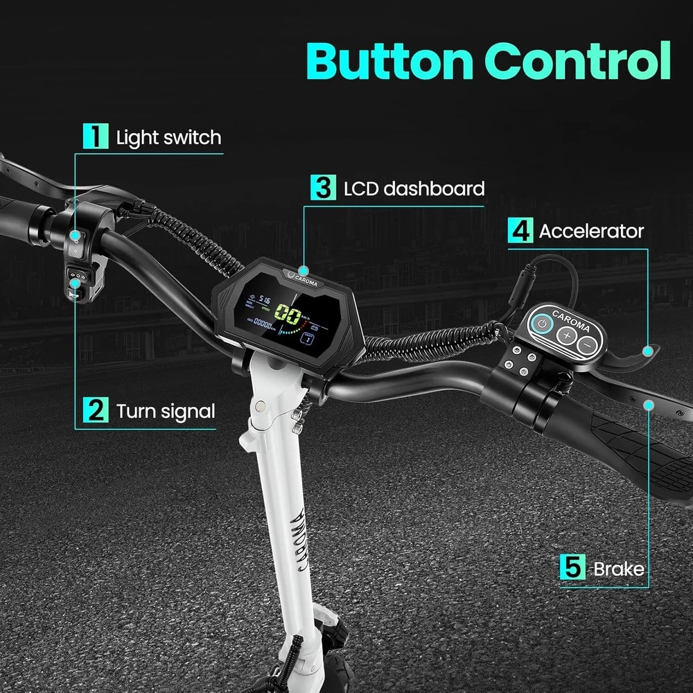 Product Description About this item High Performance Off Road Electric Scooter: The Caroma off-road electric scooter for adults is equipped with 2600W motor (rated 1600W) and an impressive top speed of 36 MPH. 2600W motor makes it easier for riders to conquer challenging terrains, effortlessly overtakes traffic, and navigate the city streets and 30° slope. Max load up to 330 lbs Superior Dual Shock Absorption: Front and rear shock-absorbing rocker arms and 8.5” fat off-road tires transform every ride into an enjoyable experience. No matter the road conditions, you'll glide smoothly and joyfully Long Life Battery: The high-capacity 48V 18.2Ah battery elevates your riding experience with an extraordinary range of up to 37 miles on a single charge. Dual charging ports reduce charging time from 8 hours to 4 hours. Whether you're off-road riding, commuting to work or city walking, this adult electric scooter ensures you reach your destination without worry Superior Dual Hydraulic Braking System: Safety is paramount. Front and rear full hydraulic disc brakes controlled by two EABS brake provide unparalleled stopping power in all conditions. Whether you're navigating crowded urban streets or navigating steep downhill slopes, you can rely on the e scooter for adults responsive brakes to keep you safe Advanced 360° Lighting System: Illuminate your path and make a statement with Caroma dual motor electric scooter for adults all-around lighting system. Powerful headlight pierces through the darkness, while two fisheye lights and side light add flair to your night-time rides. Taillight and two turn signals enhance visibility, making sure you stay safe and stand out during nighttime adventures Safety: The product is UL 2272 certified