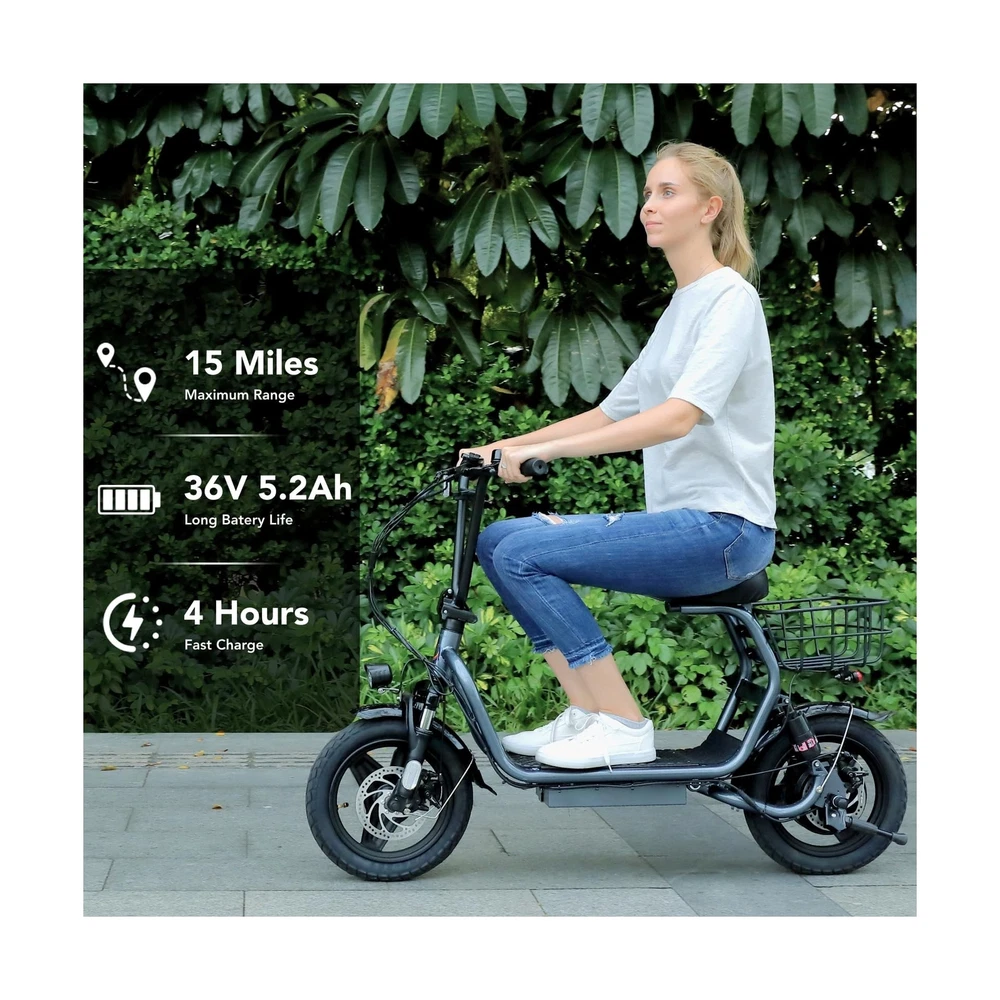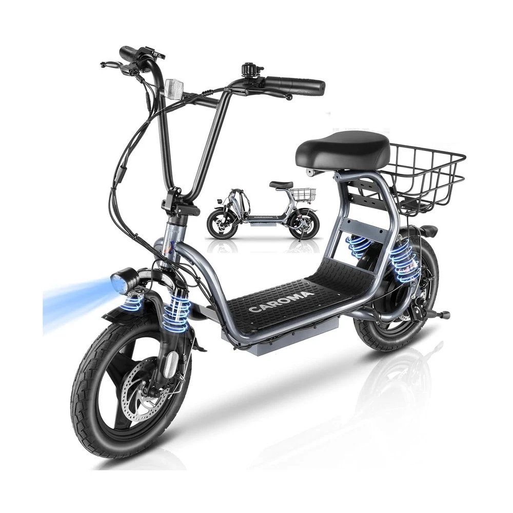 Caroma Peak 1200W Electric Scooter with Seat, 14" Fat Tire Electric Scooter Adults, 500Wh Battery up to 30 Miles&20MPH, Foldable Adult Electric Scooter for Commuting with Basket&Shock Absorbing Description Features: 560W Electric Scooter & 36V Battery350W powerful motor(peak to 560W) electric scooter has 15-mile range and max speed of 20 mph with 10% hill climbing capability. The large capacity 36V lithium battery with regenerative braking has a long range which is ideal for anyone who wants to commute short distance for school or office. Multiple Suspension and 14" Fat TiresThe e scooter comes with multiple shock absorptions (front, rear suspension, and seat shock) that significantly reduce shock, making your ride more comfortable and stable. The 14" large pneumatic tires have excellent grip, high elasticity, and wear resistance. Meanwhile, this adult scooter comes with a large, soft seat and an extra-wide non-slip deck to make long rides a breeze. Foldable & Safe Electric Scooter AdultsThis motorized scooter has folding design for increased portability and safety features like responsive and effective dual drum braking systems, bell, headlight and red tail-light, making it a portable electric scooter for commuting. It also has durable one-piece wheel hubs and a high-strength steel frame with a good weight capacity. The compact folded size makes it easy to store in car trunks and other tight spaces. (NOTE: Max load 300lbs) Smart Electric Scooter with Seat The Caroma P4 is an electric commuter scooter designed for adults. It has a basket above the rear wheels and can carry up to 30 pounds, making it ideal for quick errands and shopping. This electric scooter also features an LCD display that clearly shows the real-time power level of the ride. Meanwhile, the handle-mounted throttle allows you to control your riding speed easily and precisely. Easy Assembly & After Sales GuaranteeThe adult scooter comes mostly assembled with instructions and installation tools. We provide warranty for the e scooter. Caroma electric scooter has passed UL2272 certification, ensuring it meets stringent safety standards. Product Details: Brand: Caroma Color: Grey-Shock Absorption Age Range (Description): Adult Special Feature: Digital Display, Seat, Dual Braking System, Basket, Foldable Weight Limit: 300 Pounds Number of Wheels: 2 Model Name: P4 Electric Scooter Wheel Material: Rubber Frame Material: Aluminum Item Weight: 29.5 Kilograms Brand: Caroma Color: Grey-Shock Absorption Age Range (Description): Adult Special Feature: Digital Display, Seat, Dual Braking System, Basket, Foldable Weight Limit: 300 Pounds Number of Wheels: 2 Model Name: P4 Electric Scooter Wheel Material: Rubber Frame Material: Aluminum Item Weight: 29.5 Kilograms Handlebar Type: Fixed Handle Height: 51.2 Inches Wheel Size: 14 Inches Wheel Type: Pneumatic Suspension Type: Dual Suspension Grip Type: Ergonomic Brake Style: Front Braking, Rear Braking Warranty Type: Extended Charging Time: 4 Hours Recommended Uses For Product: Commuting Maximum Distance Range: 15 Miles Manufacturer: Guangzhou Plenty Bicycle Co.,Ltd Item Package Dimensions L x W x H: 50.79 x 26.38 x 9.06 inches Package Weight: 65 Pounds Brand Name: Caroma Warranty Description: 12 Months Warranty Material: Iron Suggested Users: unisex-adult Number of Items: 1 Part Number: P1 Electric Scooter Style: 560W 15Miles Classic Grey with seat Included Components: 1 x User Manual, 1 x Power Adaper, 1 x Electric Scooter, 1 x Toolkit Size: 129*23*67CM Date First Available: December 27, 2023 Delivery We Do Not Ship Outside of the Continental US. Return Policy All items qualify for returns within 30 days of receipt. Buyer is responsible for return shipping on any item that is not damaged. Feedback We take our reputation seriously, we buy and sell online, so we understand the value of trust. If you are unsatisfied with your order, please contact us and we will work with you to resolve it to your satisfaction.