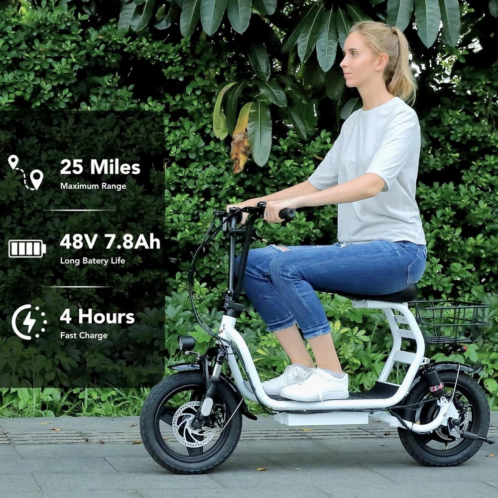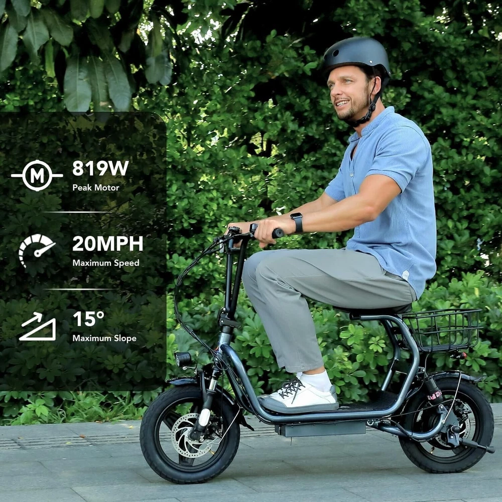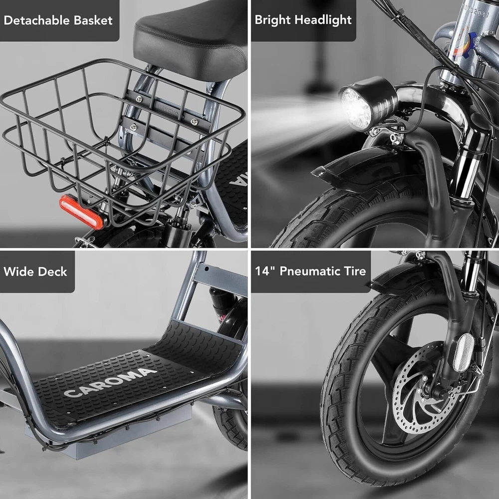 Description About this item 【819W Electric Scooter & 48V Battery】Caroma adult electric scooter comes with a 500W powerful motor(peak to 819W) that delivers max speeds of up to 20 mph and a 15% hill grade climbing ability. The large capacity 48V lithium battery with regenerative braking gives you a range of up to 25 miles, which is ideal for anyone who wants to commute short distance for school or office and give the adults an active lifestyle. 【Multiple Suspension and 14" Fat Tires】The e scooter comes with multiple shock absorptions (front, rear suspension, and seat shock) that significantly reduce shock, making your ride more comfortable and stable. The 14" large pneumatic tires have excellent grip, high elasticity, and wear resistance. Meanwhile, this adult scooter comes with a large, soft seat and an extra-wide non-slip deck to make long rides a breeze. 【Foldable & Safe Electric Scooter Adults】This motorized scooter has folding design for increased portability and safety features like responsive and effective dual drum braking systems, bell, headlight and red tail-light, making it a portable electric scooter for commuting. It also has durable one-piece wheel hubs and a high-strength steel frame with a good weight capacity. The compact folded size makes it easy to store in car trunks and other tight spaces. (NOTE: Max load 300lbs) 【Smart Electric Scooter with Seat】 The Caroma P1 is an electric commuter scooter designed for adults. It has a basket above the rear wheels and can carry up to 30 pounds, making it ideal for quick errands and shopping. This electric scooter also features an LCD display that clearly shows the real-time power level of the ride. Meanwhile, the handle-mounted throttle allows you to control your riding speed easily and precisely. 【Easy Assembly & After Sales Guarantee】The adult scooter comes mostly assembled with instructions and installation tools. We provide a 12-month warranty for the e scooter. Caroma electric scooter is UL certified. If you encounter any problems with the scooter, don't hesitate to contact us and we will offer you 100% satisfactory after-sales service. Payment 1 . We accept PayPal only. 2 . Payment should be completed within 4 (Four) days of auction closing. Or unpaid dispute will be filed for closing auction. 3 . Sales Tax of 9% will be applied for orders shipped within the state of California 4 . We will leave a positive feedback immediately after payment is received. We appreciate a positive feedback as much as you do. If for some reason there is any issue with the purchase, please contact us prior to leaving feedback, and we will be glad to work with you to have it resolved. Shipping 1 . We Ship to United States ONLY. 2 . Ship from two warehouses and only to eBay ADDRESS. Package handling only takes 1 business day at our warehouse, so please make sure entering correct payment and shipping information before checking out. Once your payment is completed, pls leave ebay note if the changes are needed before we send the product. 3 . Truck company: 3-8 business days. | USPS: 2-6 business days. | UPS/FEDEX: 3-5 business days. 4 . Lccal pick up is available. Warranty and Guarantee 1 . All of our items come with a 30-day return policy. We ensure all our items are new and in excellent condition prior to shipping. In the event that you receive the item that is not to the standards above, please contact us via e-Bay messages. All returns must be in new original condition as received and should be shipped with delivery confirmation 2 . We ONLY accept the return for original package. Please make sure that item has NO man-made sabotage. Used items will not be accepted for return. 3 . We reserve the right to refuse any returns for objective reasons. 4 . All NON-seller mistake returns for refund are subject to 20% re-stocking fee and buyer should pay for the round-trip shipping fee. (E.g. you bought wrong model or wrong color). Feadback 1 .Any problem after receiving our goods,please contact us before leaving Neutral/Negative feedback.We promise to help you solve it asap,and make you feel satisfactory absolutely. 2 . Please DO NOT leave negative feedback without asking for help. Please do not leave negative or neutral feedback if you haven't received item in 30 days, because we have mentioned the shipping time repeatedly.