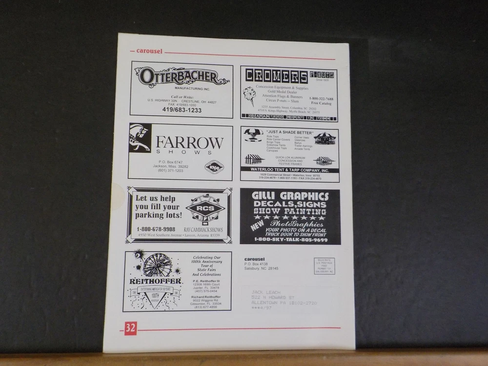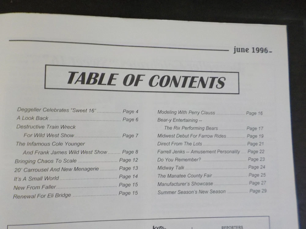 RailroadTreasures offers the following item: Carousel Vol 30 #6 June 1996 Farrow in Midwest Destructive Train Wreck F Carousel Vol 30 #6 June 1996 Farrow in Midwest No.1 in Exclusive Carnival News, Published Monthly. Contents Deggeller Celebrates "Sweet 16" Page 4 A Look BackPage 6 Destructive Train Wreck For Wild West ShowPage 7 The Infamous Cole Younger And Frank James Wild West ShowPage 8 Bringing Chaos To ScalePage 12 20' Carrousel And New MenageriePage 13 It's A Small WorldPage 14 New From Faller Page 15 Renewal For Eli BridgePage 15 Modeling With Perry ClaussPage 16 Bear-y Entertaining -- The Rix Performing BearsPage 17 Midwest Debut For Farrow RidesPage 19 Direct From The Lots Page 21 Farrell Jenks -- Amusement Personality Page 22 Do You Remember?Page 23 Midway TalkPage 24 The Manatee County Fair Page 25 Manufacturer's ShowcasePage 27 Summer Season's New SeasonPage 29 All pictures are of the actual item. There may be reflection from the lights in some photos. We try to take photos of any damage. If this is a railroad item, this material is obsolete and no longer in use by the railroad. Please email with questions. Publishers of Train Shed Cyclopedias and Stephans Railroad Directories. Large inventory of railroad books and magazines. Thank you for buying from us. Shipping charges US Shipments: When you add multiple items to your cart, the reduced shipping charges will automatically be calculated. For direct postage rates to other countries, send me an email. Shipping varies by weight. Terms and conditions All sales are final. Returns accepted if item is not as described. Contact us before making a return. No warranty is stated or implied. Please e-mail us with any questions before bidding or buying. Thanks for looking at our items.